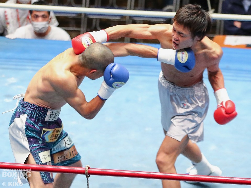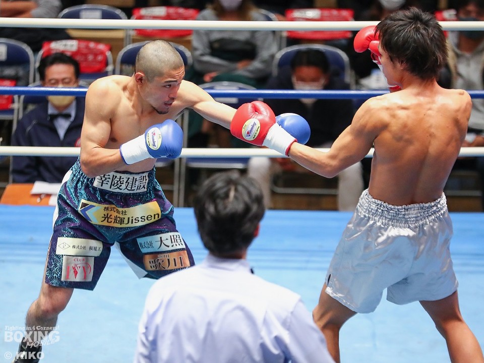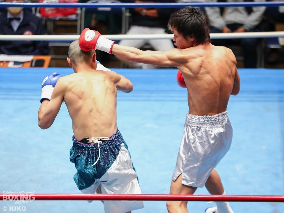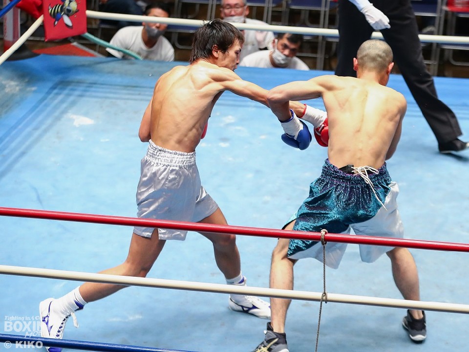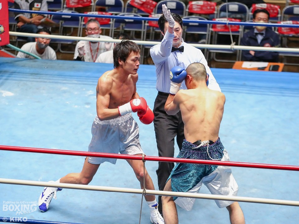 試合:長身の小西がジャブを丁寧に突きながら距離を作ると、打ち下ろしの右でダウンを先取。立ち上がった石崎は頭を振りながら前に出るが、小西はこのチャンスを逃さずワンツー連打で攻勢。右ストレートで顔を弾いたところでレフェリーが割って入った。