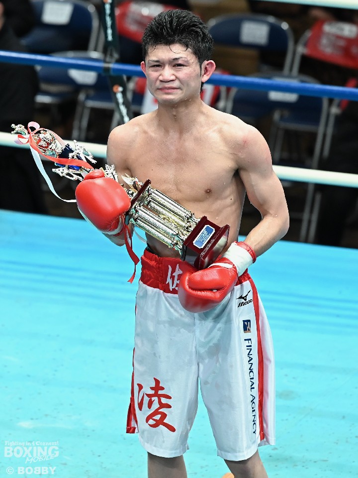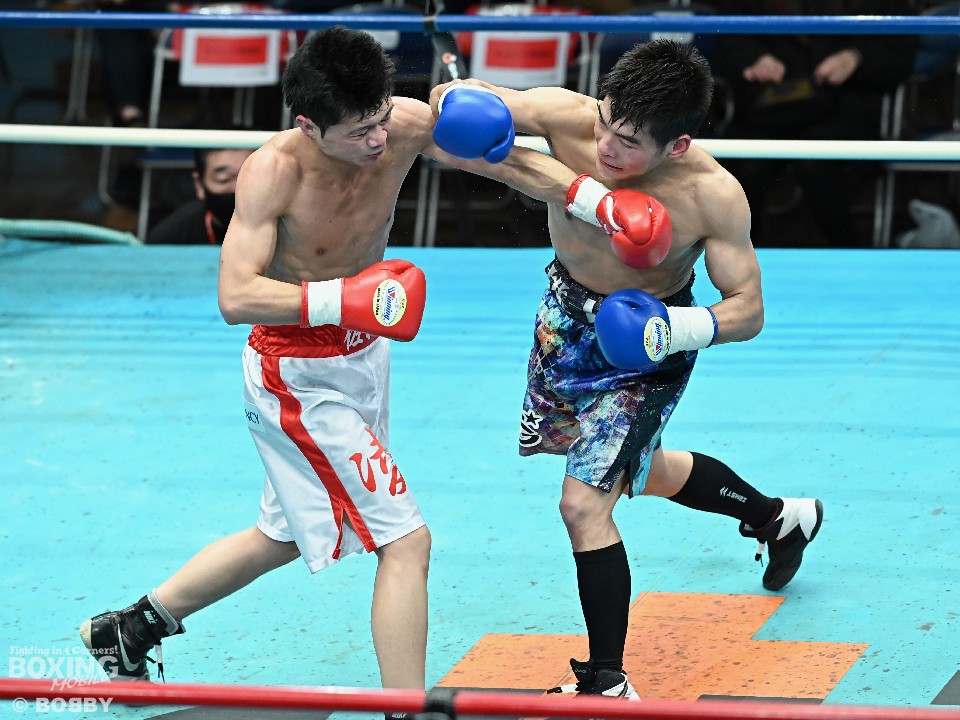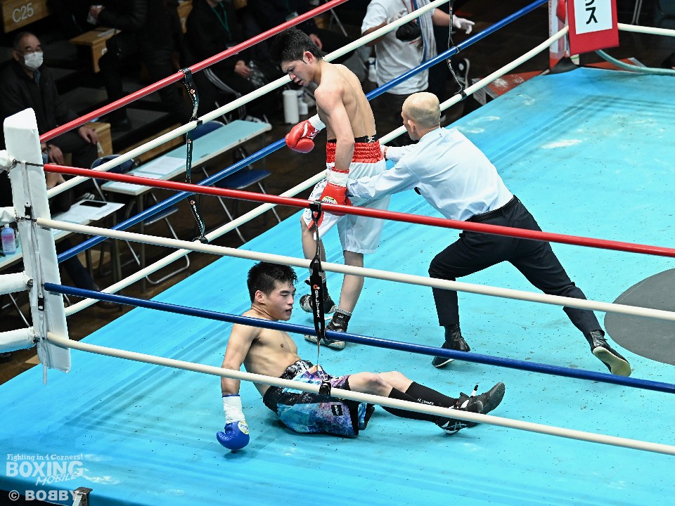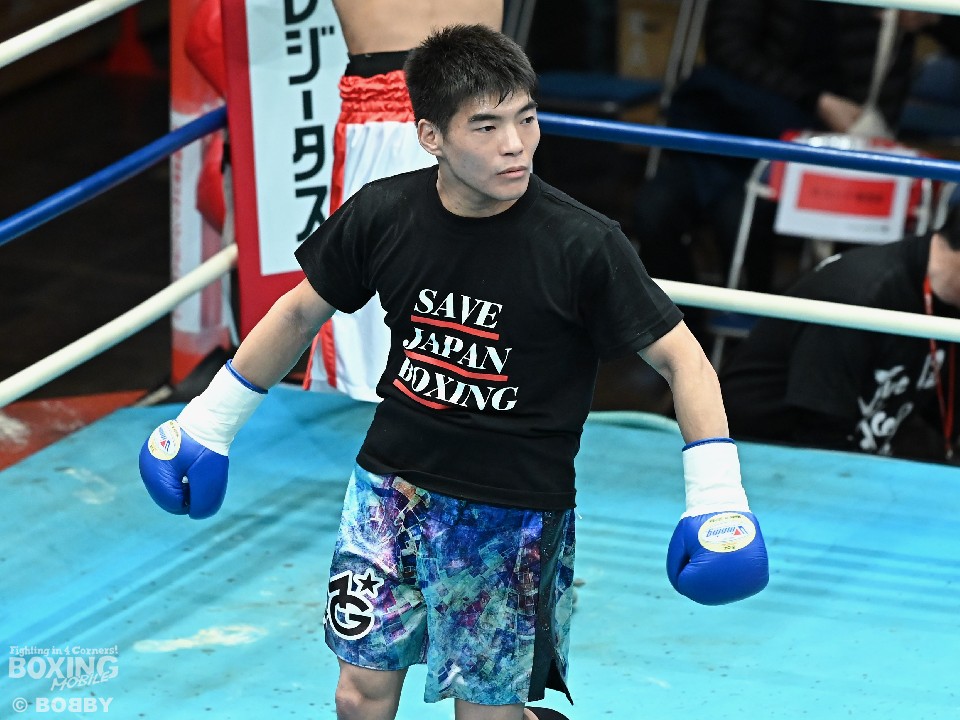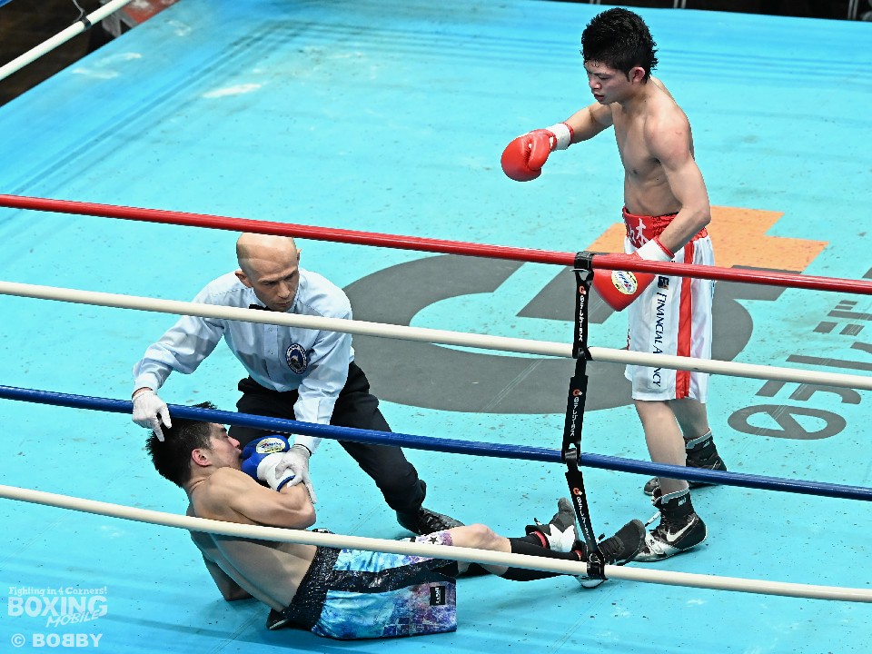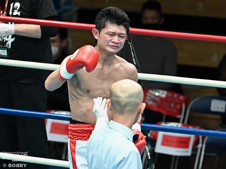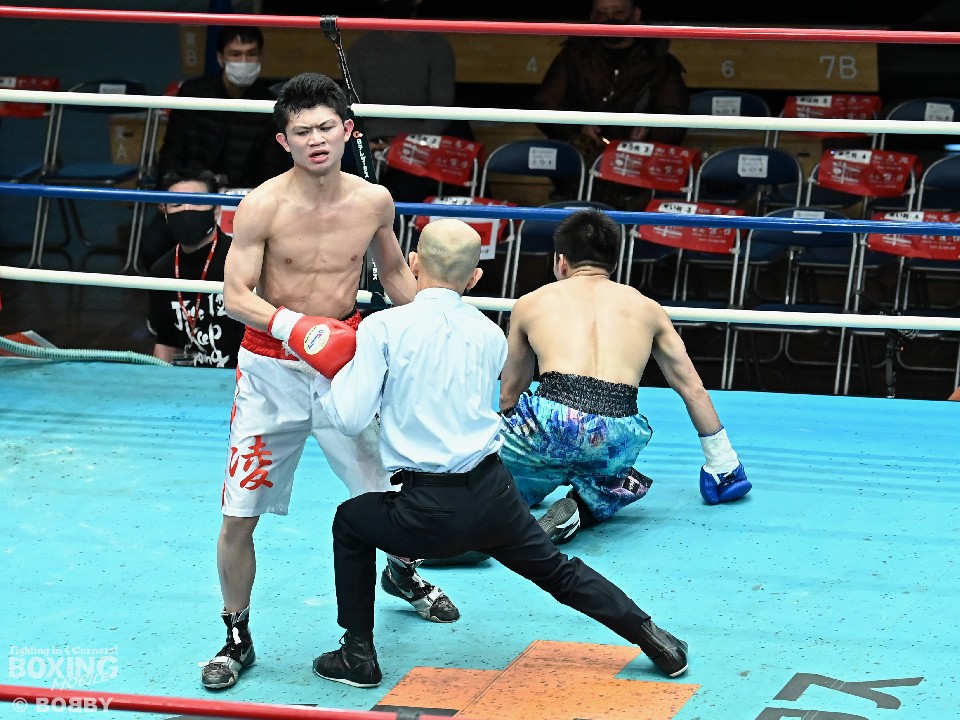 試合:開始から平井がグイグイと前に出て左右フックで仕掛けるのに対し、身長で9cm上回るサウスポー佐々木は、足を使いながらワンツーを返していたが、ラウンド中盤から真っ向から打ち合いに応じて左ストレートで顔を弾いた。2回、佐々木はスイッチしながら的確にパンチを当てていくと、左カウンターから連打でダウンを先取。再開後は右構えから左右をまとめてダウンを追加した。ポイントを挽回したい平井は3回、手数を落とさず積極的な攻撃で反撃。4回、佐々木は相手のパンチをダッキングでかわしながら右フックを好打。着実にダメージを与えていくと、ラウンド終了間際に右フックでふらつかせて連打で3度目のダウンを奪うとレフェリーが試合をストップした。佐々木が新人王3度目の挑戦で東日本新人王に輝いた。