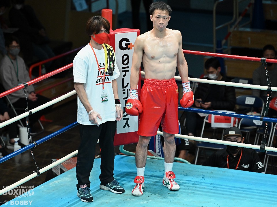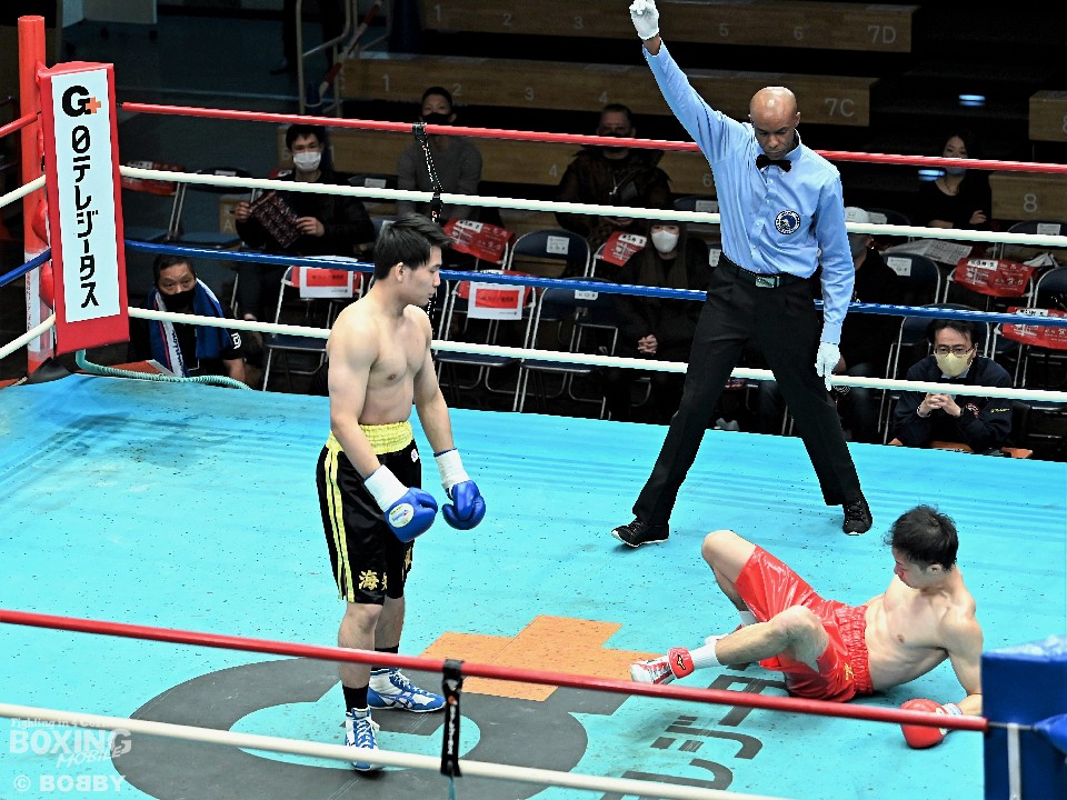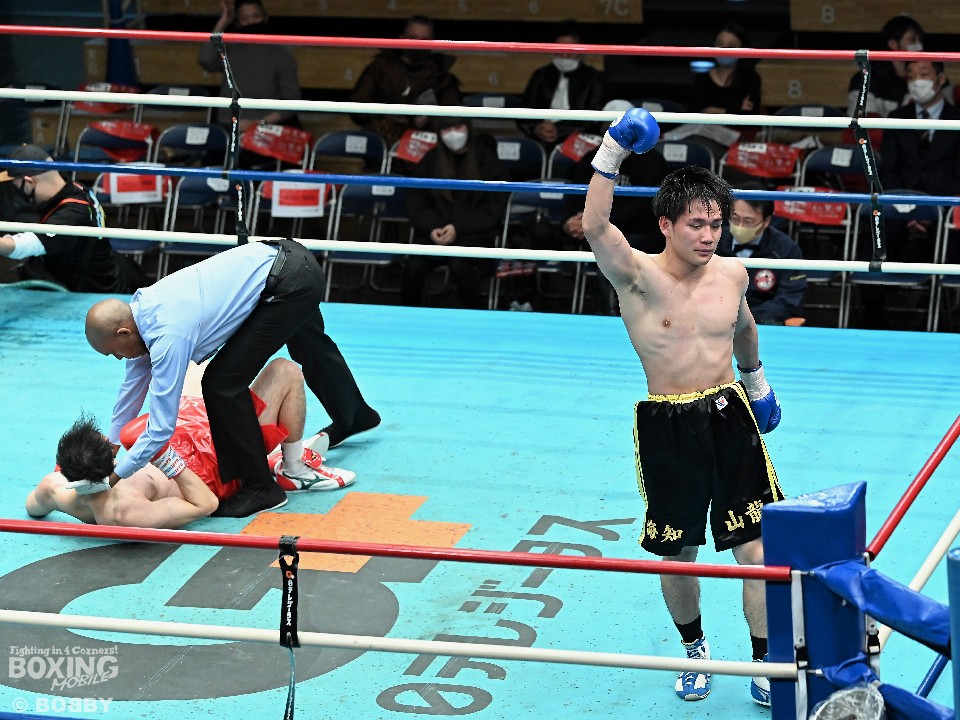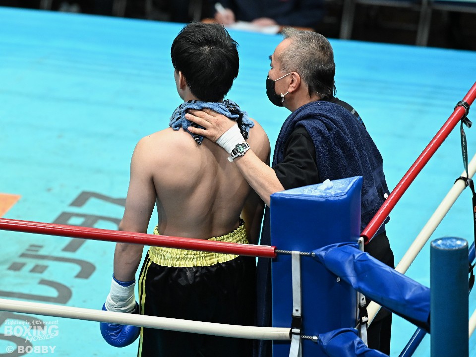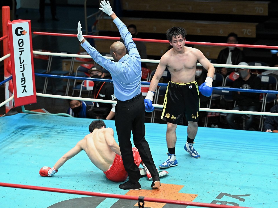 試合:サウスポー齊藤がジャブで距離を探りながら丁寧に試合を組み立てる。対する山﨑は懐に飛び込んで右フックで応戦すると、右フックをねじ込みダウンを奪った。2回以降は、接近戦でパンチを交換したが山﨑のショートパンチが上回った。3回、山﨑は力強い右フックで2度目のダウンを奪うとレフェリーはノーカウントで試合を止めた。