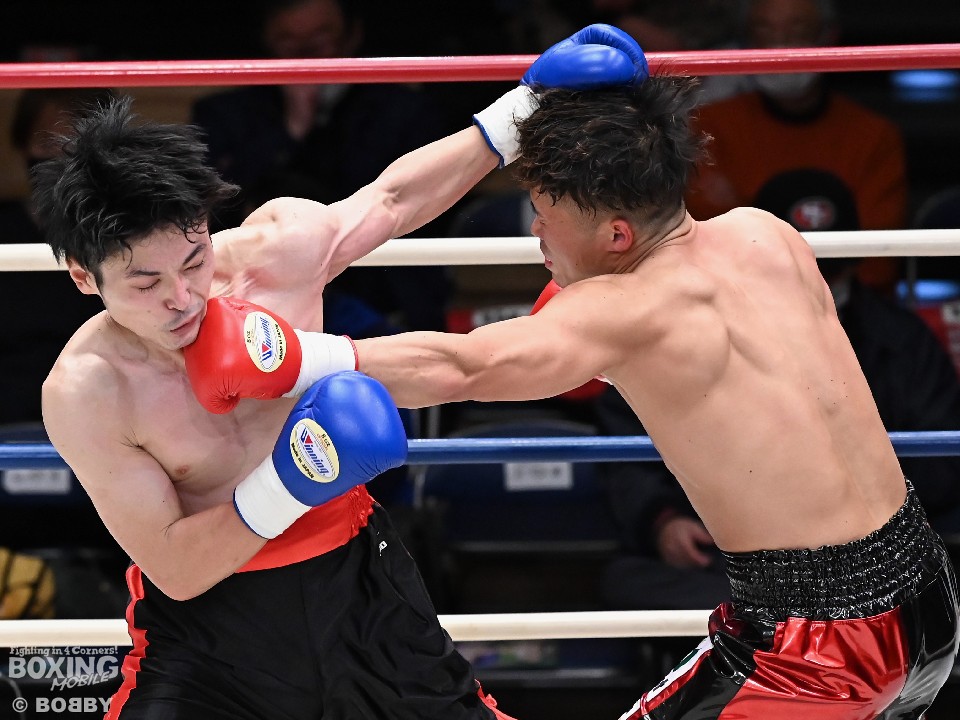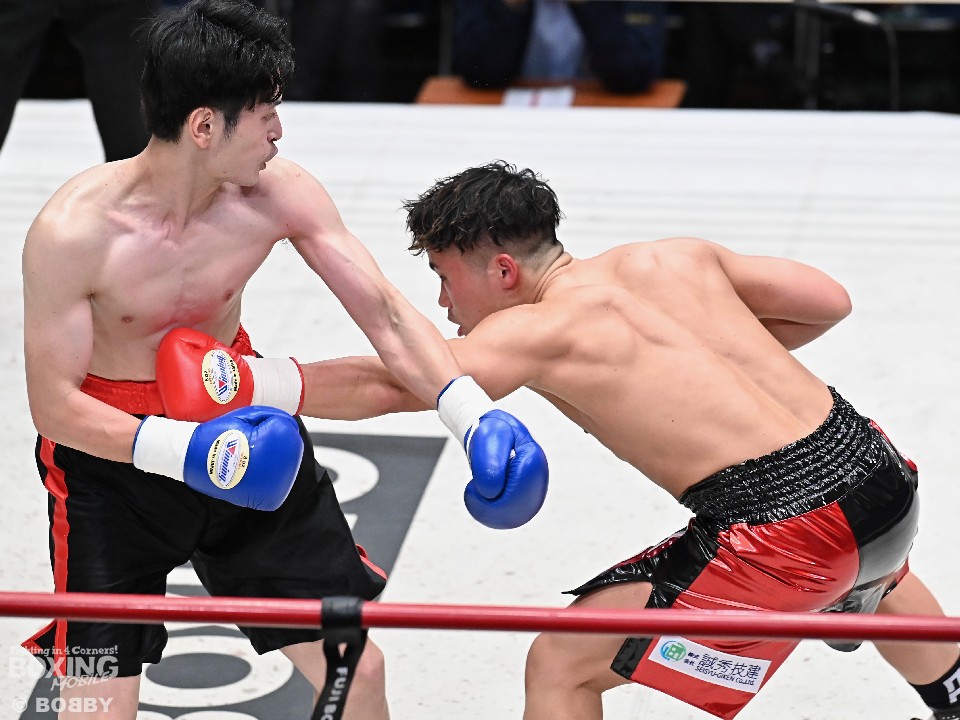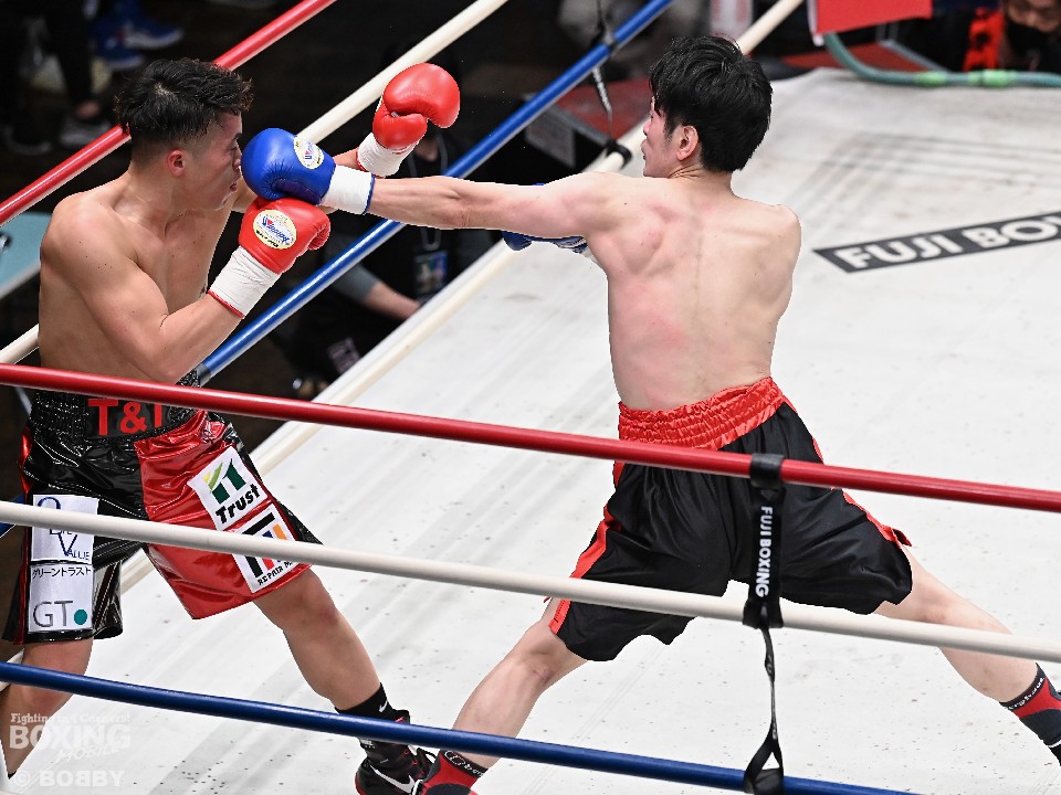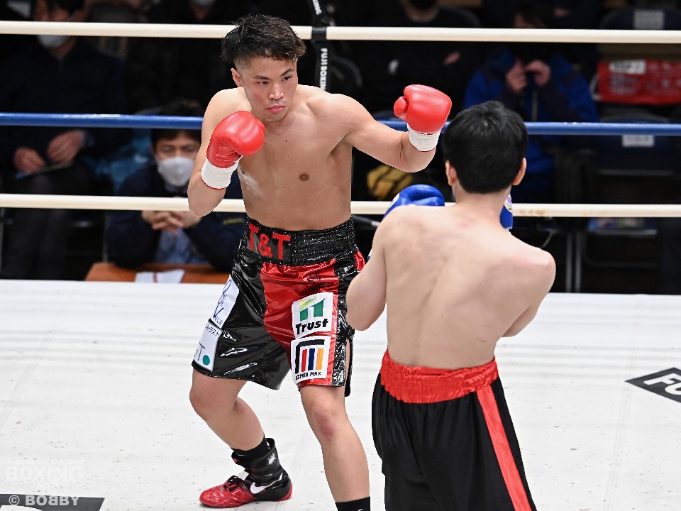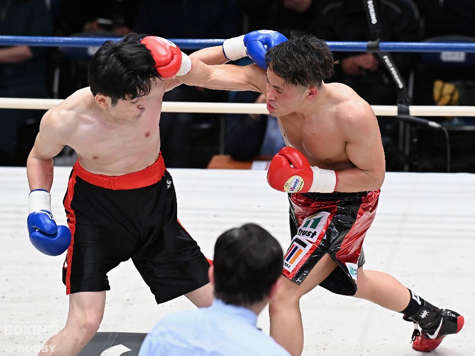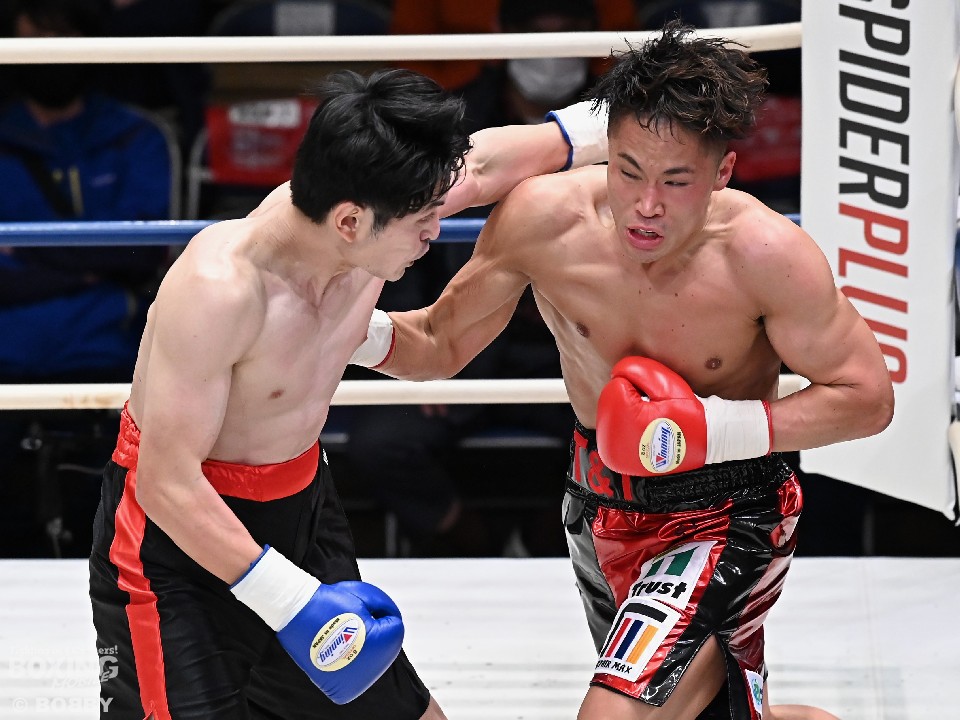 試合:熊澤が軽く左を出しながらジリジリと距離を詰めるのに対し、坂久保はほとんど手を出さず慎重な試合運びを見せる。大きなアクションがないまま3回へ。坂久保は右オーバーハンドを繰り出すが、熊澤はバックステップでかわすと単発の右ストレートを当てた。4回、坂久保は右ロングフックで仕掛けるが、熊澤は距離をキープしながら右で迎え撃った。