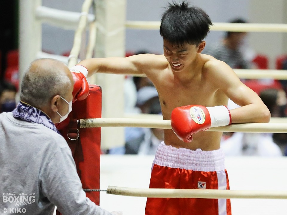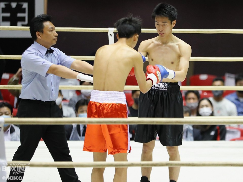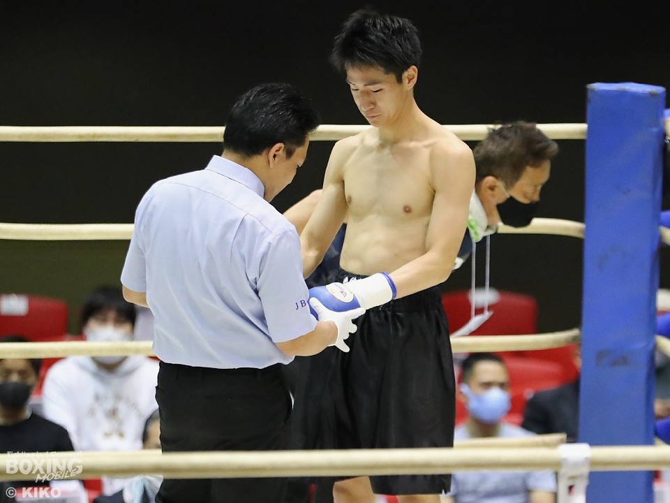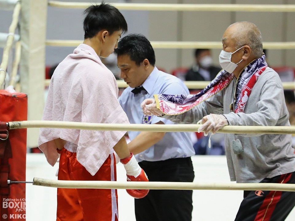 試合:長身オーソドックスの中原がジャブで距離を測るとワンツーをヒット。サウスポー上田は下がりながら様子を伺うが、中原は積極的な攻撃を仕掛けると右ストレートでガクッと腰を沈めさせて攻勢。チャンスと見るや距離を詰めて右ストレートをテンプルに決めてダウンを演出。立ち上がろうとした上田だったがセコンドが棄権の意思表示を示した。