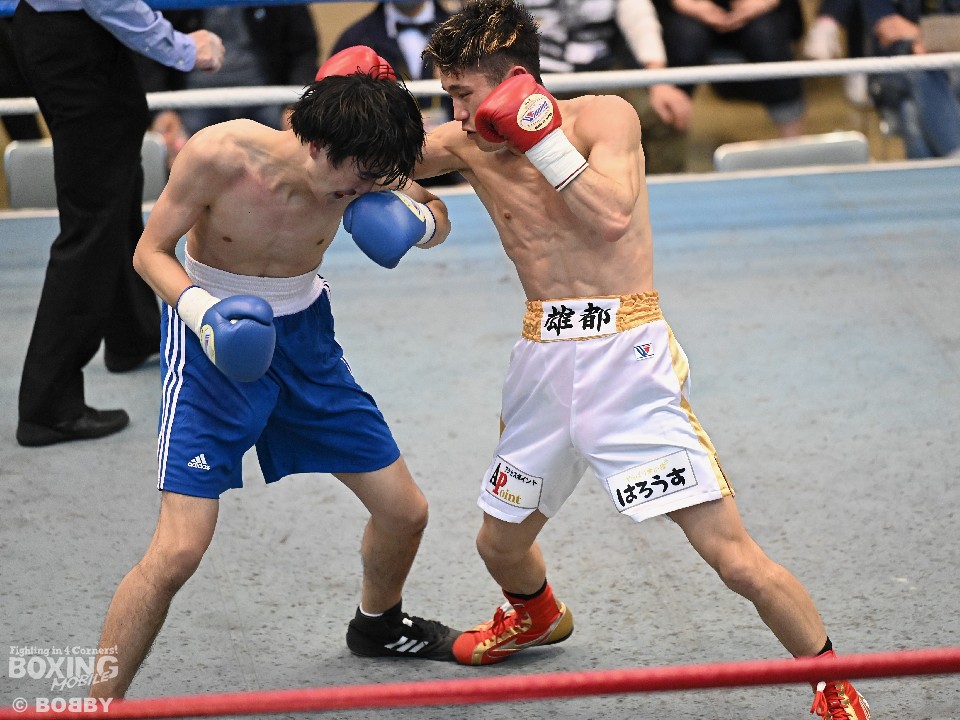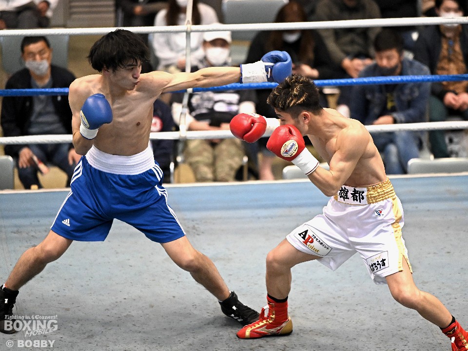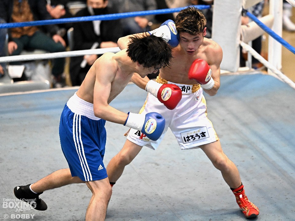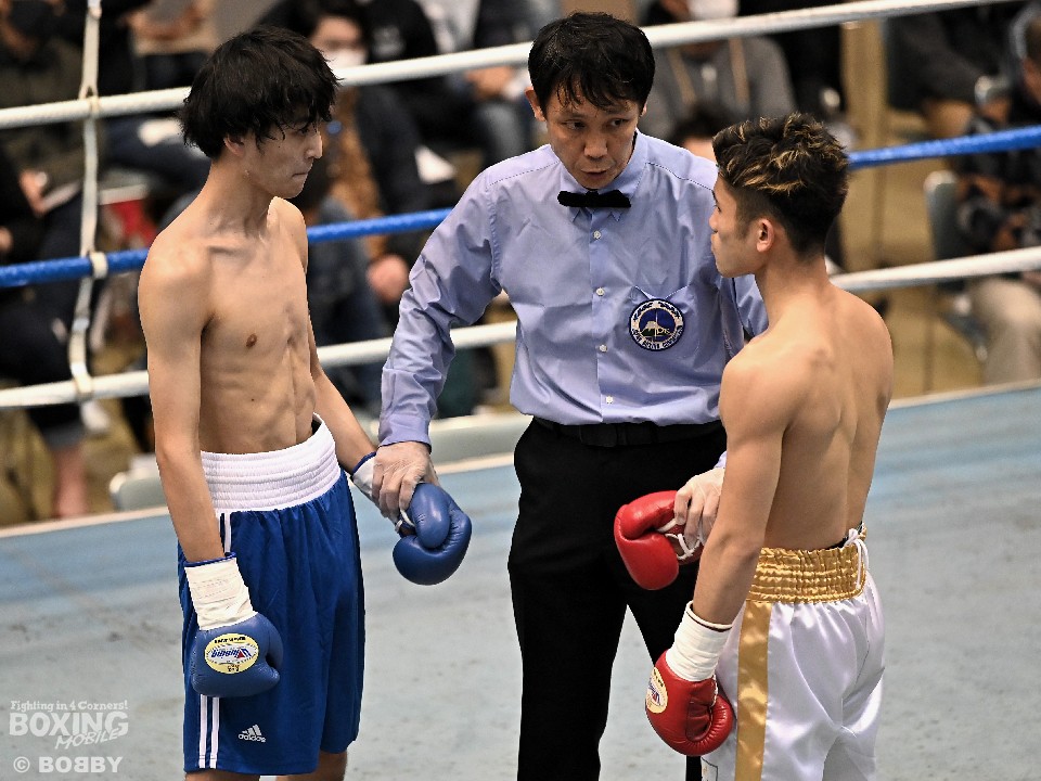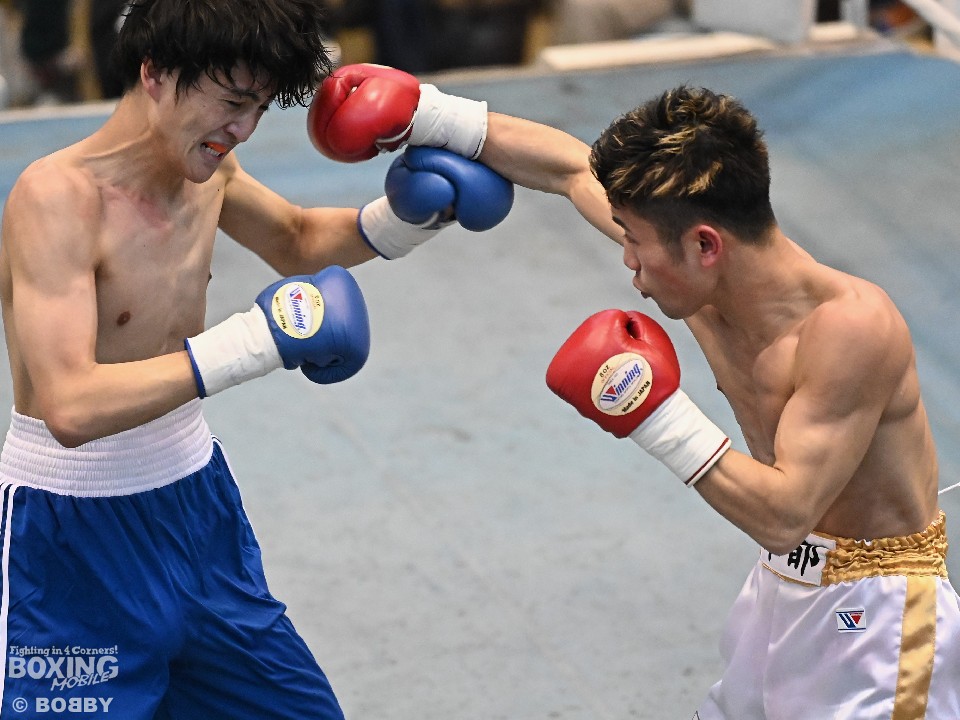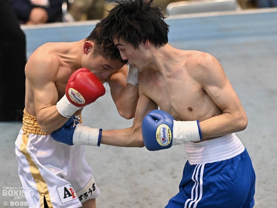 試合:サウスポー大城が頭を振りながらワンツーを繰り出すが、大久保はボディにコツコツとパンチを当てて体力を削りに行く。2回も大久保は、ボディ攻撃を中心に組み立てるとワンツーをヒット。大城も押し負けずショートパンチを返した。3回、接近戦となるが、大城の回転力が勝ると、グイグイと攻め立てポイントを加点。最終4回、両者とも手数を落とさず歯を食いしばりながらパンチを出して譲らなかった。