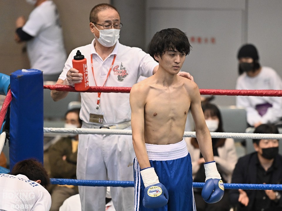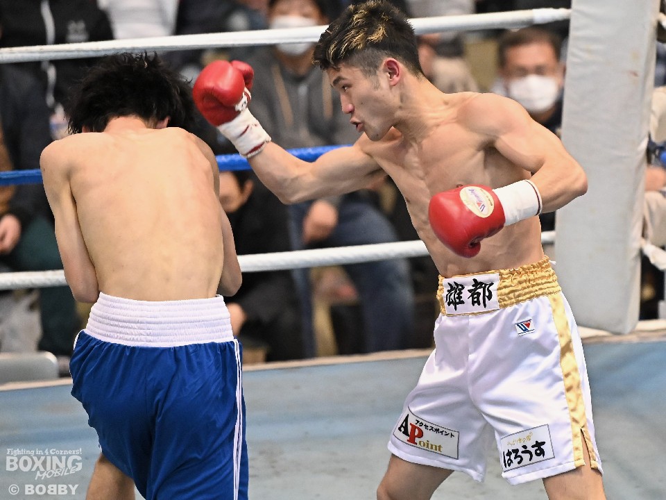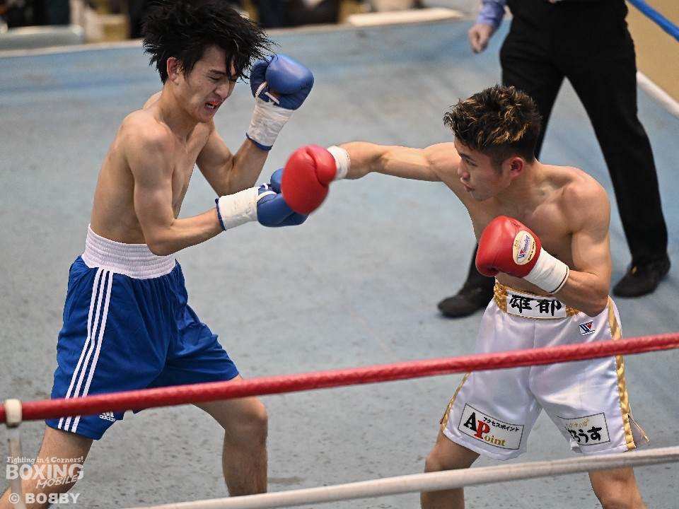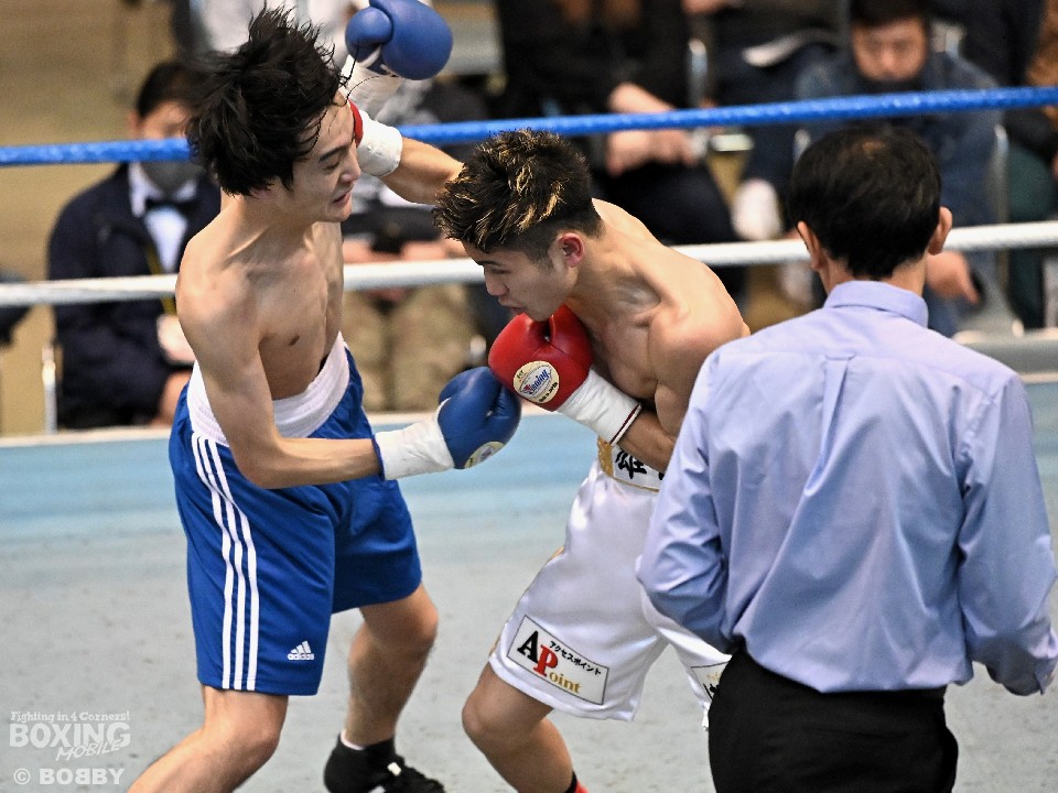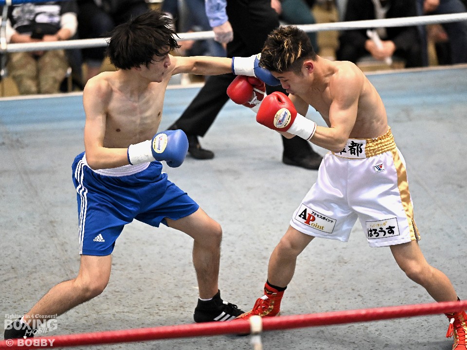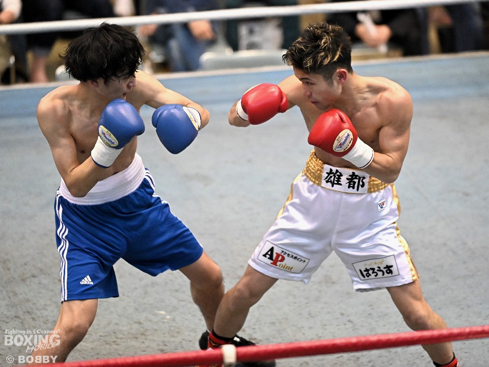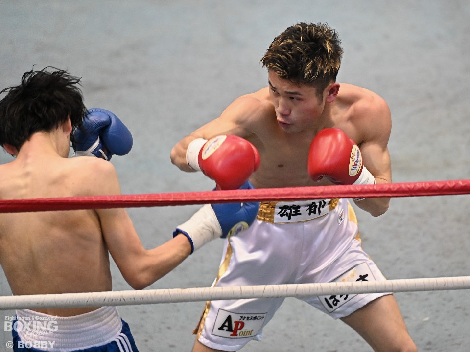 試合:サウスポー大城が頭を振りながらワンツーを繰り出すが、大久保はボディにコツコツとパンチを当てて体力を削りに行く。2回も大久保は、ボディ攻撃を中心に組み立てるとワンツーをヒット。大城も押し負けずショートパンチを返した。3回、接近戦となるが、大城の回転力が勝ると、グイグイと攻め立てポイントを加点。最終4回、両者とも手数を落とさず歯を食いしばりながらパンチを出して譲らなかった。