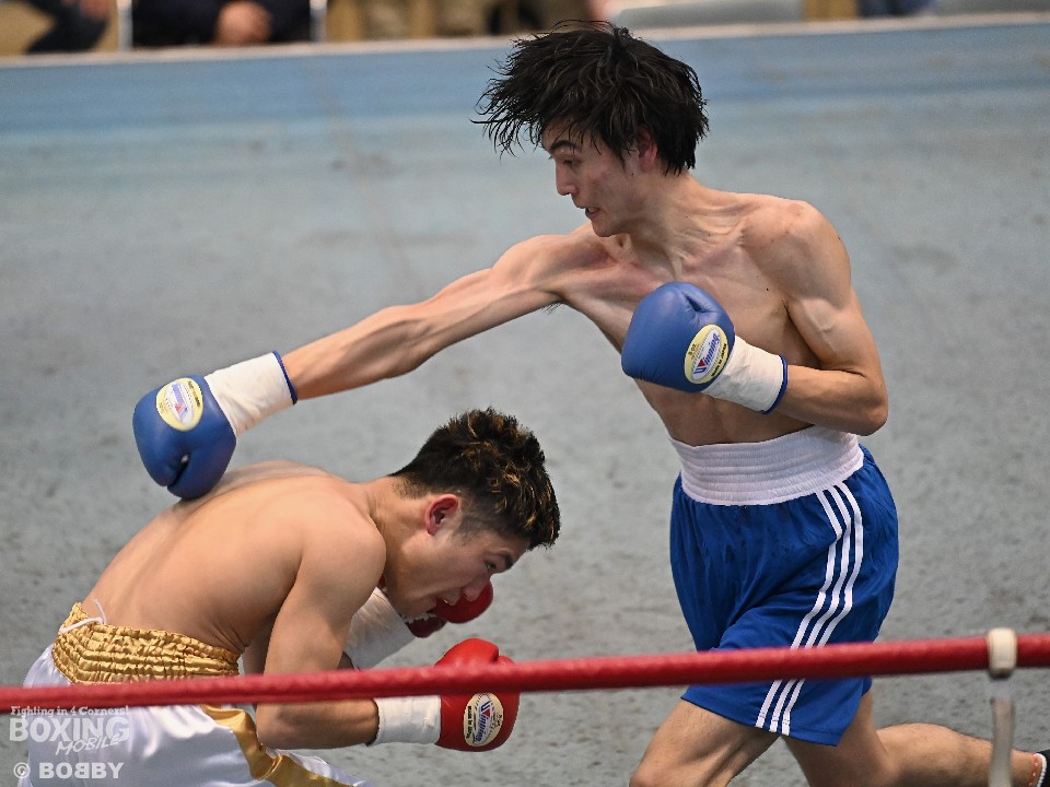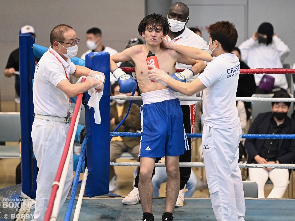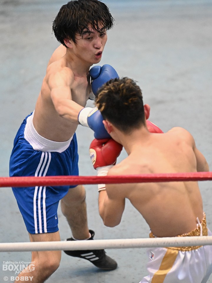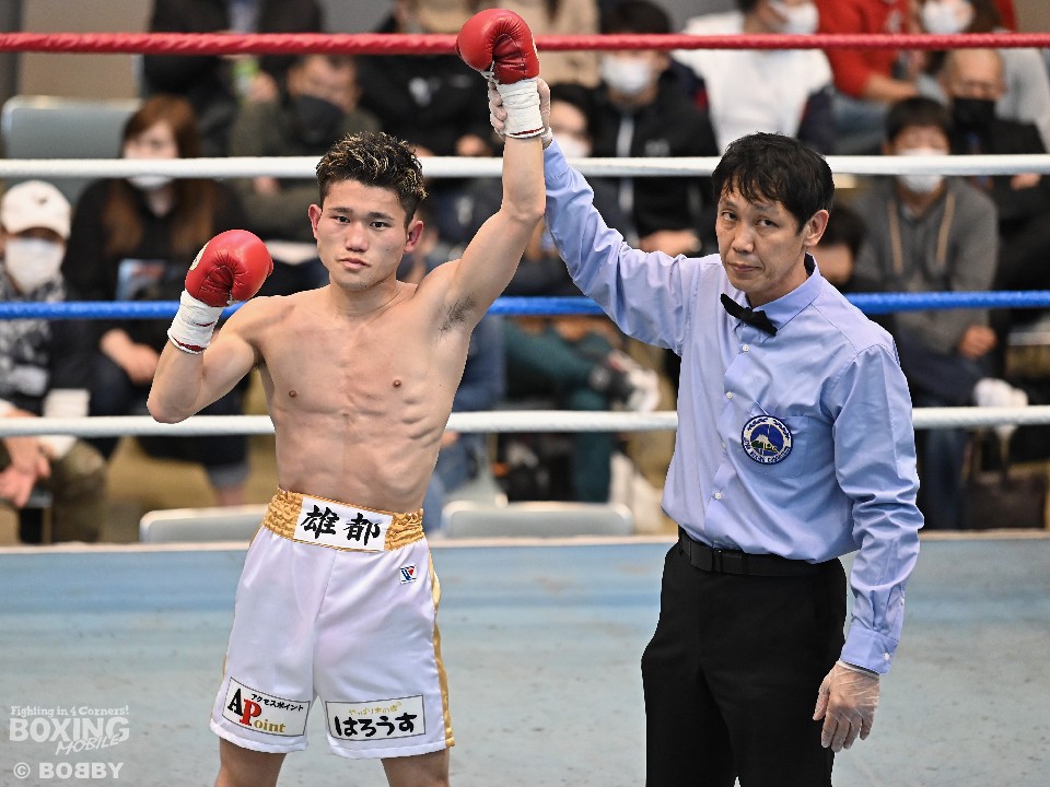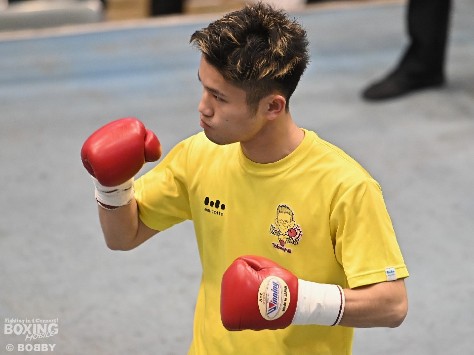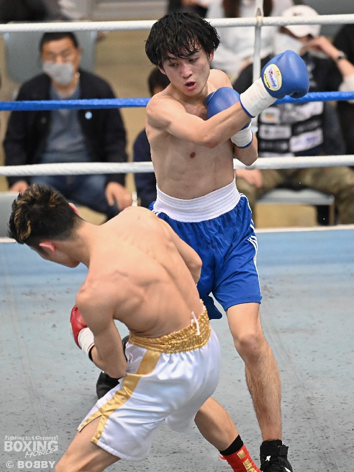 試合:サウスポー大城が頭を振りながらワンツーを繰り出すが、大久保はボディにコツコツとパンチを当てて体力を削りに行く。2回も大久保は、ボディ攻撃を中心に組み立てるとワンツーをヒット。大城も押し負けずショートパンチを返した。3回、接近戦となるが、大城の回転力が勝ると、グイグイと攻め立てポイントを加点。最終4回、両者とも手数を落とさず歯を食いしばりながらパンチを出して譲らなかった。
