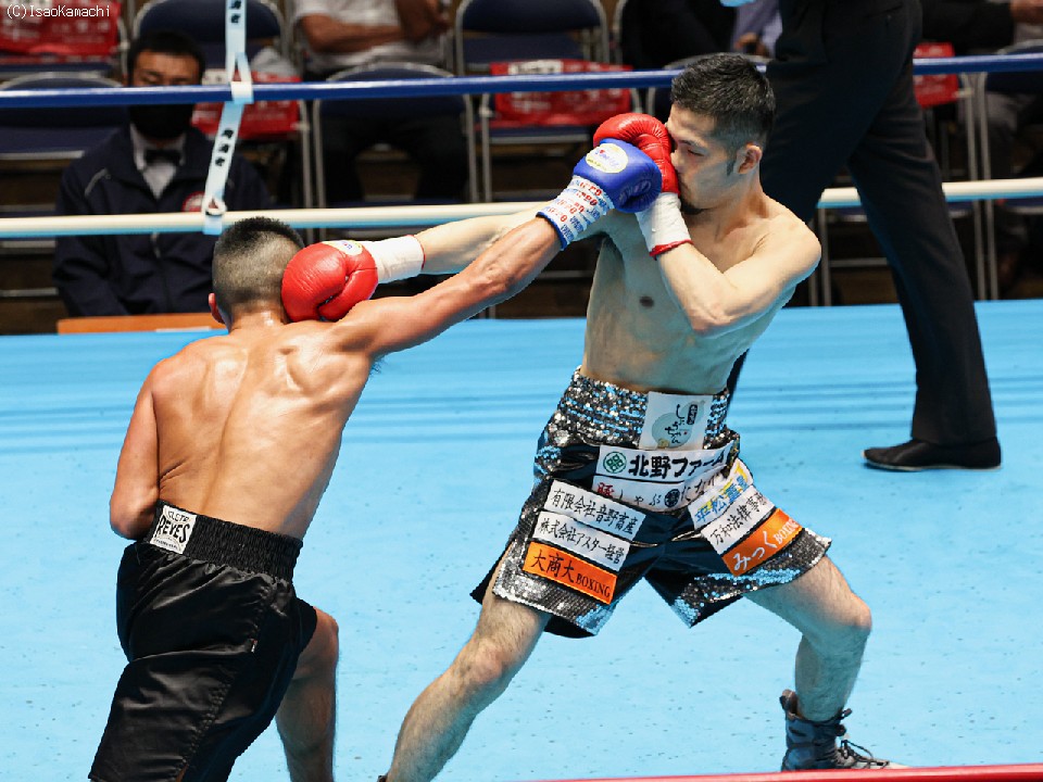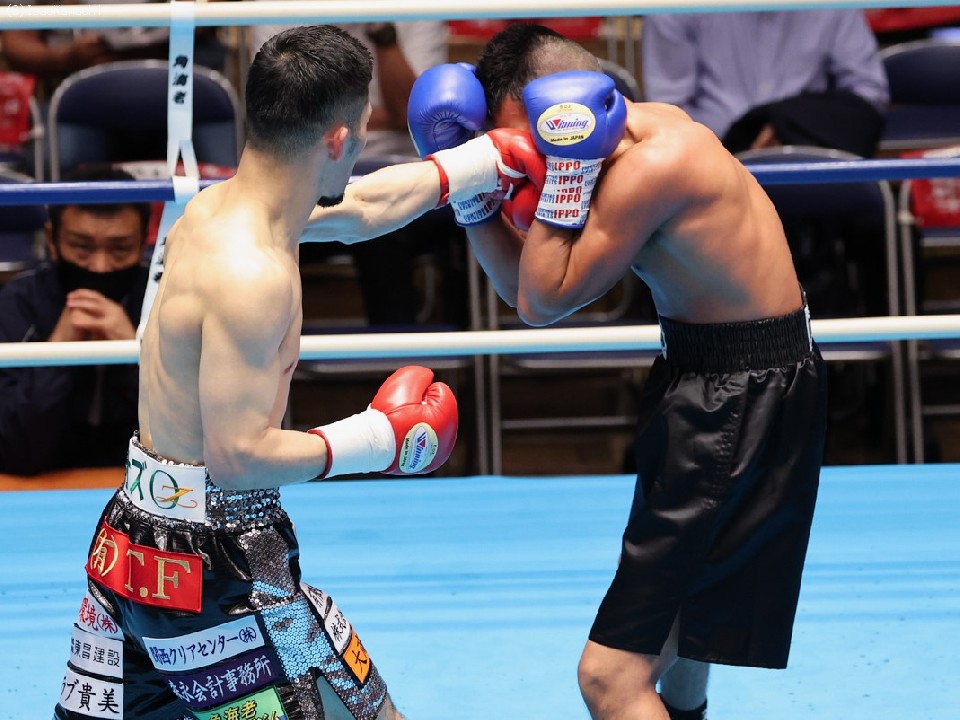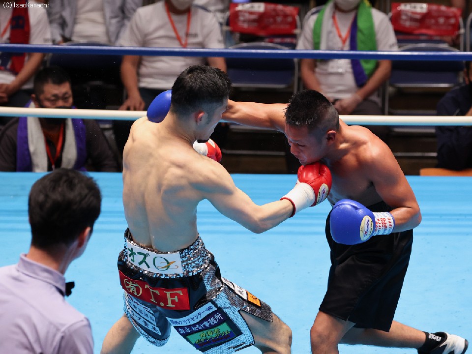試合:サウスポー池側が前の手でコントロールしながら、前に出てくる相手に左ストレートをヒット。二瓶は右ストレートを伸ばすが、距離が遠く思い通りの展開を作れない。ペースを握った池側は、距離をキープしながら左ストレートを好打しポイントを加点。二瓶の左目上を切り裂いた。3回以降も池側はヒット&アウェーを繰り返しながら試合巧者ぶりを発揮。流れを変えたい二瓶は、右から切り込むが、軽快なフットワークを駆使する池側を捉えることができず失点した。二瓶の攻撃を上手く捌いた池側が完勝した。