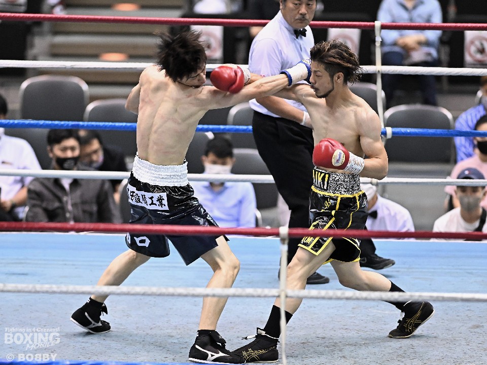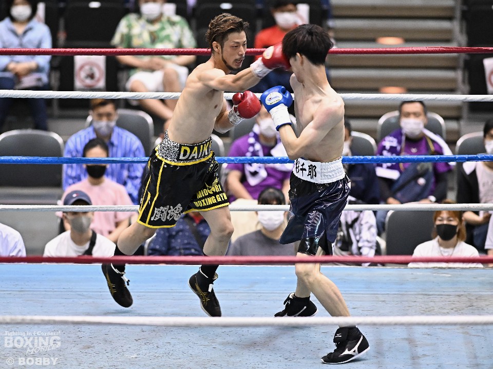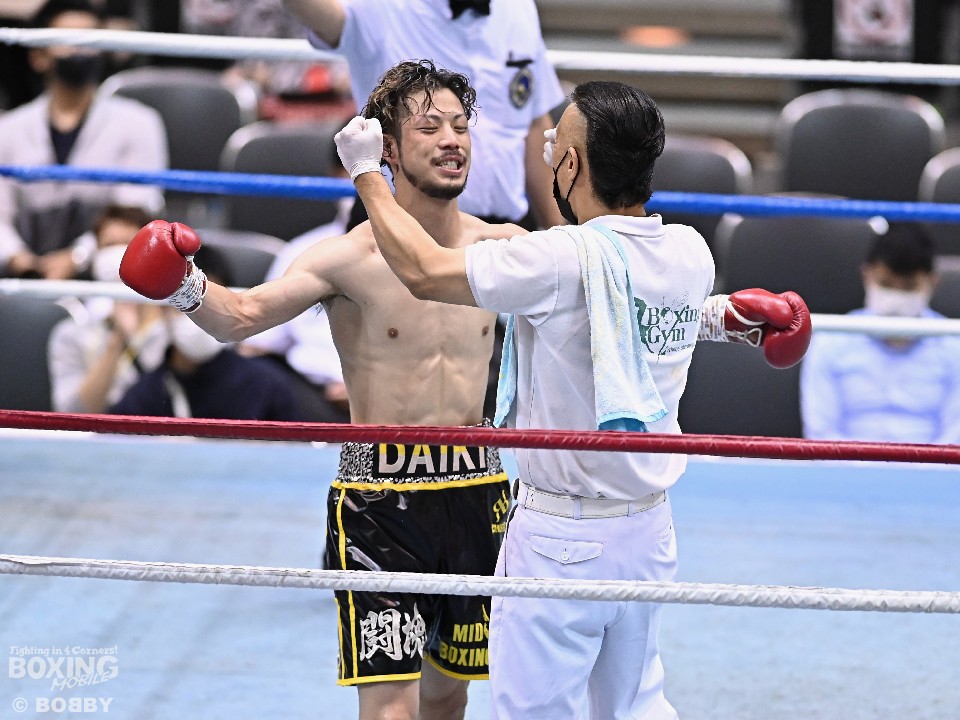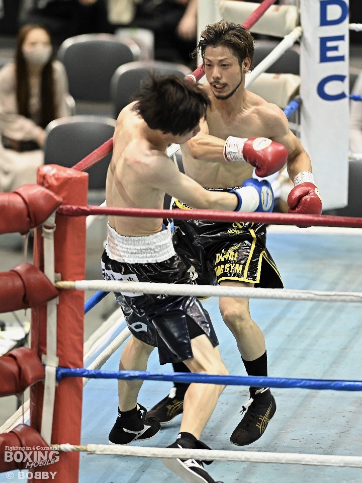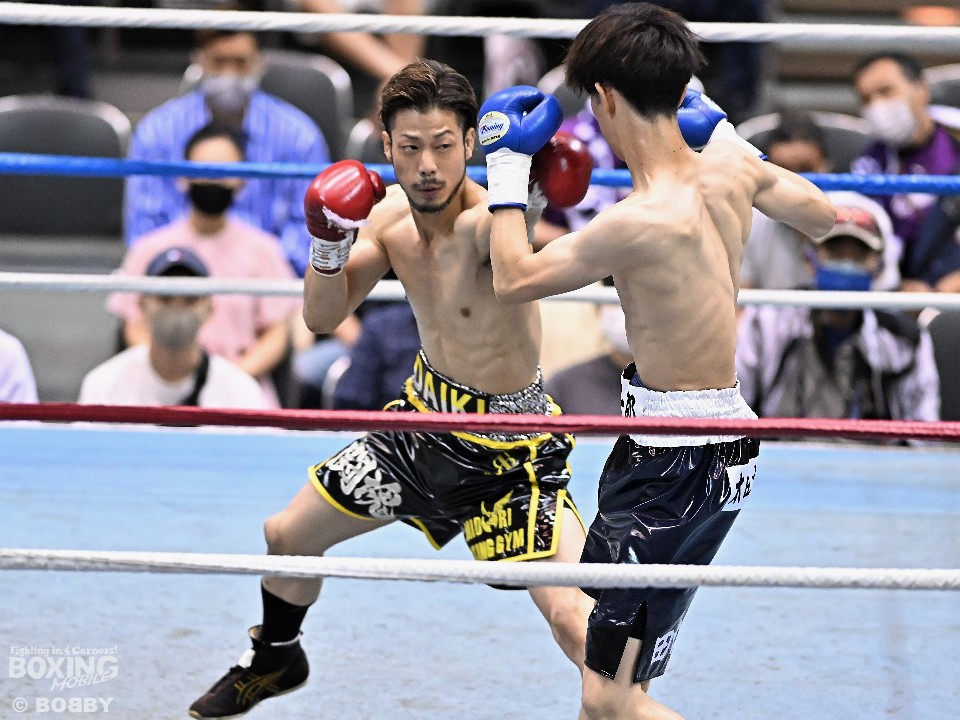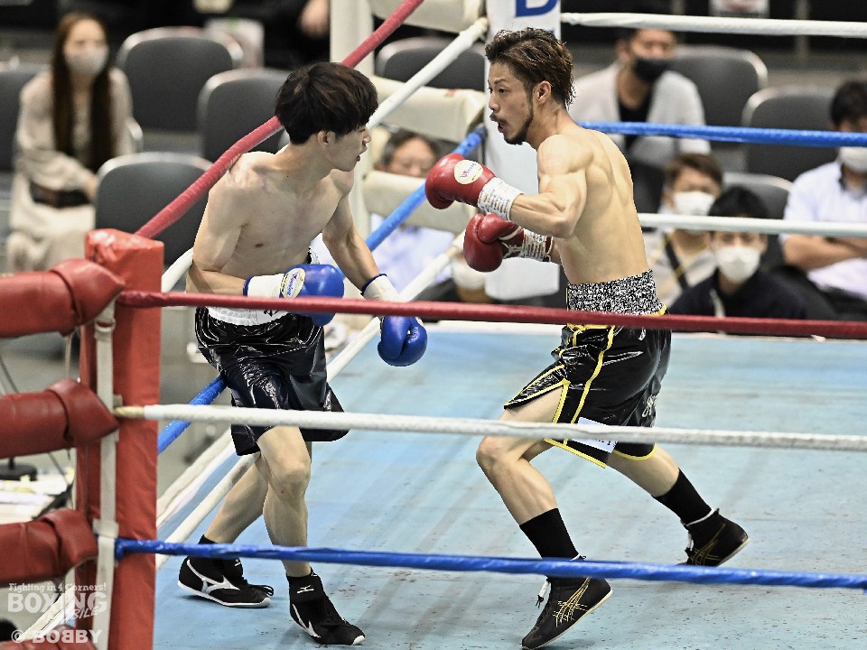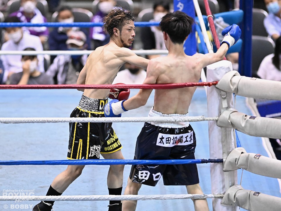 試合:開始から木附が右ストレートで後退させると、打ち終わりにワンツーを好打。178㎝のサウスポー太田も左ストレートを狙いチャンスを伺った。2回、木附は右フックで腰を沈めて連打を繰り出すが、力みが見られフィニッシュにつなげられず。それでも攻撃の手を緩めずグイグイと攻め立てた。3回、太田はワンツーでグラつかせると連打で攻勢。体力の消耗が激しい木附に迫り猛追した。勝負の4回。前に出たのは木附の方。右ストレートで顔をのけぞらせると積極的な攻撃でジャッジに攻勢をアピールした。