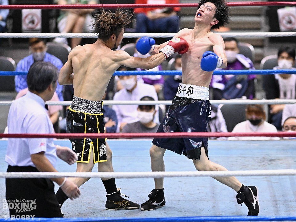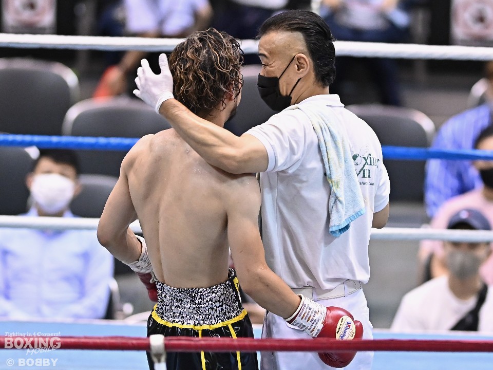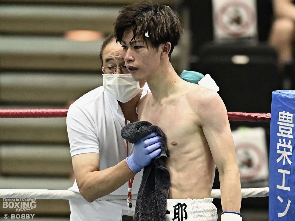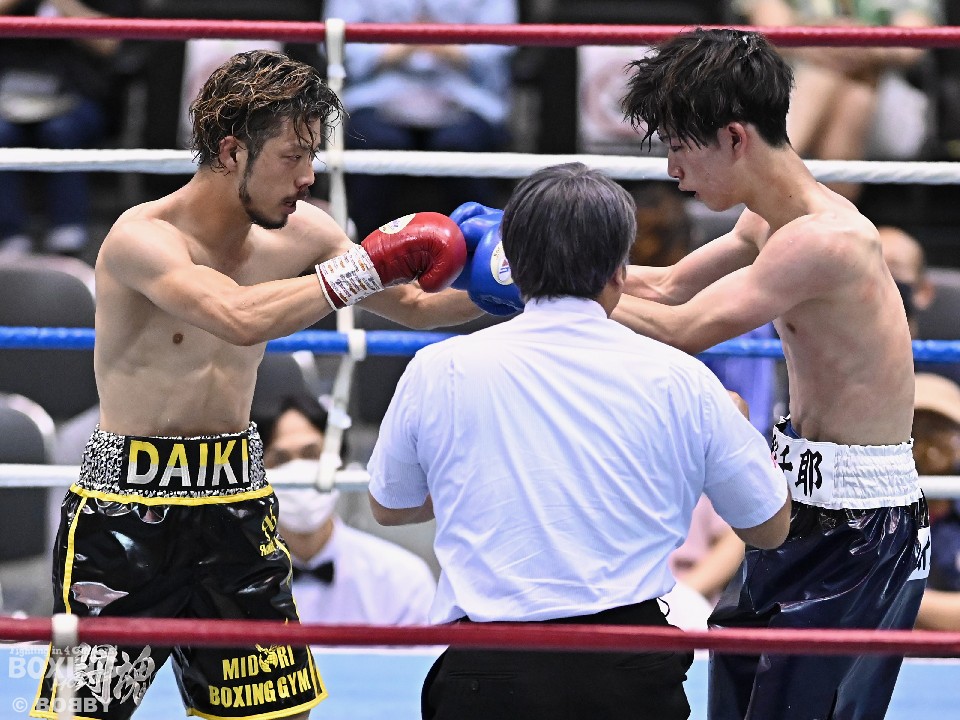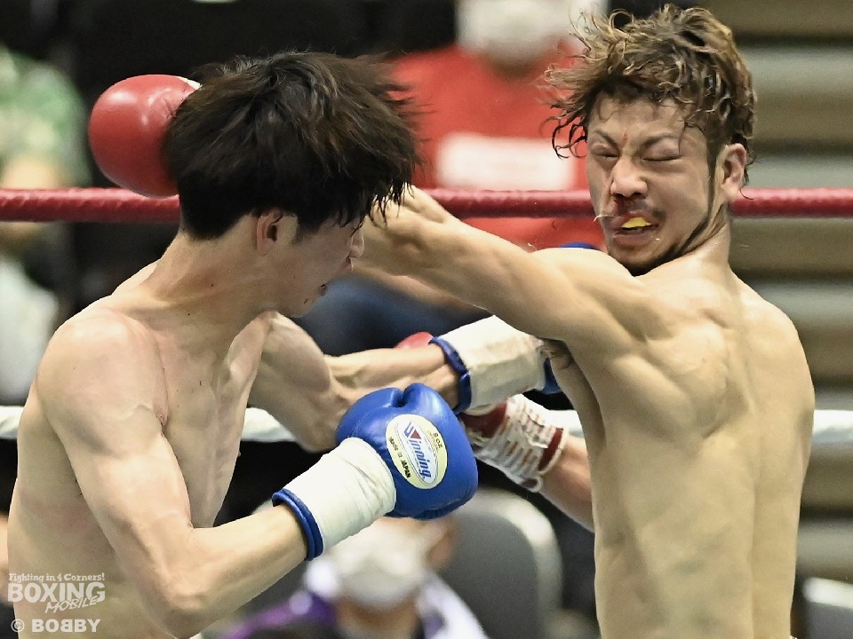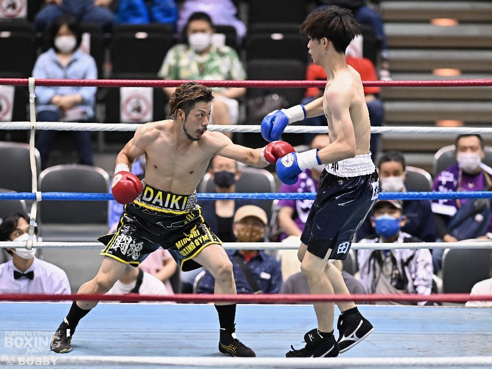 試合:開始から木附が右ストレートで後退させると、打ち終わりにワンツーを好打。178㎝のサウスポー太田も左ストレートを狙いチャンスを伺った。2回、木附は右フックで腰を沈めて連打を繰り出すが、力みが見られフィニッシュにつなげられず。それでも攻撃の手を緩めずグイグイと攻め立てた。3回、太田はワンツーでグラつかせると連打で攻勢。体力の消耗が激しい木附に迫り猛追した。勝負の4回。前に出たのは木附の方。右ストレートで顔をのけぞらせると積極的な攻撃でジャッジに攻勢をアピールした。