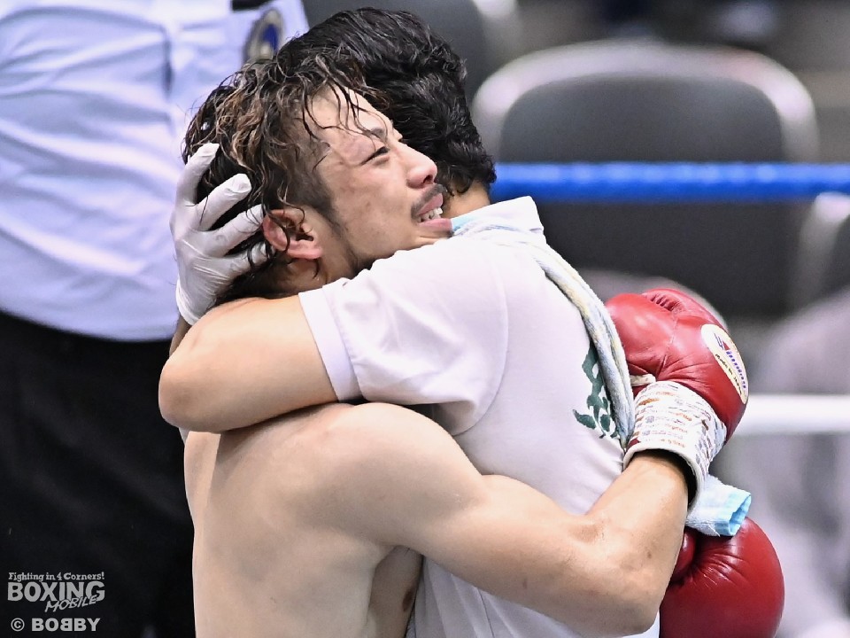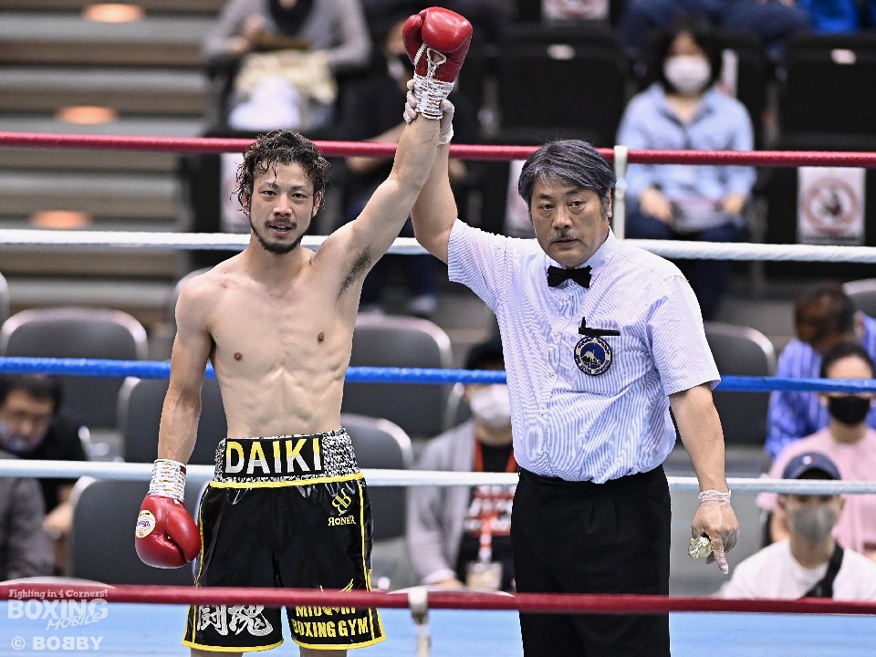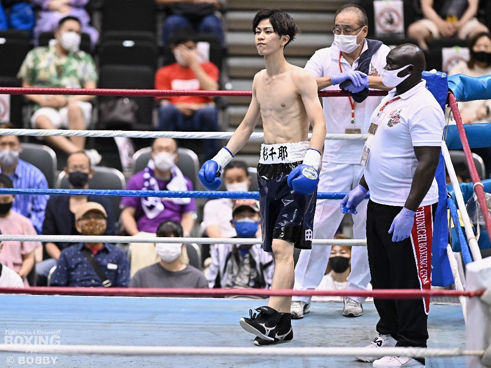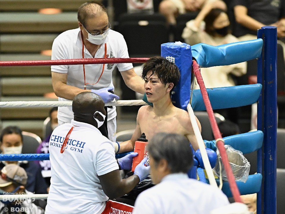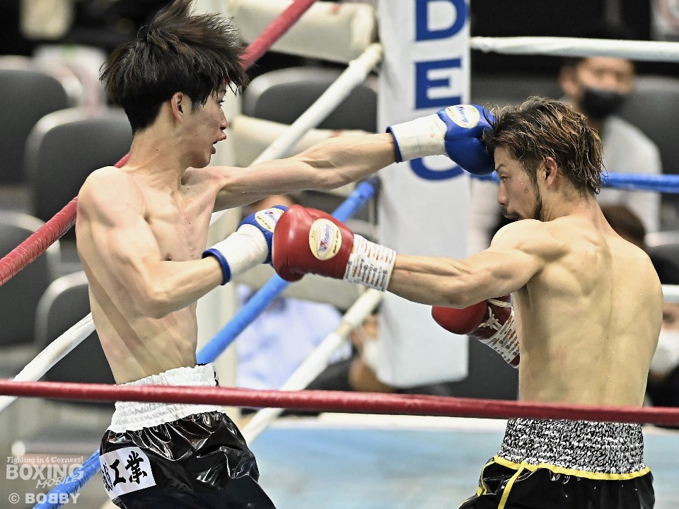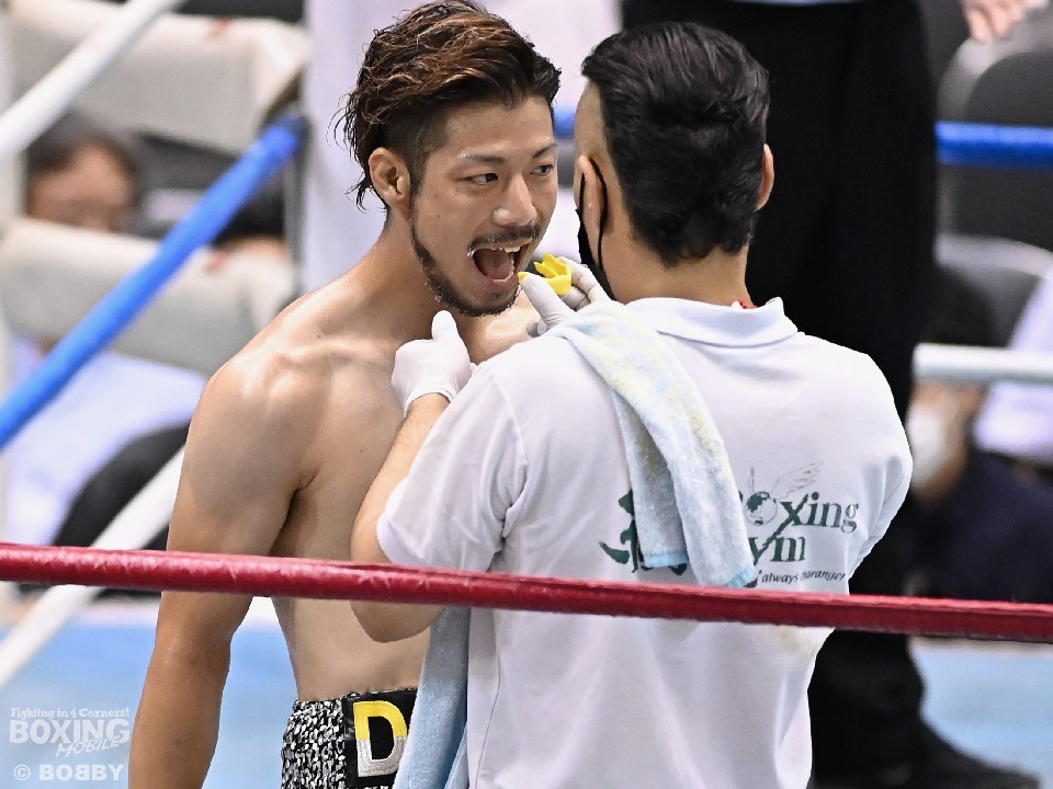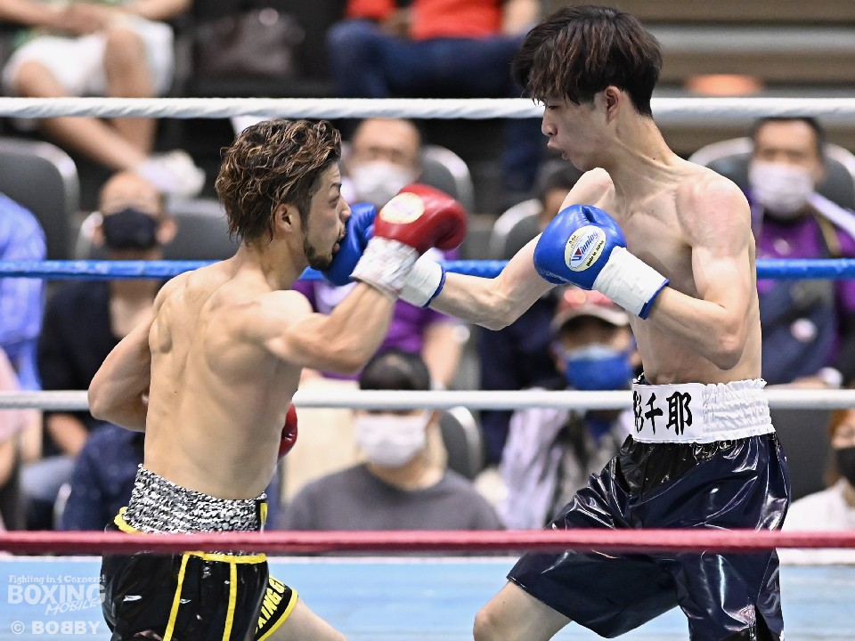 試合:開始から木附が右ストレートで後退させると、打ち終わりにワンツーを好打。178㎝のサウスポー太田も左ストレートを狙いチャンスを伺った。2回、木附は右フックで腰を沈めて連打を繰り出すが、力みが見られフィニッシュにつなげられず。それでも攻撃の手を緩めずグイグイと攻め立てた。3回、太田はワンツーでグラつかせると連打で攻勢。体力の消耗が激しい木附に迫り猛追した。勝負の4回。前に出たのは木附の方。右ストレートで顔をのけぞらせると積極的な攻撃でジャッジに攻勢をアピールした。