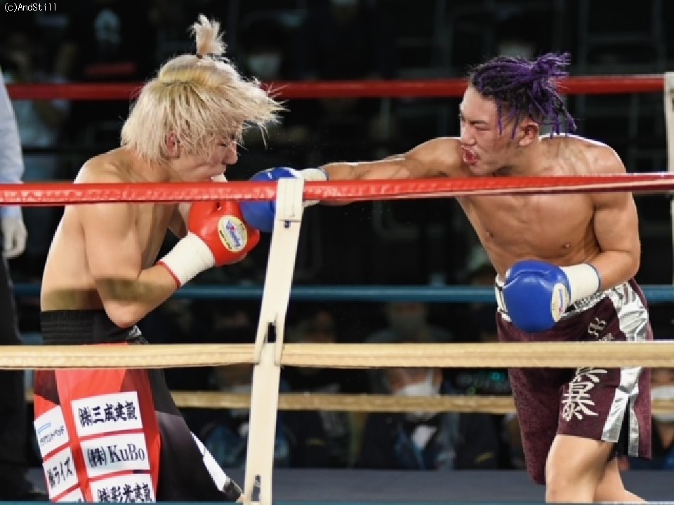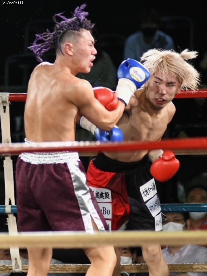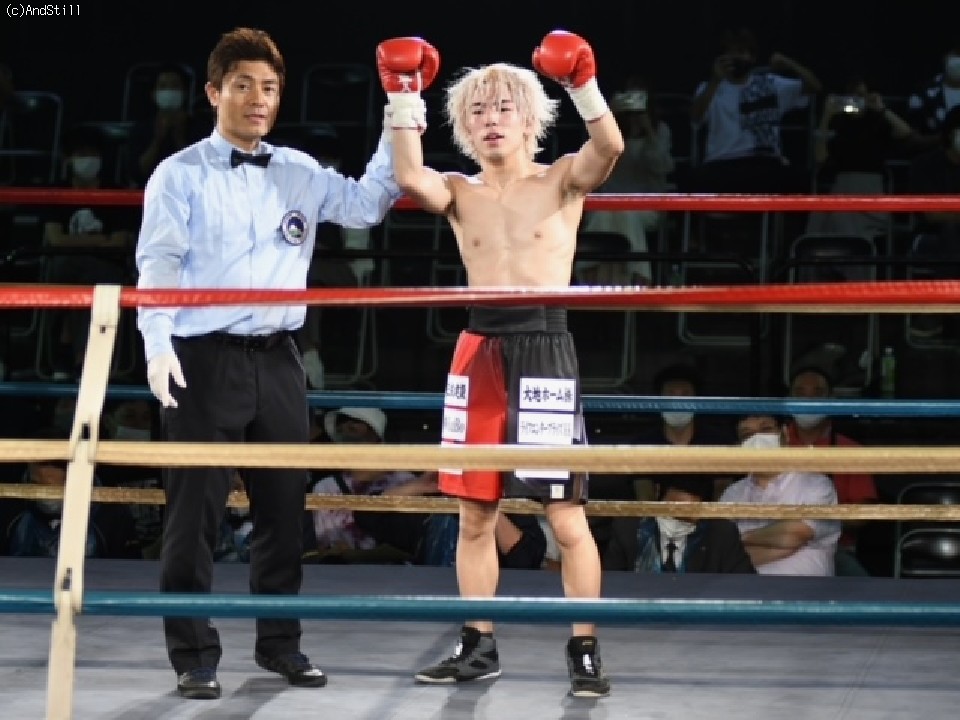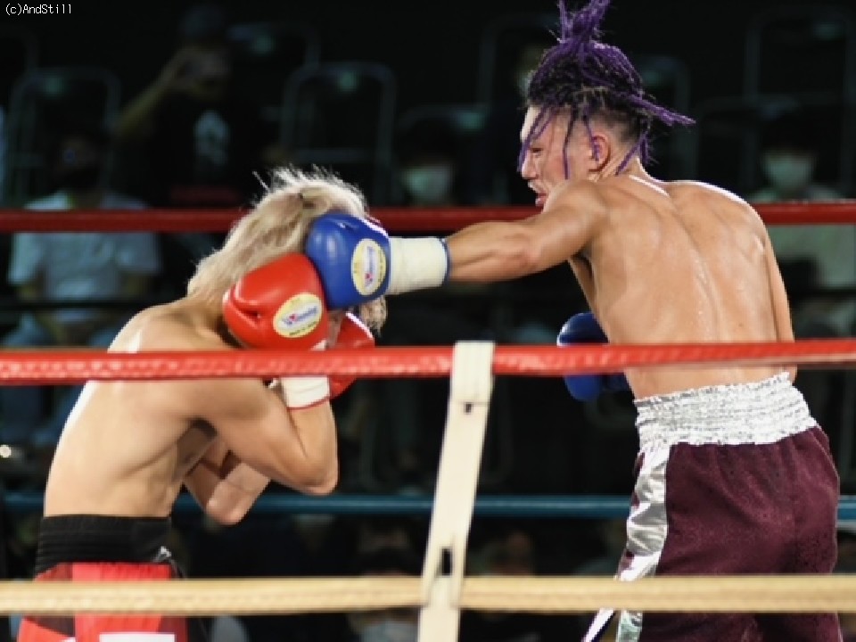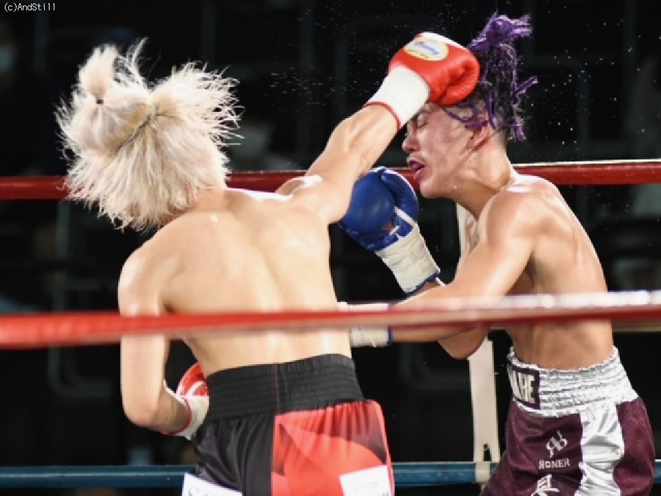 試合:ゴングが鳴ると同時に芝野が前に出て奇襲攻撃。後手に回った仲野だがジャブから立て直しを図ると、ワンツーを返し対抗した。2回、強気に打って出た芝野だが、体力の消耗が激しく手数が減った。それでも単発の右フックで顔を弾きジャッジに攻勢をアピール。3回、激しい打撃戦を繰り広げる中、芝野の右フックがヒット。最終4回は両者とも必死の形相でパンチを交錯させたが決定打は生まれなかった。有効打で上回った芝野がデビュー戦を勝利した。