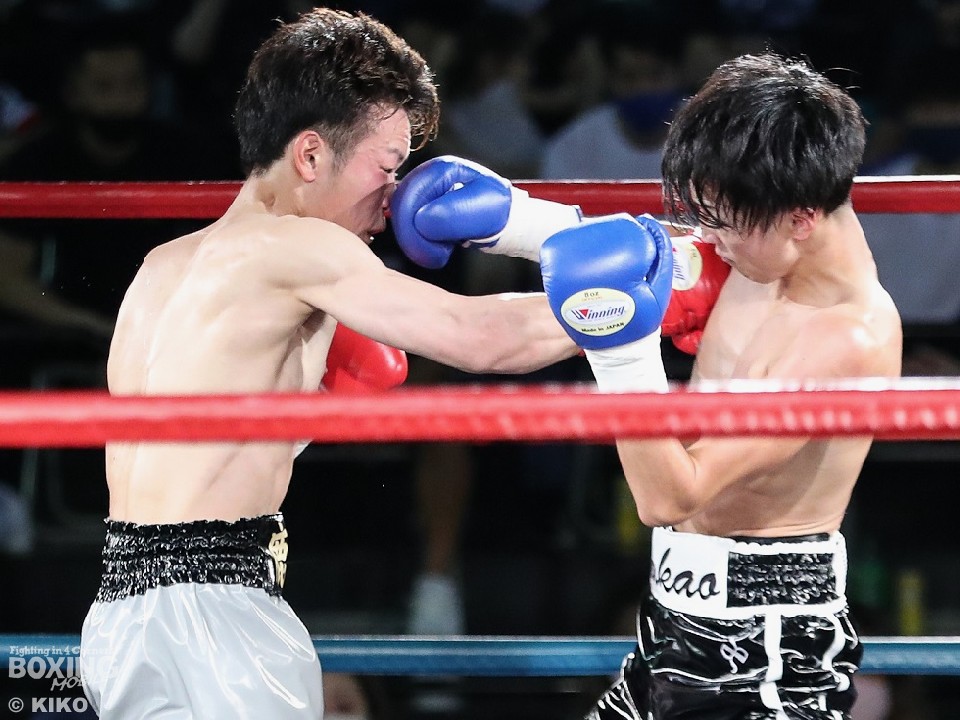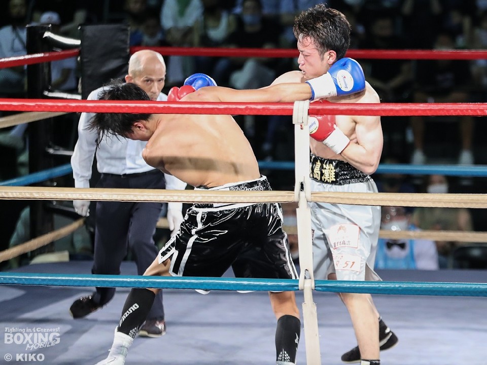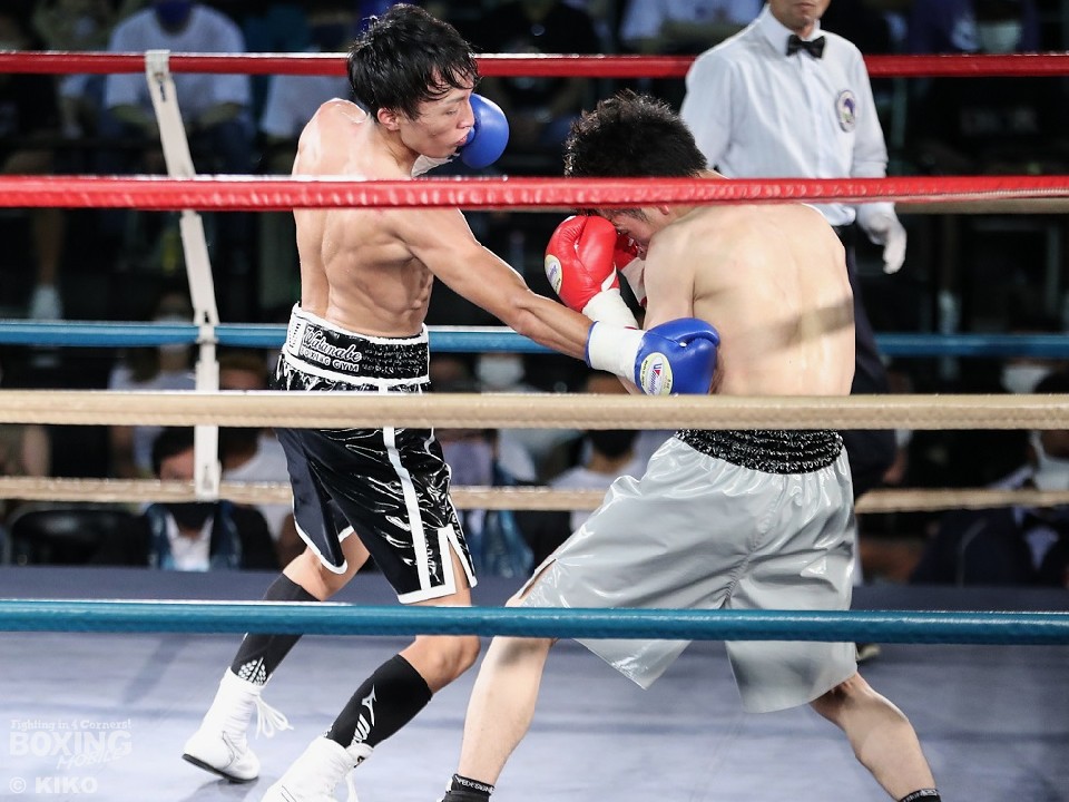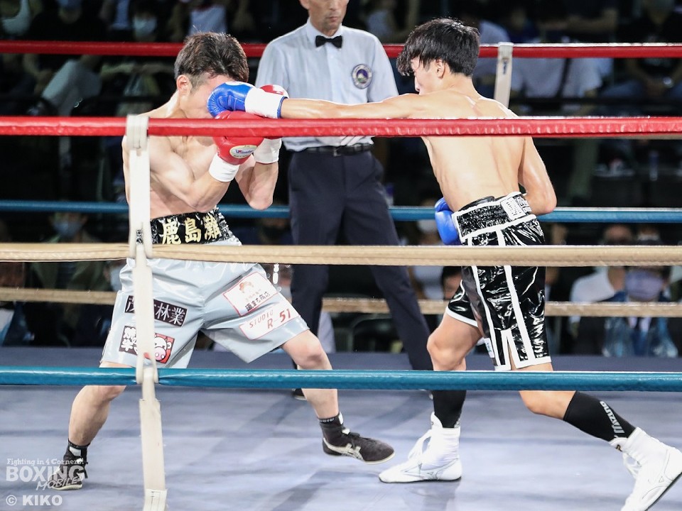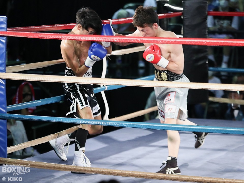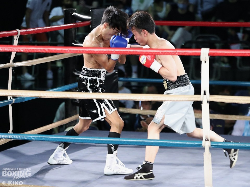 試合:篠塚が右フックを叩きつけ仕掛けるが、サウスポー井上は右ボディで迎え撃つとワンツーを好打。相手の勢いを止めた。2回、井上のコンビネーションが冴えわたるが、篠塚は被弾しながら果敢に前に出て右フックでグラつかせて応戦。乱打戦に突入した3回、両者とも体力の消耗が激しい中、懸命にパンチを繰り出す。井上は右ボディ、左ボディアッパーを決めて見栄えの良さをアピールした。最終4回も意地のぶつかり合い。井上がワンツーを決めれば篠塚も左フックで顔を弾き譲らなかった。ジャッジに委ねられた採点は引き分けとなったが、新人王特別ルールにより優勢点を勝ち取った篠塚が次戦にコマを進めた。