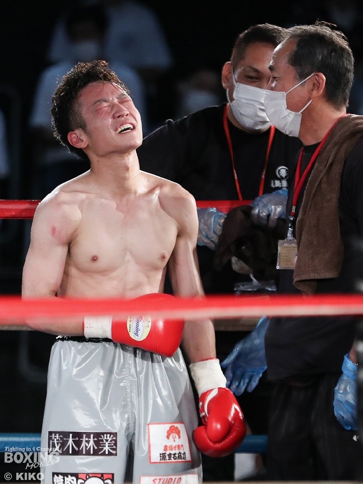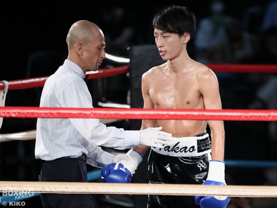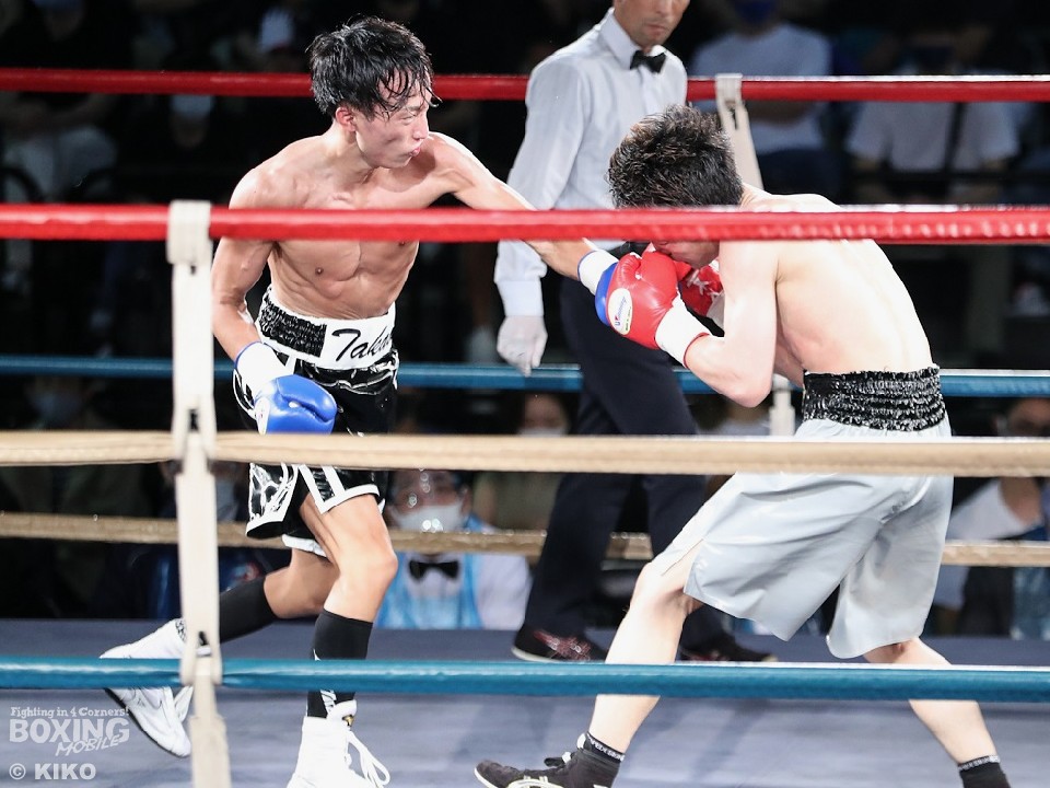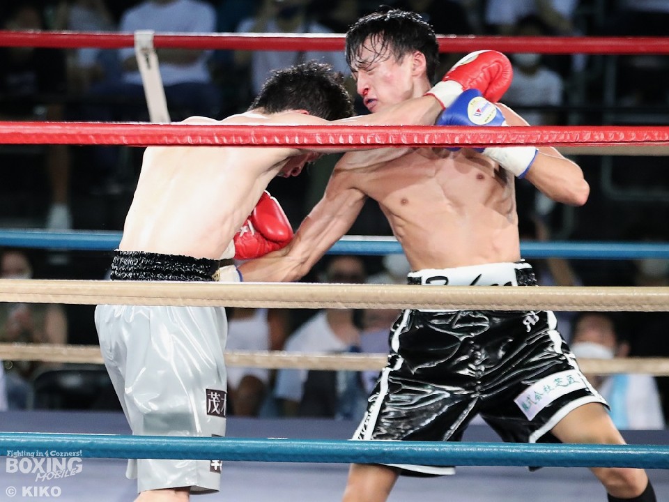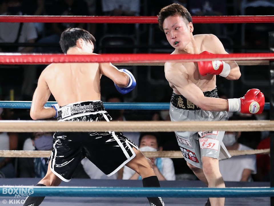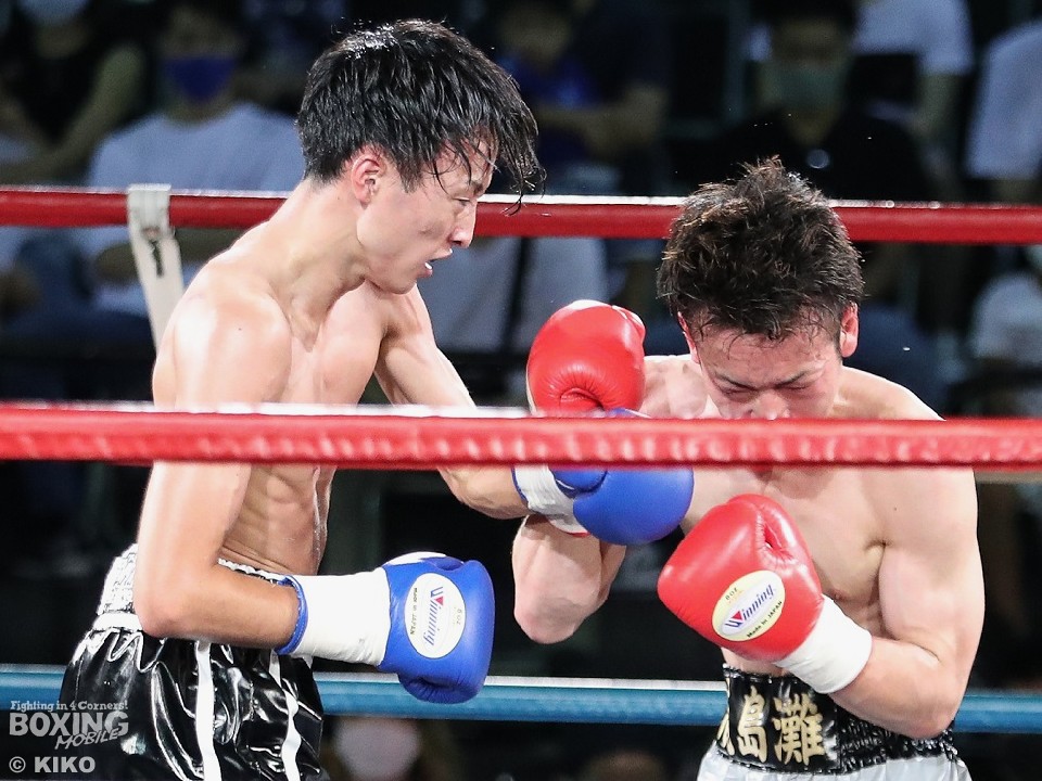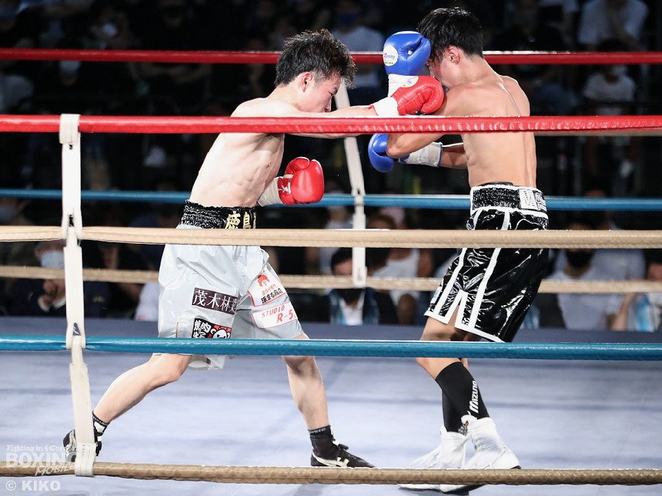 試合:篠塚が右フックを叩きつけ仕掛けるが、サウスポー井上は右ボディで迎え撃つとワンツーを好打。相手の勢いを止めた。2回、井上のコンビネーションが冴えわたるが、篠塚は被弾しながら果敢に前に出て右フックでグラつかせて応戦。乱打戦に突入した3回、両者とも体力の消耗が激しい中、懸命にパンチを繰り出す。井上は右ボディ、左ボディアッパーを決めて見栄えの良さをアピールした。最終4回も意地のぶつかり合い。井上がワンツーを決めれば篠塚も左フックで顔を弾き譲らなかった。ジャッジに委ねられた採点は引き分けとなったが、新人王特別ルールにより優勢点を勝ち取った篠塚が次戦にコマを進めた。