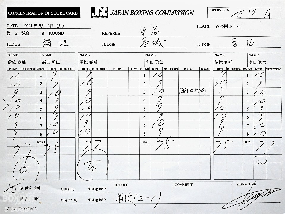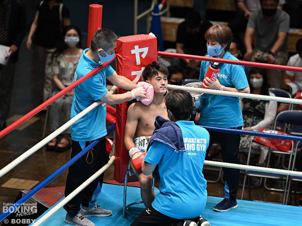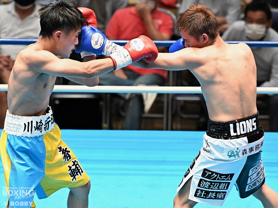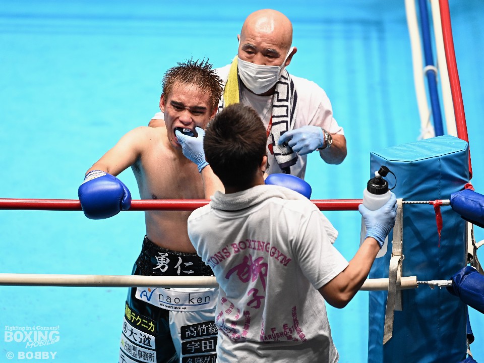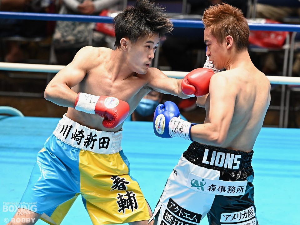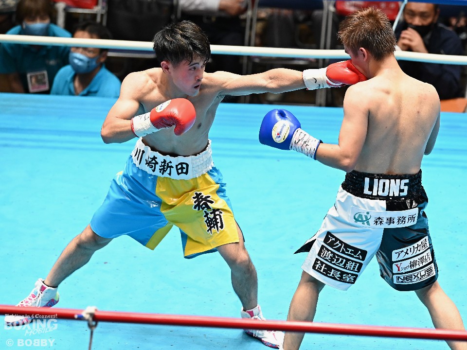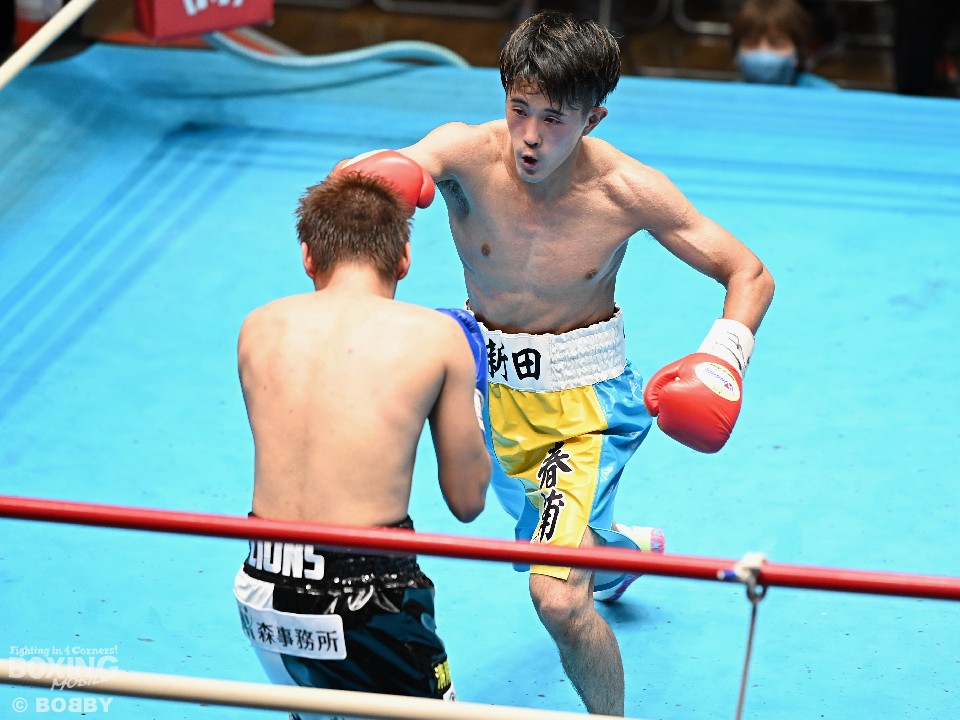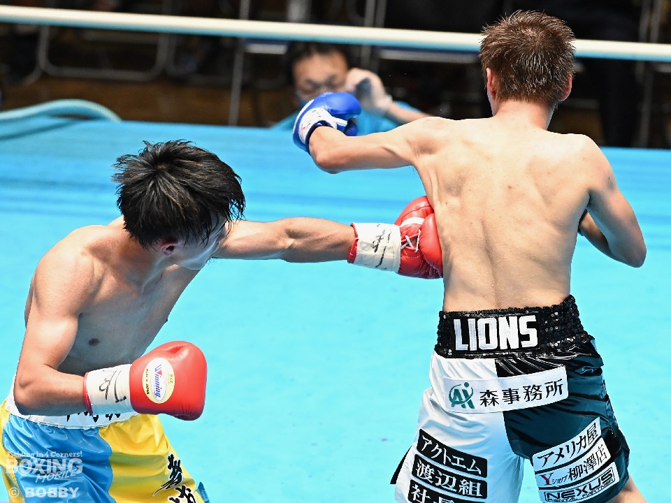 試合:空位の日本ユース・ミニマム級王座を伊佐と高田が争った。伊佐がステップを刻みながら左を突いてリズムを作るのに対し、高田はガードを固めながらジリジリと距離を詰めた。2回、伊佐はサイドに動きながら左フック、ワンツーをヒット。スピードを活かした攻撃で的を絞らせず。流れを作ることができない高田だが、慌てる素振りを見せず3回には右フックでバランスを崩させ反撃。左の精度が上がってきた高田は4回も左ボディ、左フックを決めてジャッジに攻勢をアピール。ペースを奪い返したい伊佐は6回、前後にステップしながらアグレッシブに攻めて見栄えの良さをアピール。し烈なペース争いが続きパンチが決まるたびに両応援団から拍手が沸き起った。最終8回も両者ともパンチを交錯させて意地と意地がぶつかり合った。ジャッジに委ねられた採点は割れたが伊佐を支持した。接戦を制した伊佐が新王者に就いた。