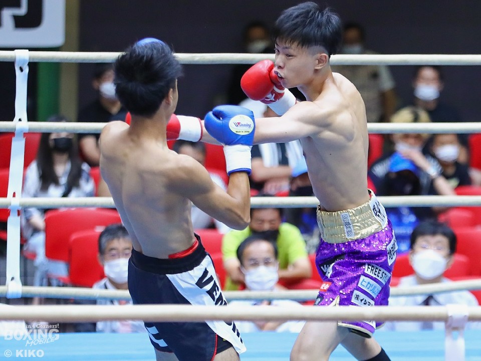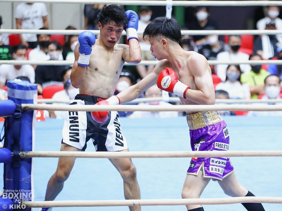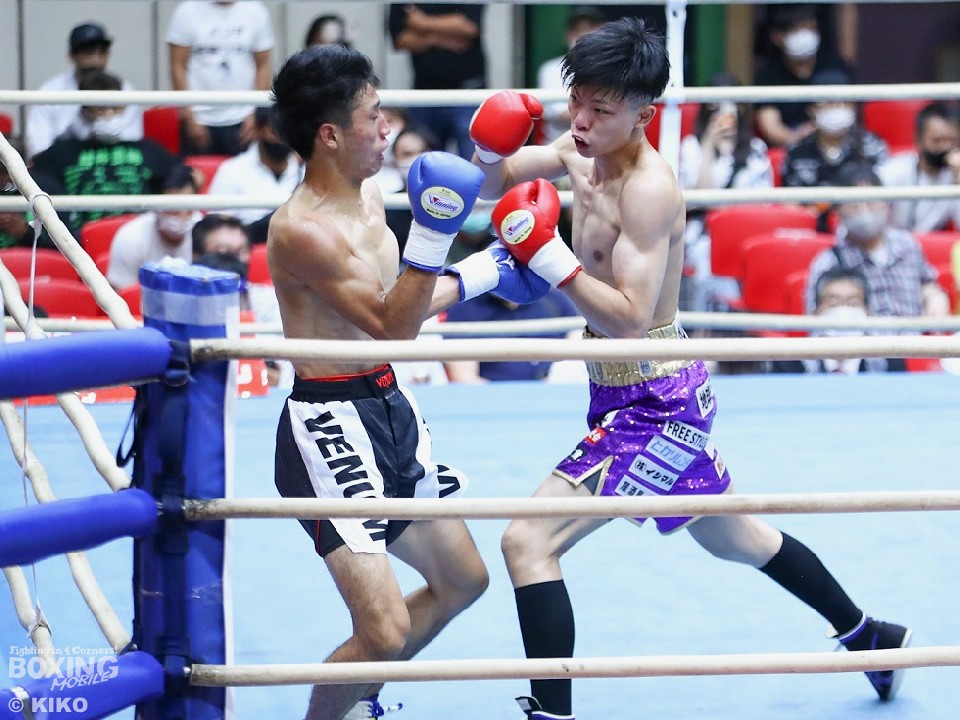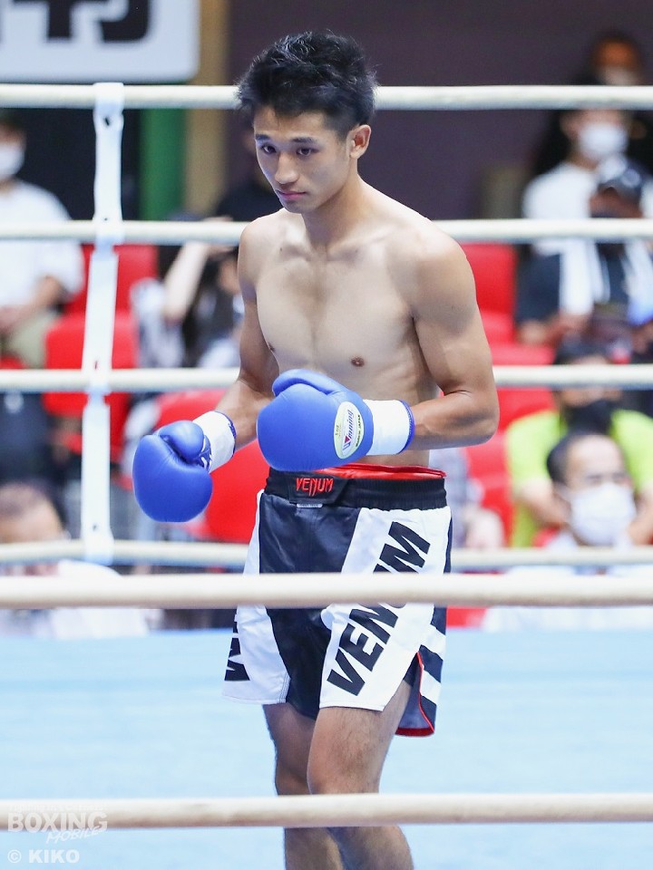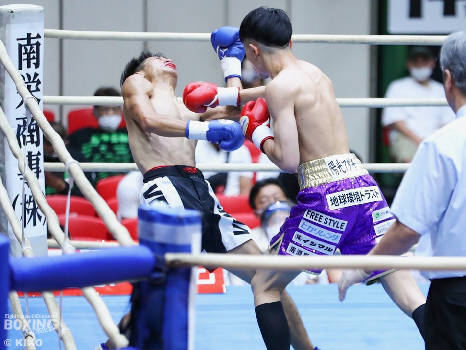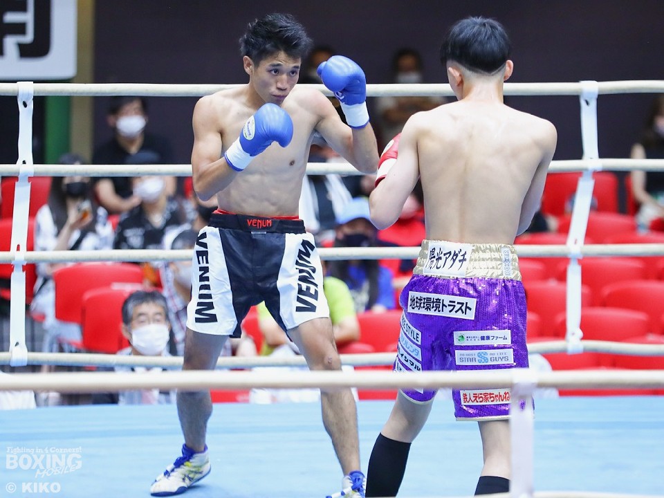 試合:東が長いリーチを活かし左フックを繰り出すが、山口は冷静に対応するとプレスをかけてワンツーをヒット。2回、山口はロープに詰めてワンツー、左フックを決めて積極的な攻撃を仕掛けた。3回、山口は右ストレートでコーナーまで吹っ飛ばすと圧力を強めてポイントを加点。終始、先に仕掛けた山口がフルマークの判定勝ちを飾った。