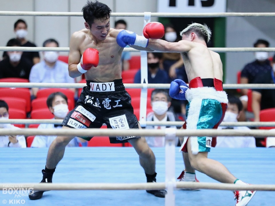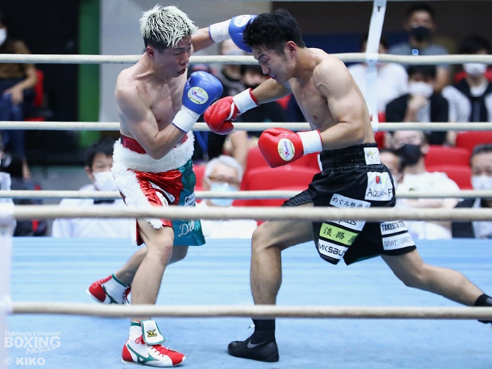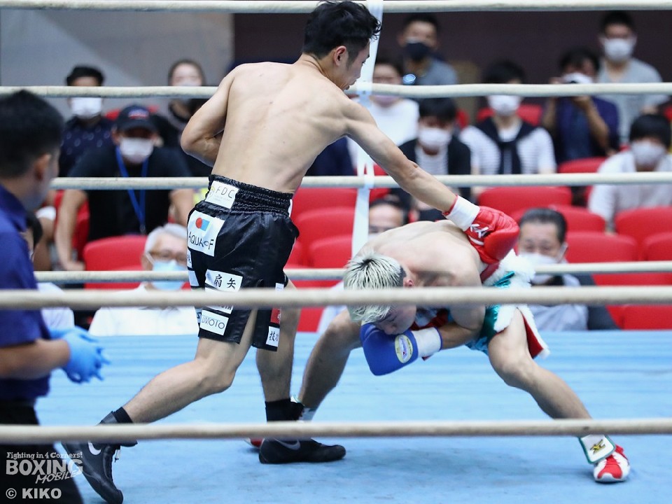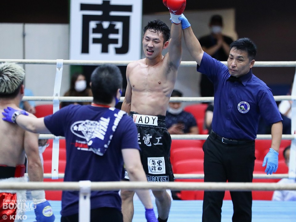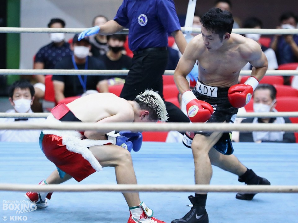 試合:サウスポー中逵が左右に動きながらジャブからワンツーをヒット。ガードで被弾を回避した宮だが、動きに硬さが見られ動き回る相手を捉えきれず。2回、宮はジャブからリズムを作ると左ボディ、右ボディアッパーを痛打。中逵も右フックを返しチャンスを伺った。3回、プレスをかけた宮は右ボディアッパーを軸に左フック、打ち下ろしの右ストレートで攻勢。中逵も回転力を活かした連打で応戦。ラウンド終了間際に宮の右ストレートが火を噴きダウンを奪った。最終4回は両者とも力を振り絞り試合終了のゴング。熱戦を繰り広げた2人に会場から盛大な拍手が送られた。ダウンを奪った宮がデビューから6連勝を飾った。