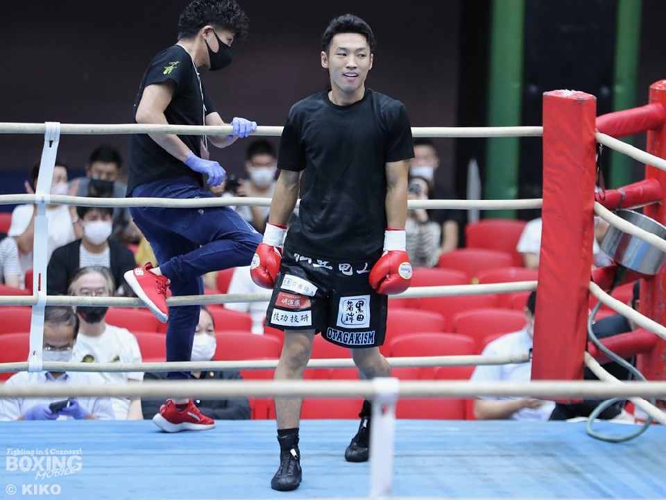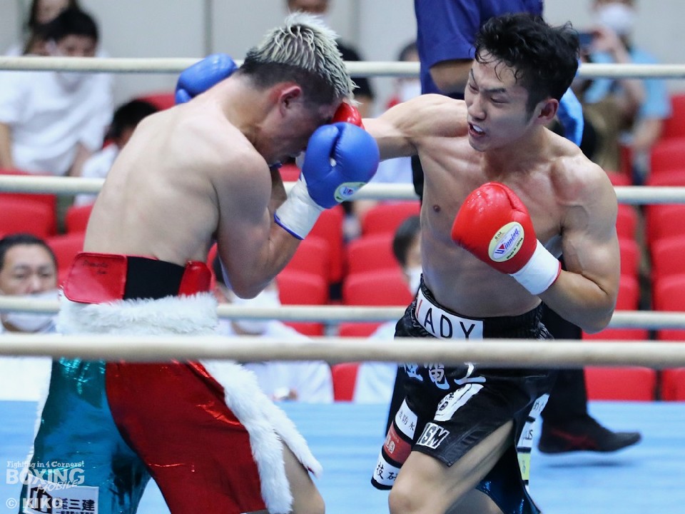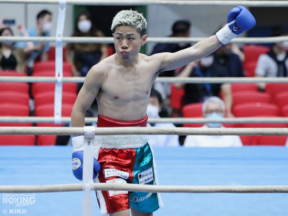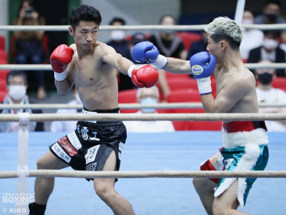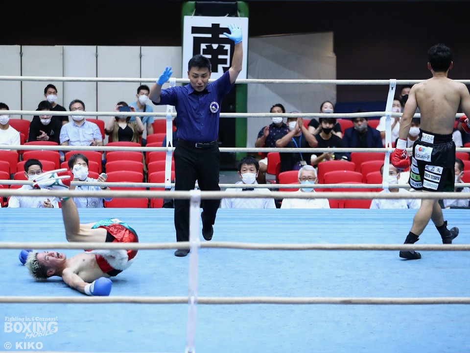 試合:サウスポー中逵が左右に動きながらジャブからワンツーをヒット。ガードで被弾を回避した宮だが、動きに硬さが見られ動き回る相手を捉えきれず。2回、宮はジャブからリズムを作ると左ボディ、右ボディアッパーを痛打。中逵も右フックを返しチャンスを伺った。3回、プレスをかけた宮は右ボディアッパーを軸に左フック、打ち下ろしの右ストレートで攻勢。中逵も回転力を活かした連打で応戦。ラウンド終了間際に宮の右ストレートが火を噴きダウンを奪った。最終4回は両者とも力を振り絞り試合終了のゴング。熱戦を繰り広げた2人に会場から盛大な拍手が送られた。ダウンを奪った宮がデビューから6連勝を飾った。