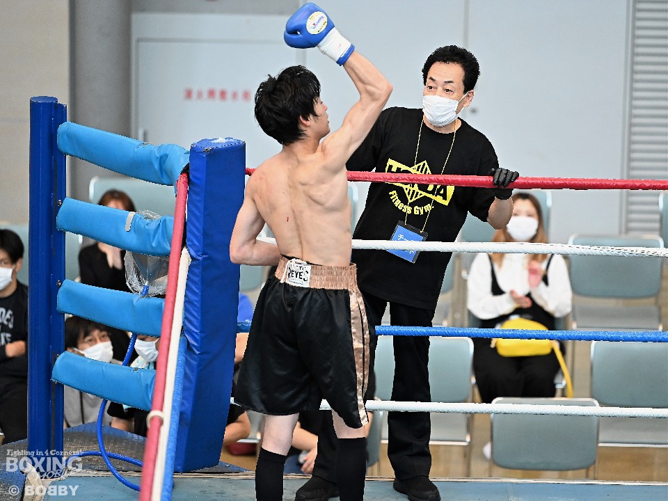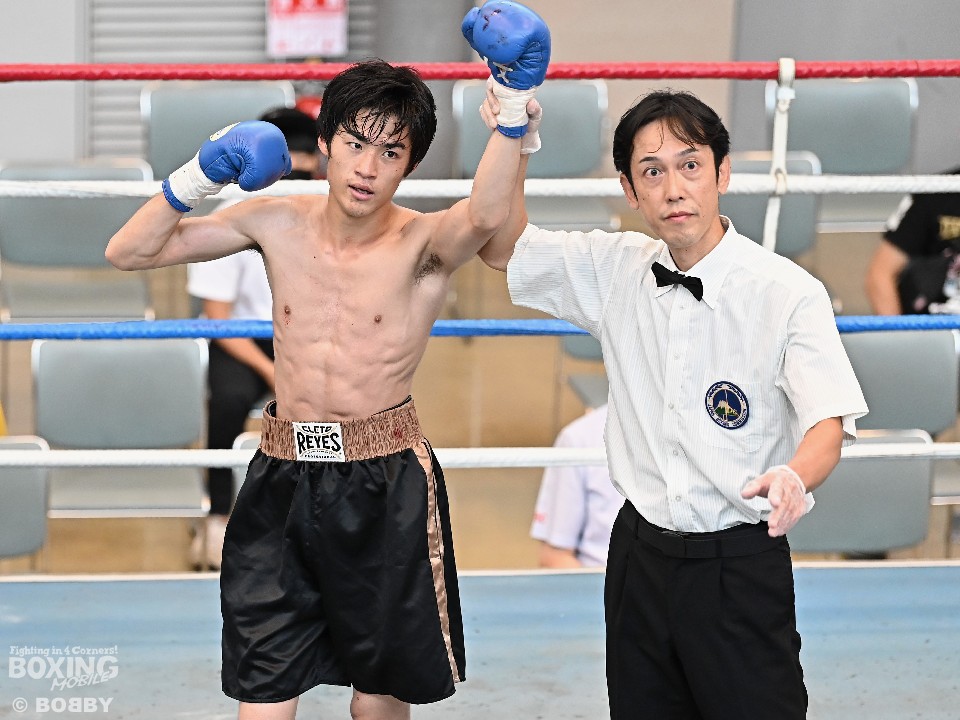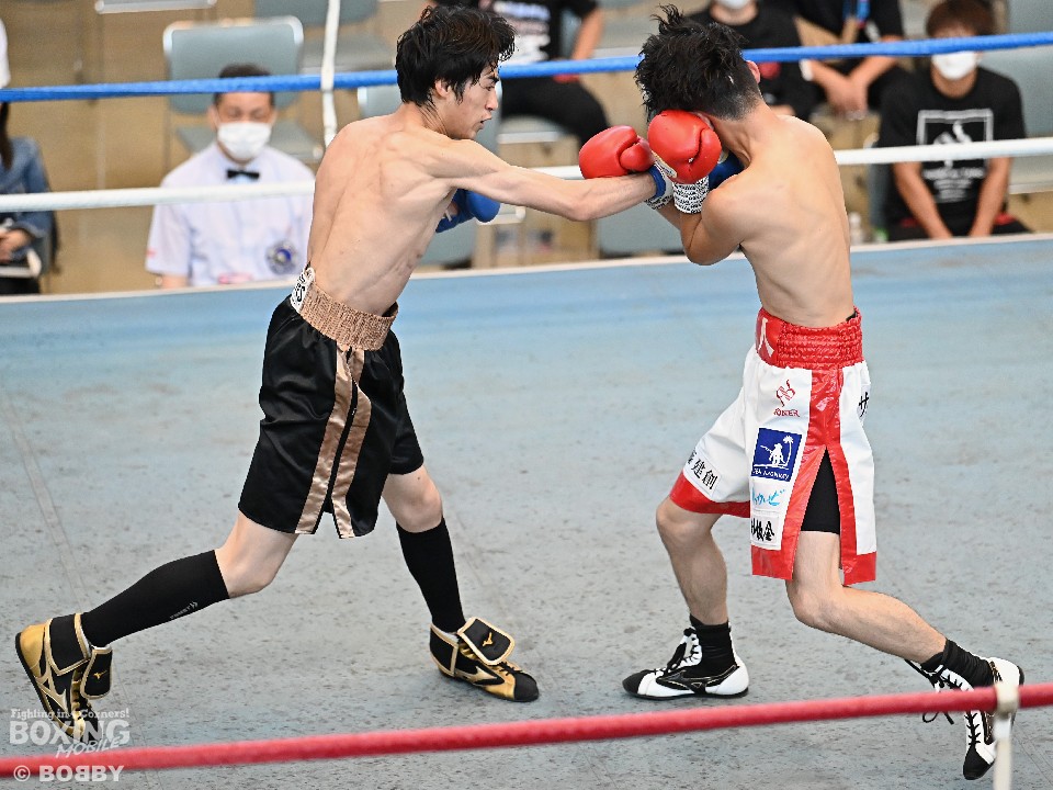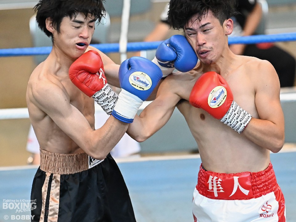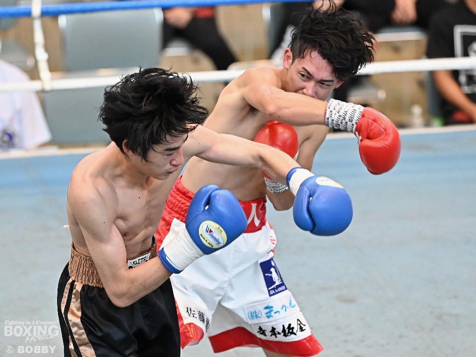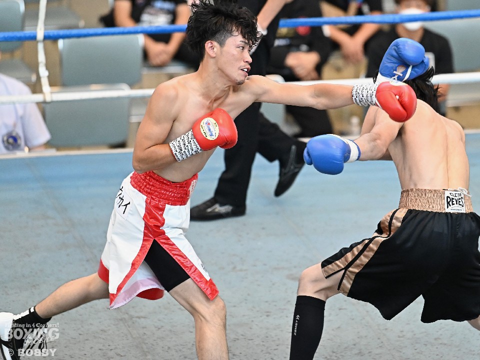 試合:先に手を出したのはサウスポーの山崎。下がらずパンチをまとめたのは山内。中間距離からの打ち合いで有効打を集めた山内がジャッジを支持を得た。