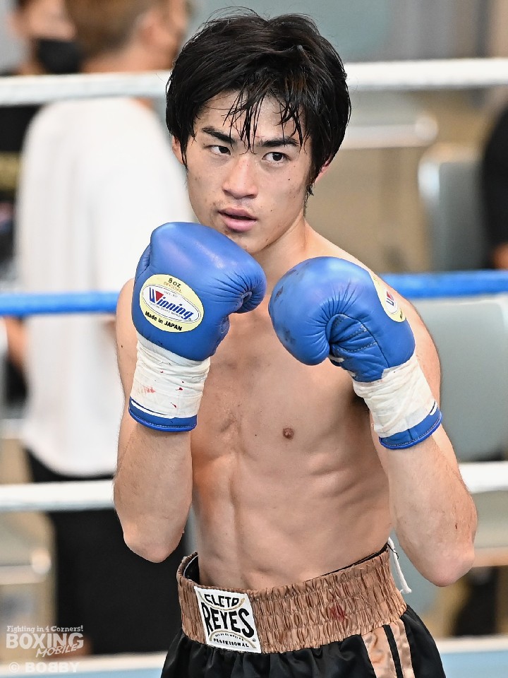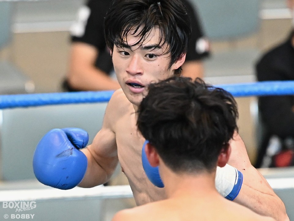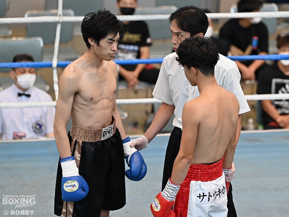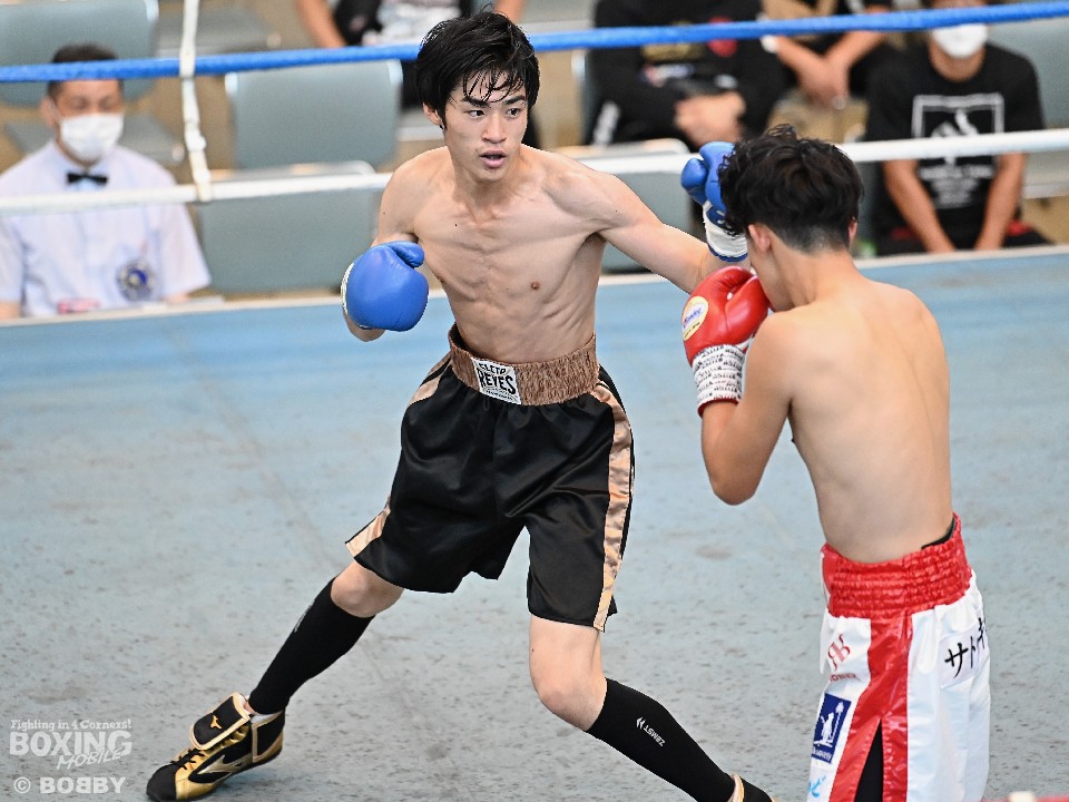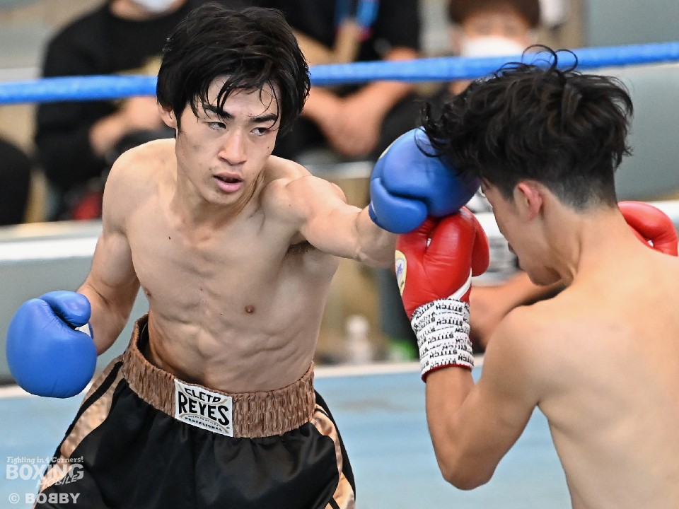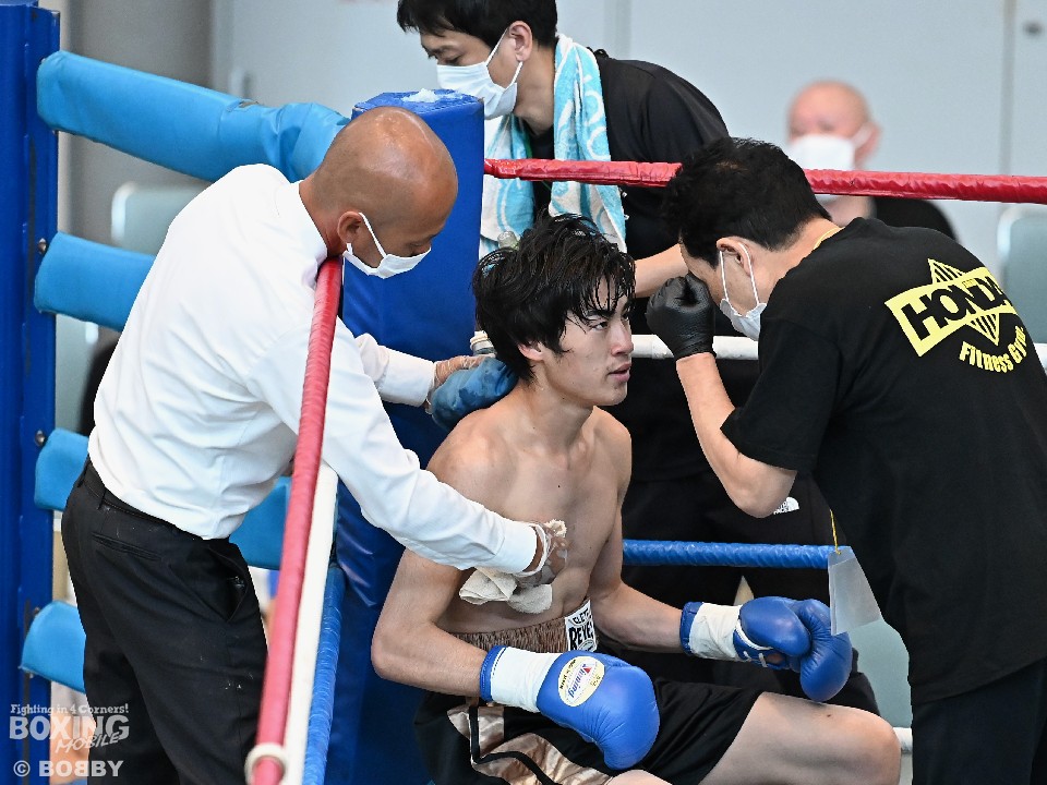 試合:先に手を出したのはサウスポーの山崎。下がらずパンチをまとめたのは山内。中間距離からの打ち合いで有効打を集めた山内がジャッジを支持を得た。
