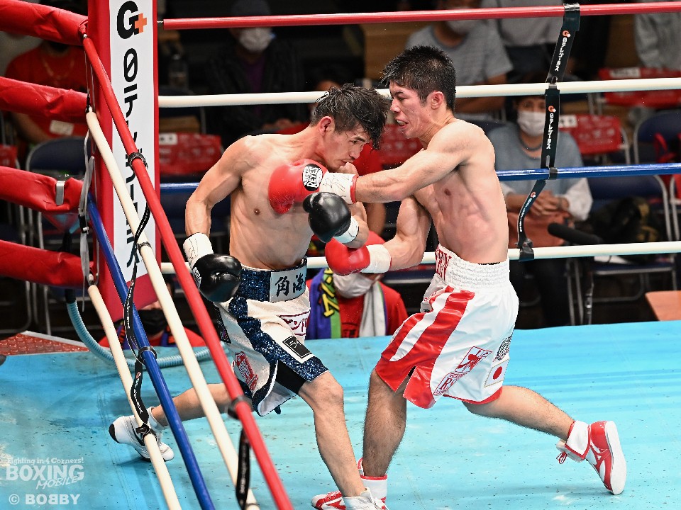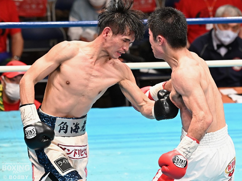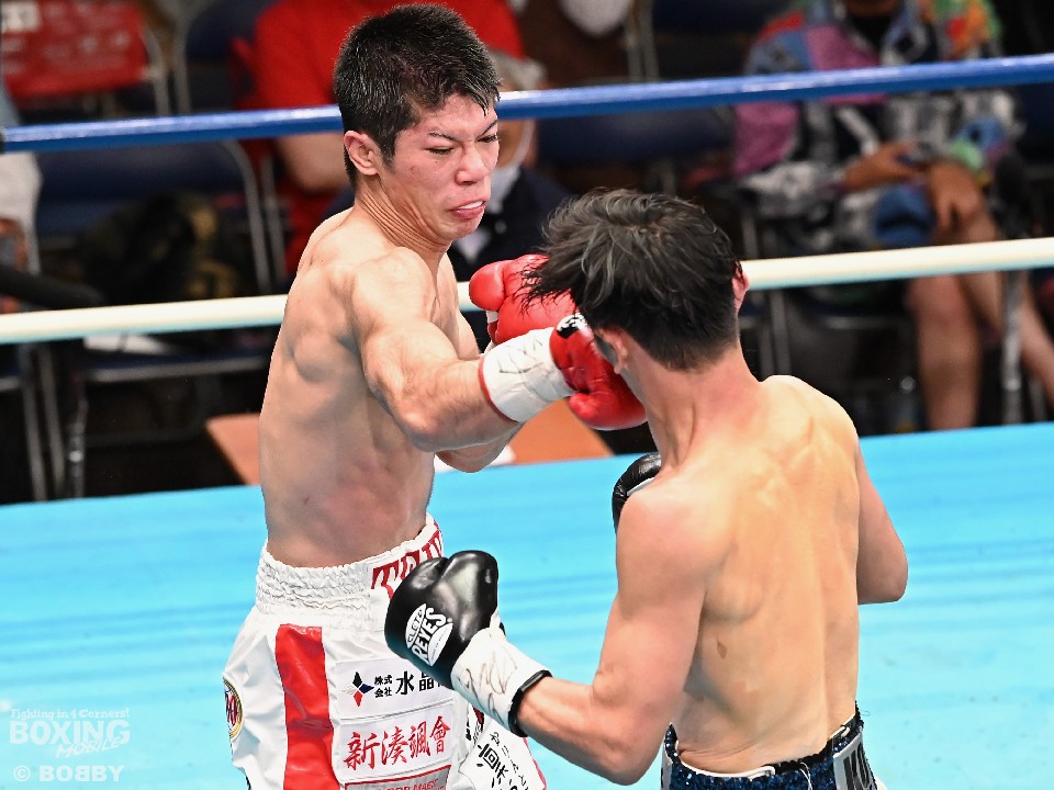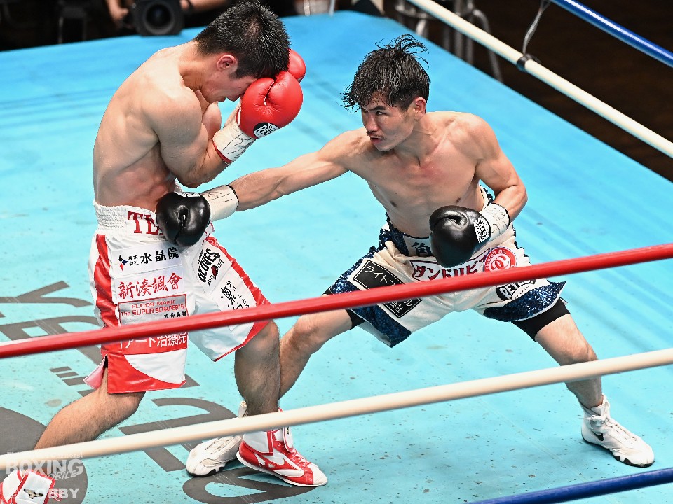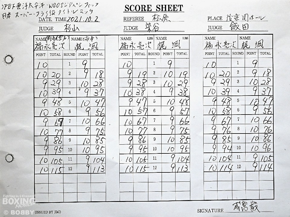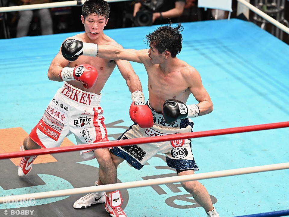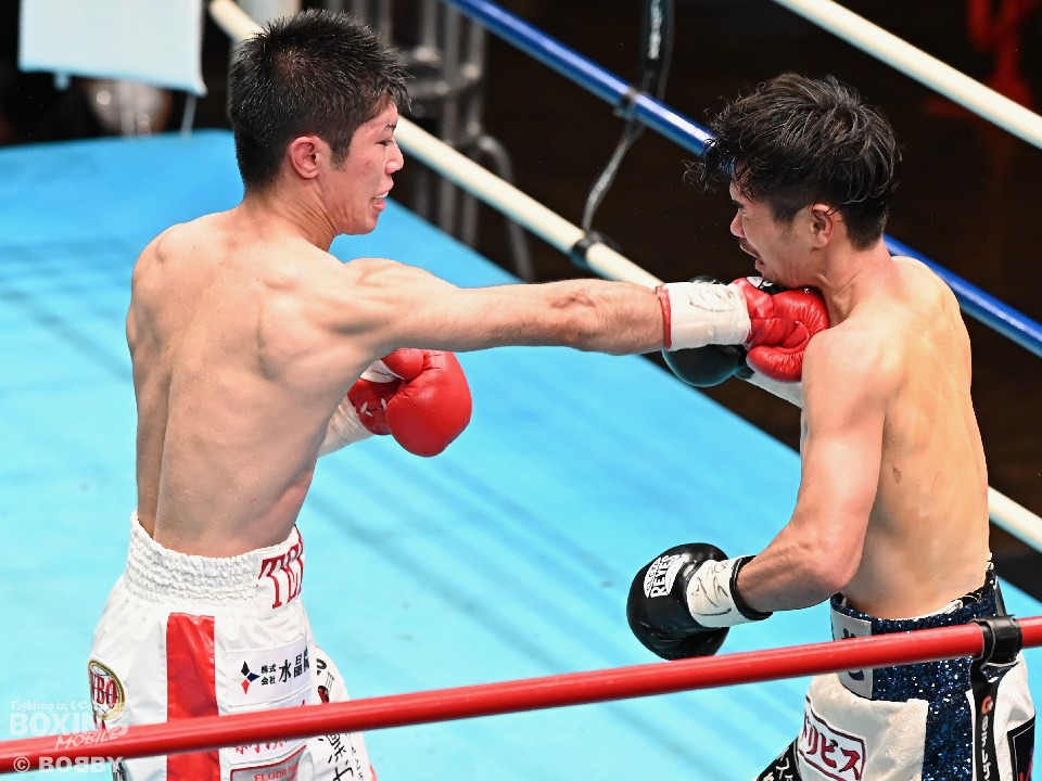 試合:スーパーフライ級アジア3冠王者の福永が15戦全勝(9KO)の梶を迎え撃った。初回、サウスポー福永が右で距離を測るのに対し、梶はガードを固めながらジリジリと迫り様子を伺った。2回、福永は鋭い踏み込みから上下のコンビネーション、さらに左右をまとめて攻勢。梶も負けじと左フックを返した。3回、梶は左フックから回転数を上げて反撃。福永はポジションを入れ替えるとボディにコツコツとパンチを当てた。5回、福永は上下に打ち分け仕掛ける。しかし、梶は右カウンターで体を泳がせるとロープに詰めて連打で攻勢。ピンチの福永はクリンチで窮地をしのぐがラウンド終盤に再び連打を浴びた。5回終了時の公開採点は48-47×2(福永)、48-47×1(梶)と割れた。7回、梶は左フックから左右をまとめて強引に打って出る。福永はパンチをかわすが、梶の回転力は止まらず右ストレートで顔を弾いた。8回も梶のカウンターが冴えわたる。福永の打ち終わりを狙い右を決めた。9回も梶が優勢。プレスをかけてワンツーから豊富な手数を繰り出した。流れを変えたい福永だが梶の固いガードを崩せず。11回、福永は左ボディストレートで一瞬、動きを止めて反撃。最終12回、福永はワンツーで顔をのけぞらせて攻勢。梶も動きを止めずに果敢にパンチを返して試合終了のゴングが鳴った。ジャッジに委ねられた採点は1者がドローとしたが2者が福永を支持。接戦を制した福永がベルトを死守した。