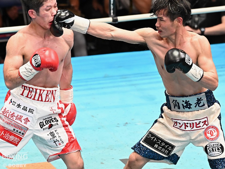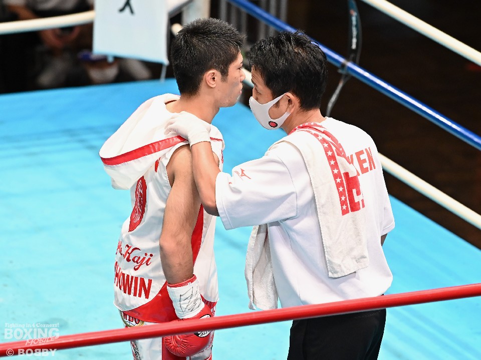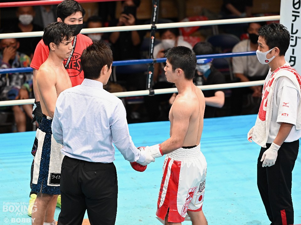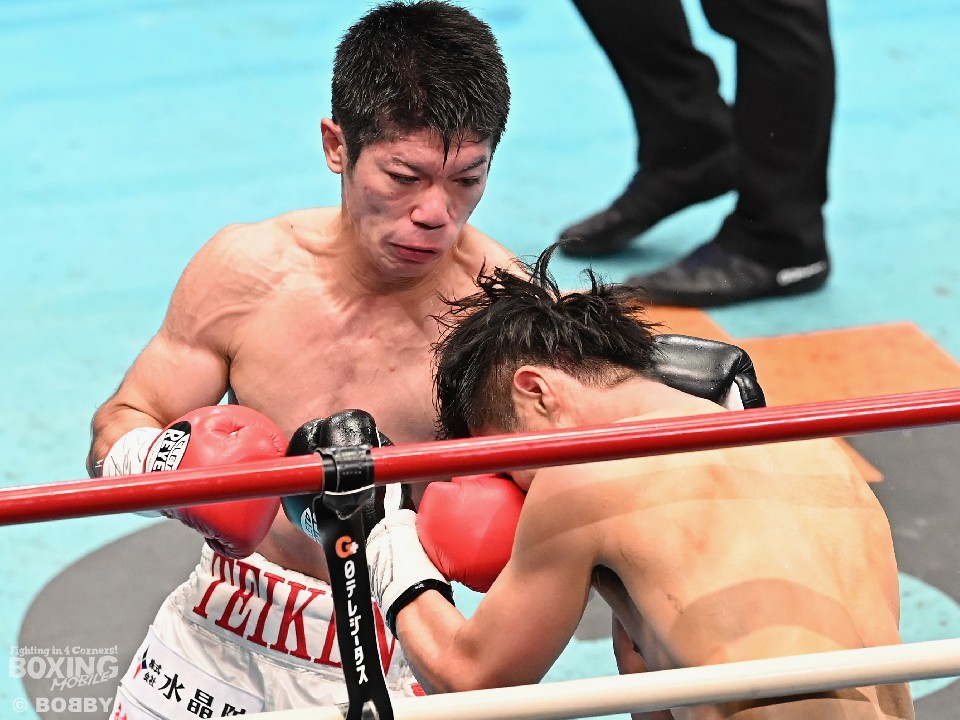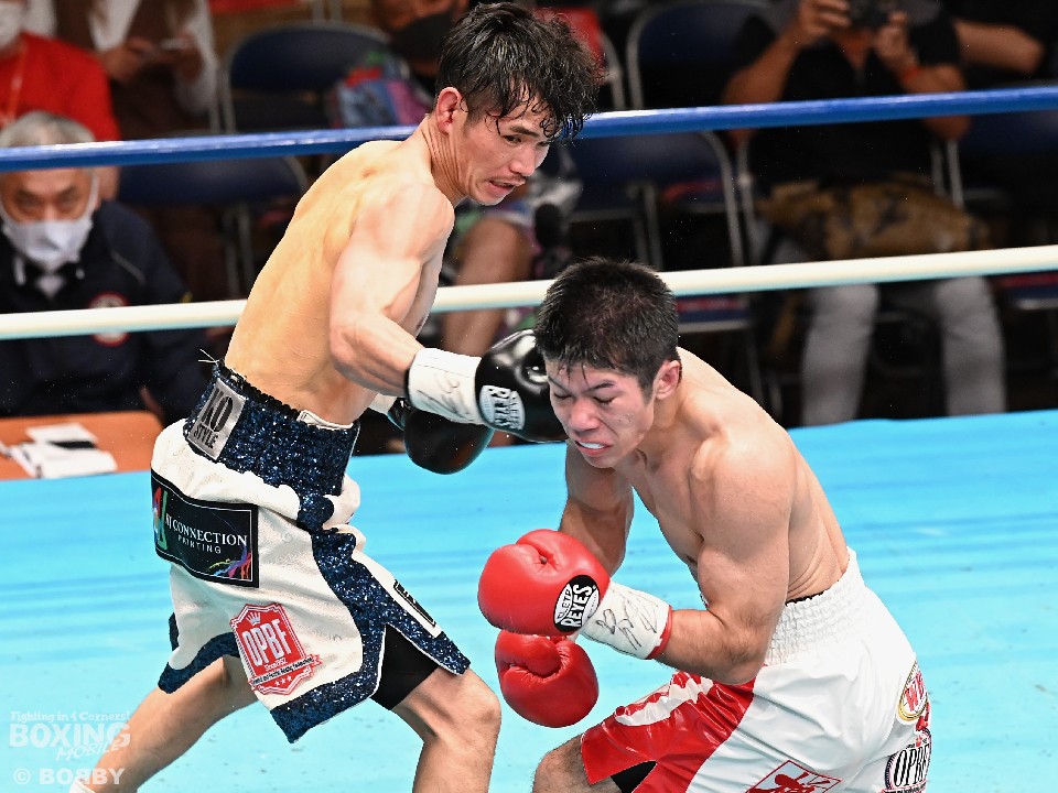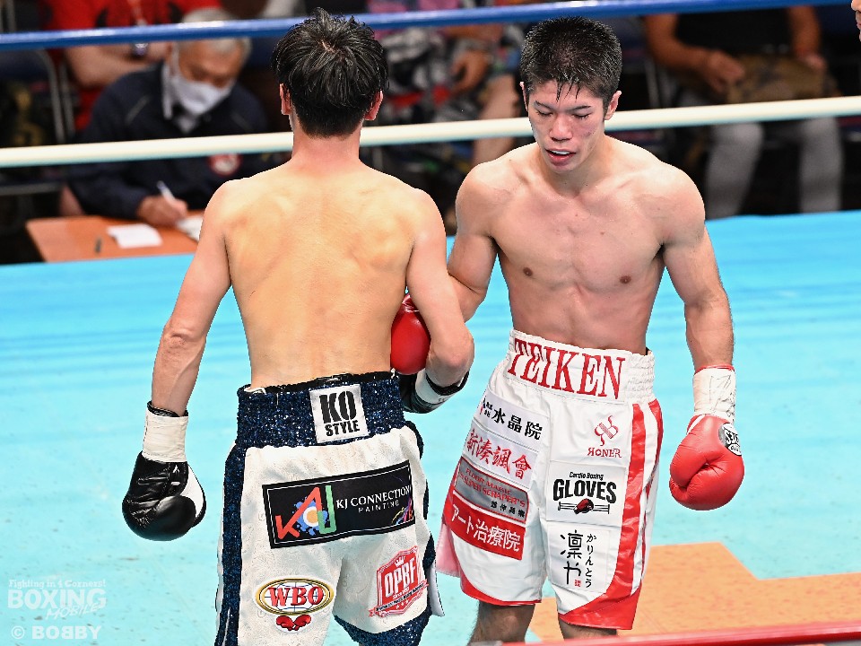 試合:スーパーフライ級アジア3冠王者の福永が15戦全勝(9KO)の梶を迎え撃った。初回、サウスポー福永が右で距離を測るのに対し、梶はガードを固めながらジリジリと迫り様子を伺った。2回、福永は鋭い踏み込みから上下のコンビネーション、さらに左右をまとめて攻勢。梶も負けじと左フックを返した。3回、梶は左フックから回転数を上げて反撃。福永はポジションを入れ替えるとボディにコツコツとパンチを当てた。5回、福永は上下に打ち分け仕掛ける。しかし、梶は右カウンターで体を泳がせるとロープに詰めて連打で攻勢。ピンチの福永はクリンチで窮地をしのぐがラウンド終盤に再び連打を浴びた。5回終了時の公開採点は48-47×2(福永)、48-47×1(梶)と割れた。7回、梶は左フックから左右をまとめて強引に打って出る。福永はパンチをかわすが、梶の回転力は止まらず右ストレートで顔を弾いた。8回も梶のカウンターが冴えわたる。福永の打ち終わりを狙い右を決めた。9回も梶が優勢。プレスをかけてワンツーから豊富な手数を繰り出した。流れを変えたい福永だが梶の固いガードを崩せず。11回、福永は左ボディストレートで一瞬、動きを止めて反撃。最終12回、福永はワンツーで顔をのけぞらせて攻勢。梶も動きを止めずに果敢にパンチを返して試合終了のゴングが鳴った。ジャッジに委ねられた採点は1者がドローとしたが2者が福永を支持。接戦を制した福永がベルトを死守した。