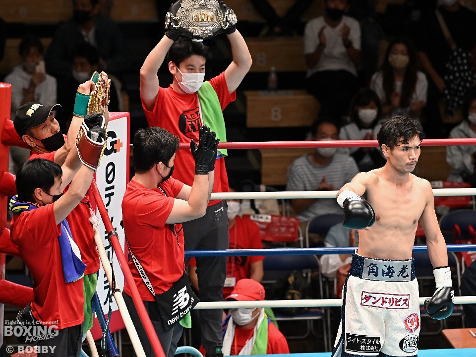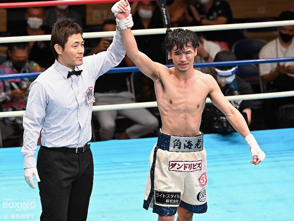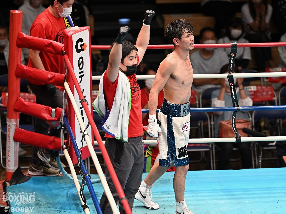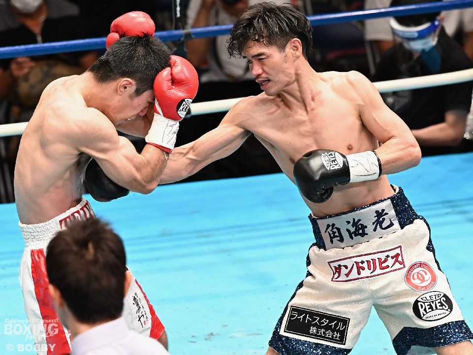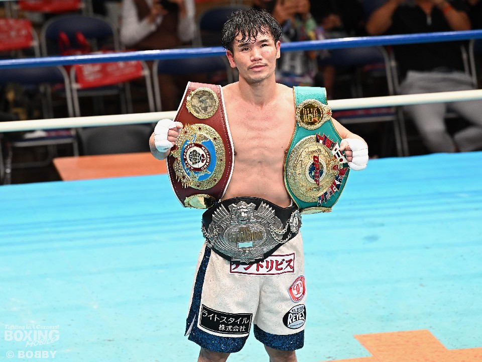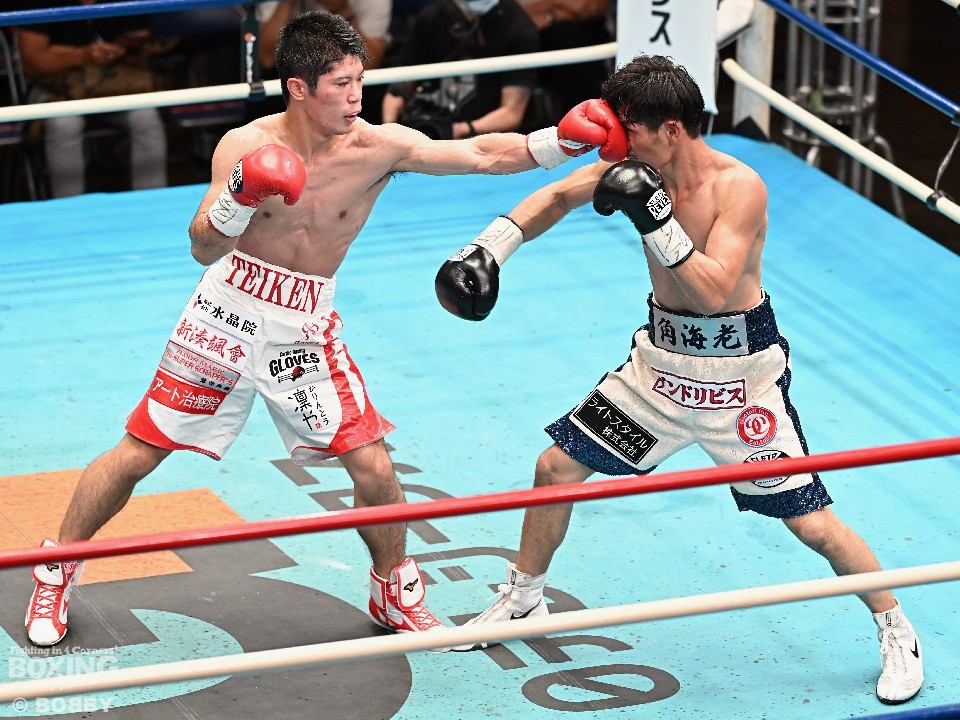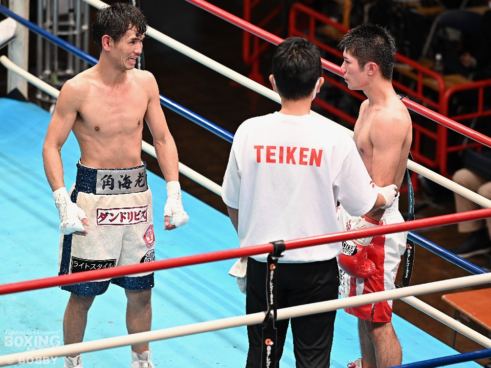 試合:スーパーフライ級アジア3冠王者の福永が15戦全勝(9KO)の梶を迎え撃った。初回、サウスポー福永が右で距離を測るのに対し、梶はガードを固めながらジリジリと迫り様子を伺った。2回、福永は鋭い踏み込みから上下のコンビネーション、さらに左右をまとめて攻勢。梶も負けじと左フックを返した。3回、梶は左フックから回転数を上げて反撃。福永はポジションを入れ替えるとボディにコツコツとパンチを当てた。5回、福永は上下に打ち分け仕掛ける。しかし、梶は右カウンターで体を泳がせるとロープに詰めて連打で攻勢。ピンチの福永はクリンチで窮地をしのぐがラウンド終盤に再び連打を浴びた。5回終了時の公開採点は48-47×2(福永)、48-47×1(梶)と割れた。7回、梶は左フックから左右をまとめて強引に打って出る。福永はパンチをかわすが、梶の回転力は止まらず右ストレートで顔を弾いた。8回も梶のカウンターが冴えわたる。福永の打ち終わりを狙い右を決めた。9回も梶が優勢。プレスをかけてワンツーから豊富な手数を繰り出した。流れを変えたい福永だが梶の固いガードを崩せず。11回、福永は左ボディストレートで一瞬、動きを止めて反撃。最終12回、福永はワンツーで顔をのけぞらせて攻勢。梶も動きを止めずに果敢にパンチを返して試合終了のゴングが鳴った。ジャッジに委ねられた採点は1者がドローとしたが2者が福永を支持。接戦を制した福永がベルトを死守した。
