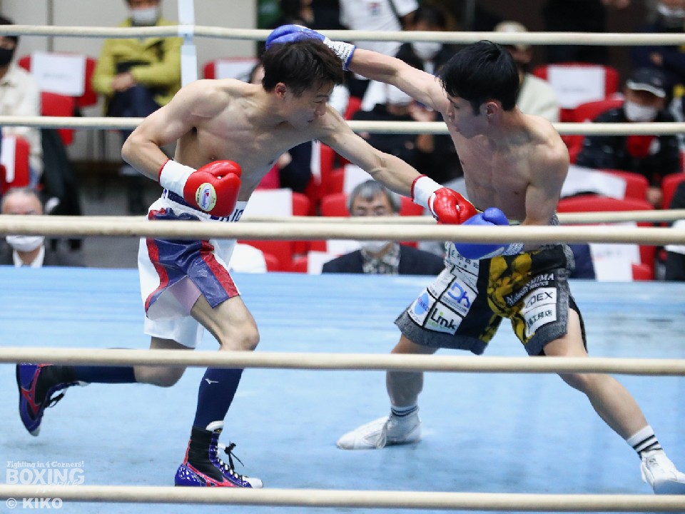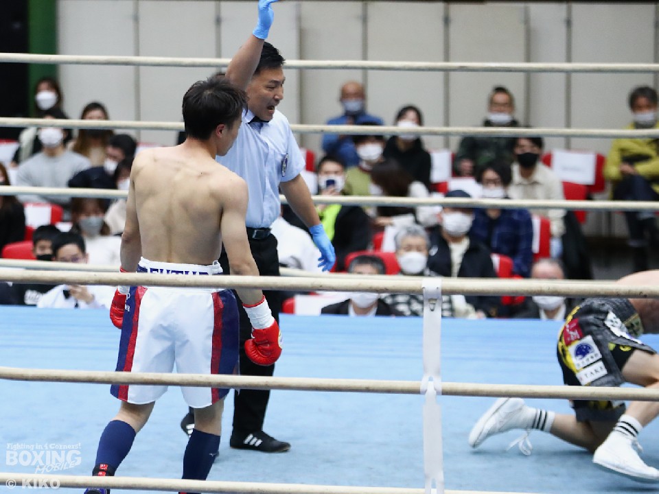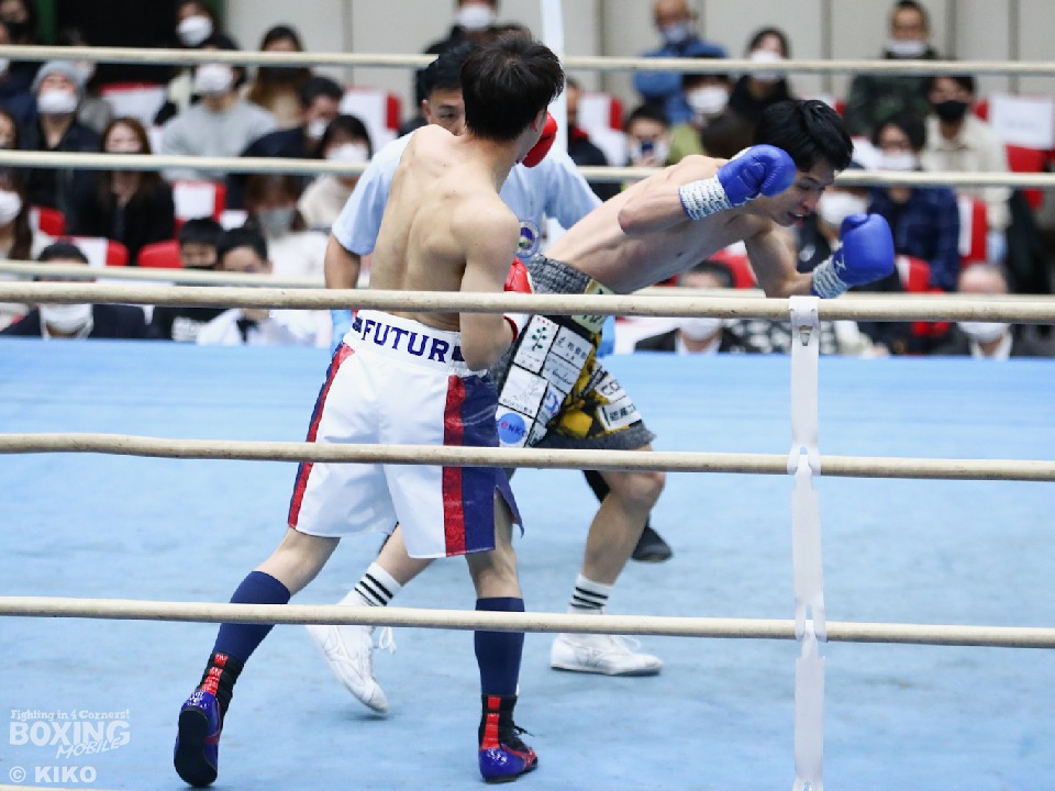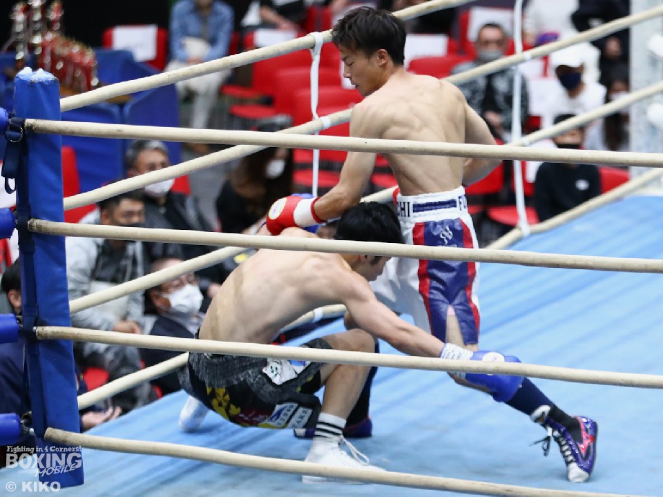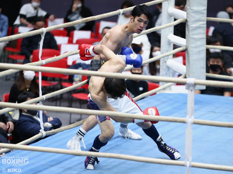 試合:サウスポー同士の一戦は、森野が思い切りの良い左スイングから仕掛けると森川はバックステップで回避。しかし、攻撃の手を緩めない森野は、ロープに追い詰めると左オーバーハンドから右を返してバランスを崩させるとレフェリーはダウンを宣告した。再開後、距離を詰めた相手に森川は左ストレートを合わせて倒し返した。しかし、ラウンド終了間際に森野は、左オーバーハンドで2度目のダウンを奪った。2回、森野は左ロングフックから右フックで3度目のダウンを演出。その後も森野がブンブンとパンチを振り回し、森川が迎え撃つ構図が続いた。逆転を狙う森川は4回、左を繰り出すが大振りになってしまい決定打を打ち込めず。森野も最後まで左右フックで攻め立てた。3度のダウンを奪った森野が全日本新人王決定戦にコマを進めた。