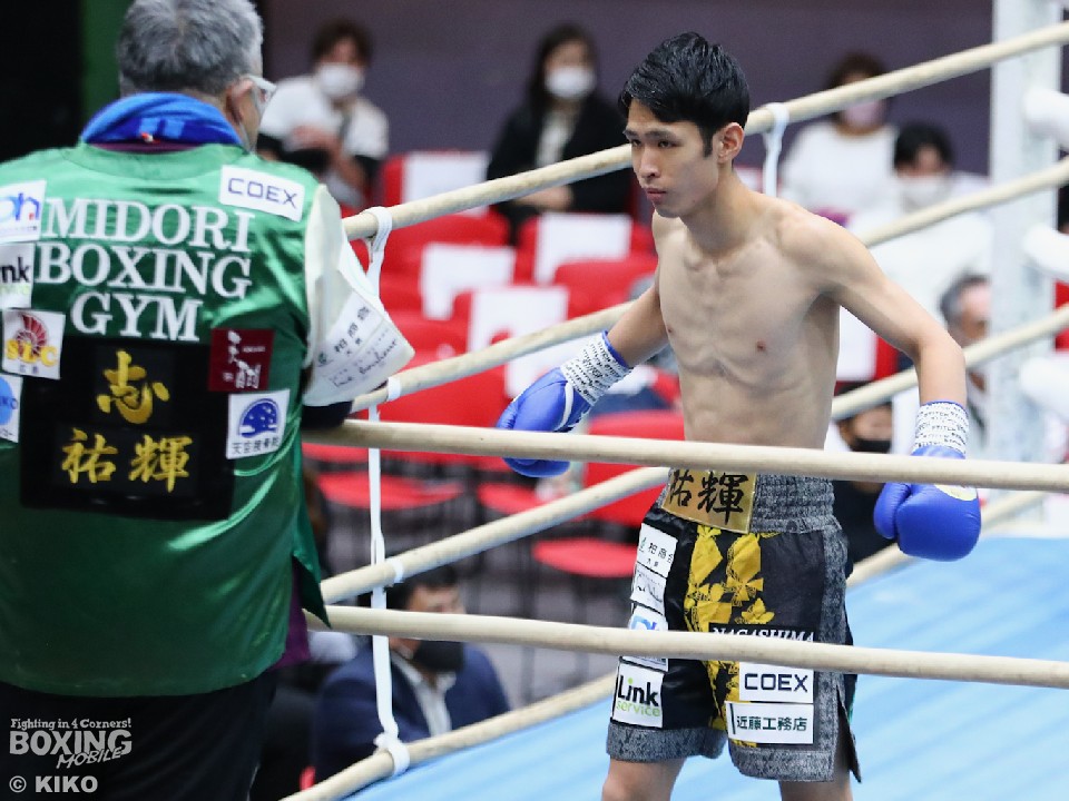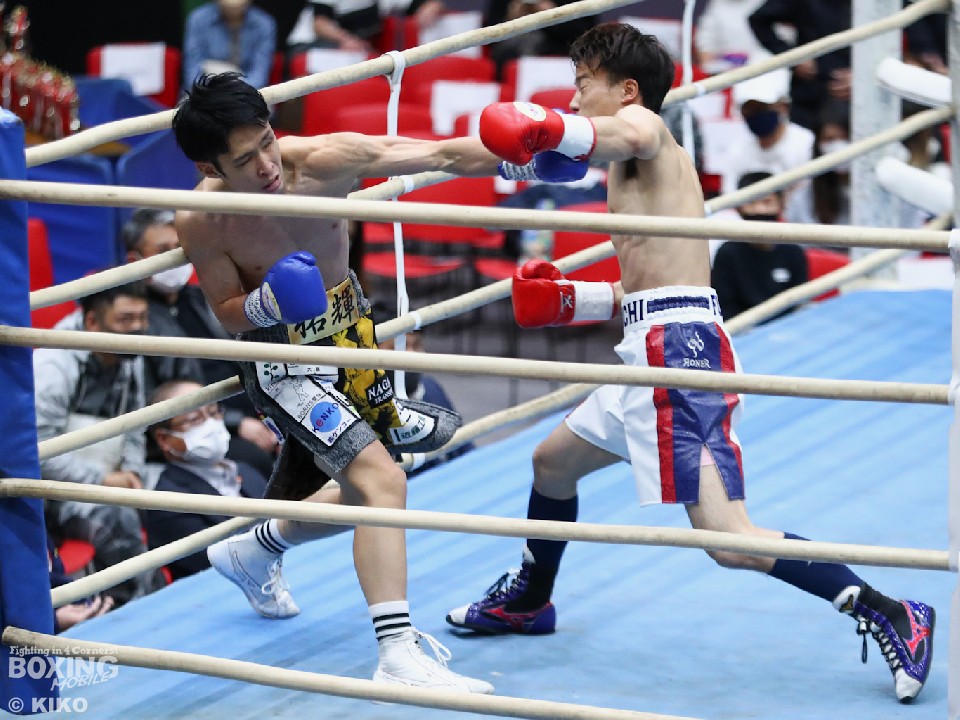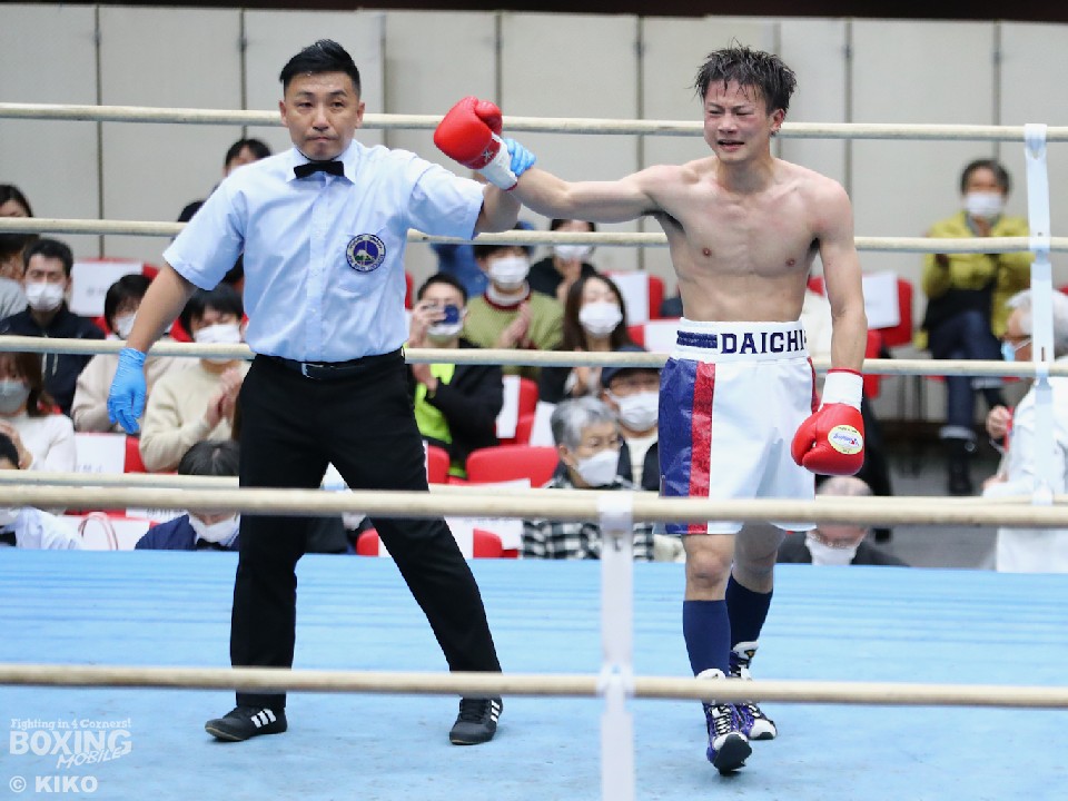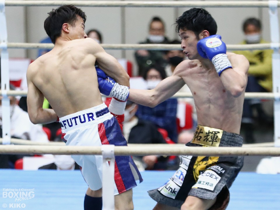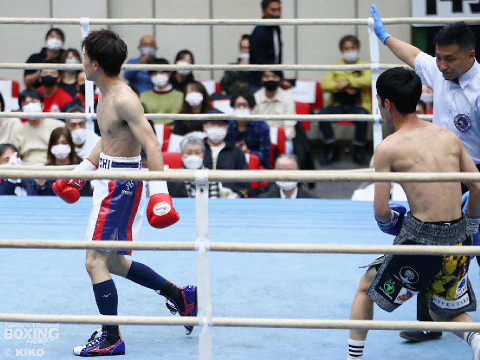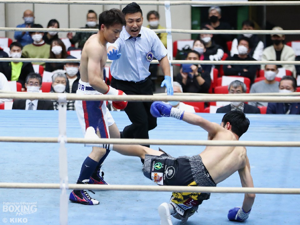 試合:サウスポー同士の一戦は、森野が思い切りの良い左スイングから仕掛けると森川はバックステップで回避。しかし、攻撃の手を緩めない森野は、ロープに追い詰めると左オーバーハンドから右を返してバランスを崩させるとレフェリーはダウンを宣告した。再開後、距離を詰めた相手に森川は左ストレートを合わせて倒し返した。しかし、ラウンド終了間際に森野は、左オーバーハンドで2度目のダウンを奪った。2回、森野は左ロングフックから右フックで3度目のダウンを演出。その後も森野がブンブンとパンチを振り回し、森川が迎え撃つ構図が続いた。逆転を狙う森川は4回、左を繰り出すが大振りになってしまい決定打を打ち込めず。森野も最後まで左右フックで攻め立てた。3度のダウンを奪った森野が全日本新人王決定戦にコマを進めた。
