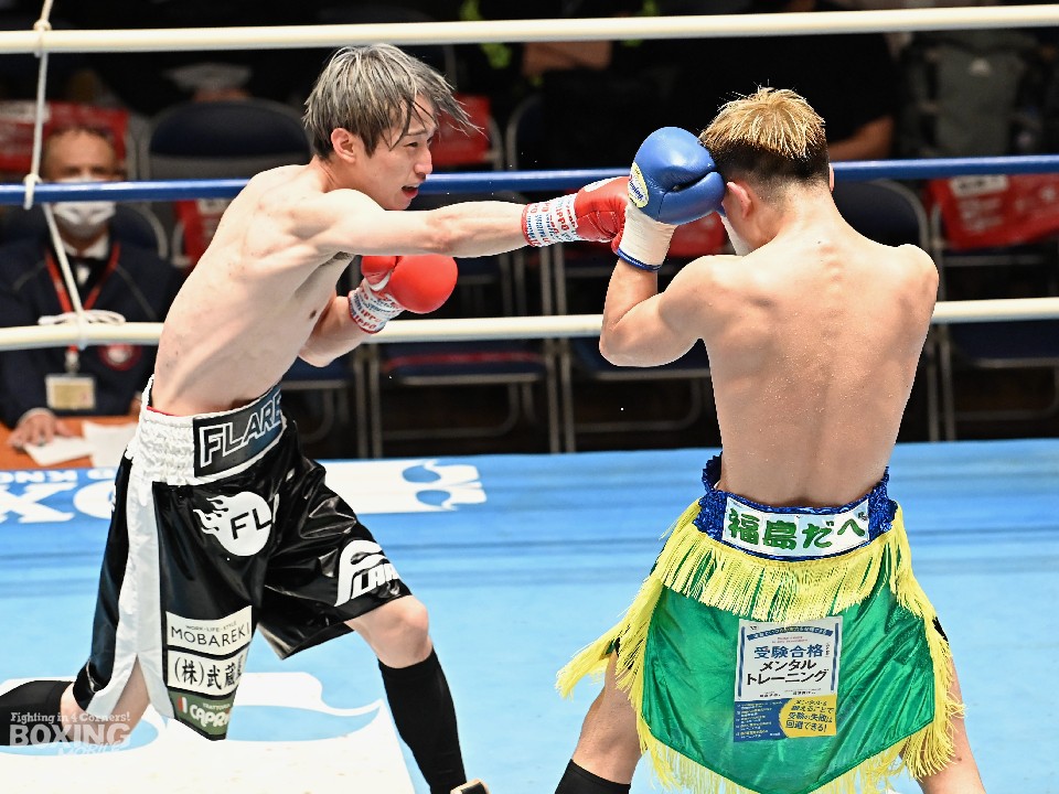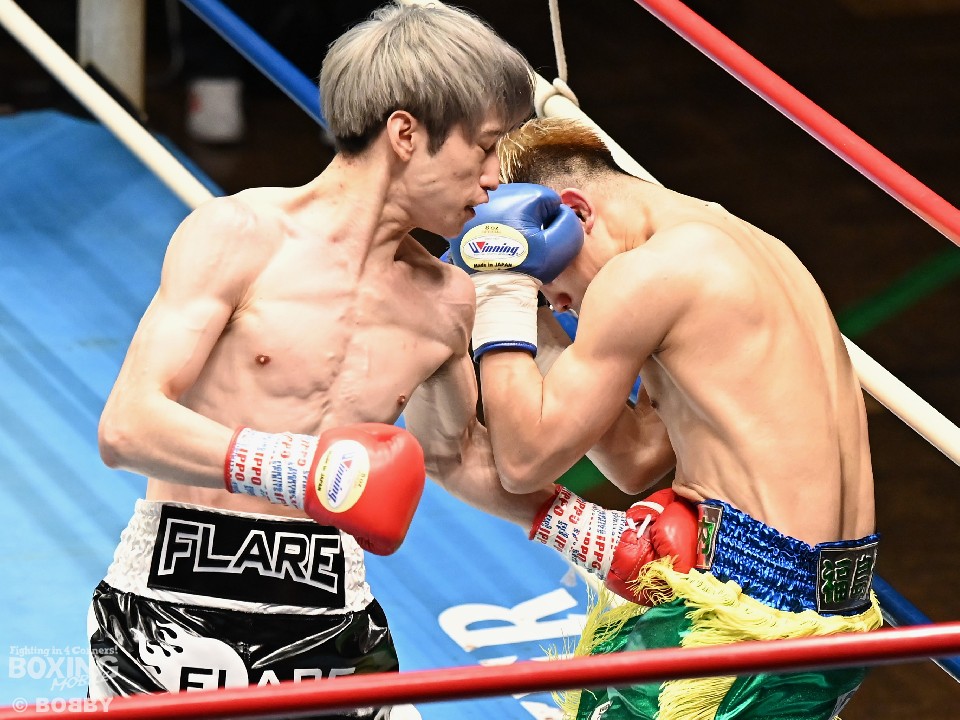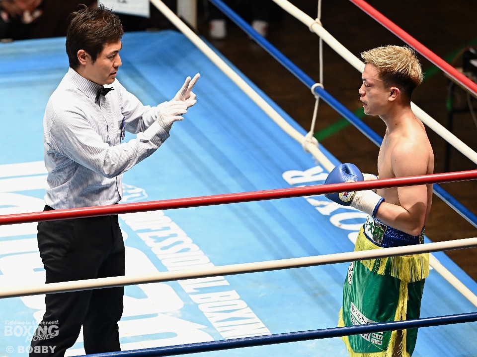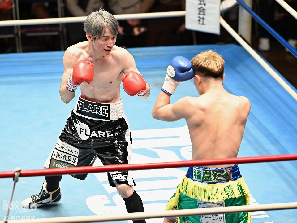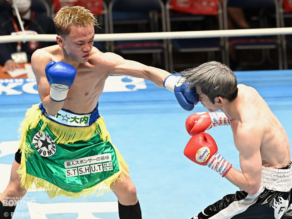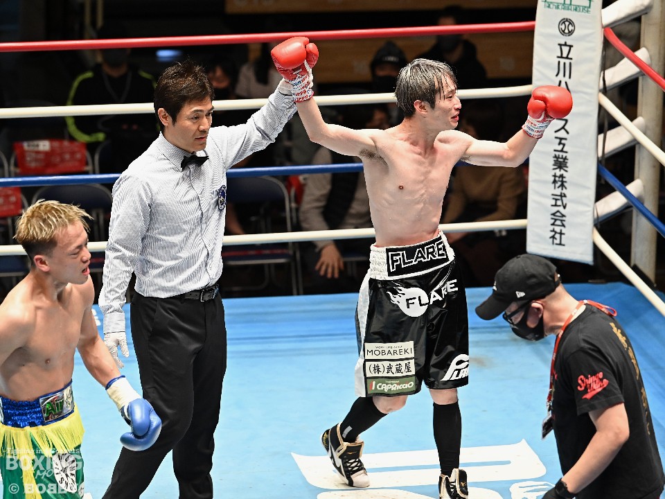 試合:小川がジャブを浴びせてリズムを作ると、ワンツーを好打。さらに右ショートアッパーでダウンを奪った。立ち上がった大内に迫ると右アッパー、ジャブでダメージを与えた。2回も小川は右をチラつかせながら左を軸にポイントを加点。失点を挽回したい大内は3回、出入りを意識したボクシングを見せるが、小川は長いリーチを活かしたジャブをヒット。4回、逆転を狙う大内はワンツーを打ち込むが、ここでも小川の有効打が勝った。小川が4戦目でうれしい初勝利を挙げた。