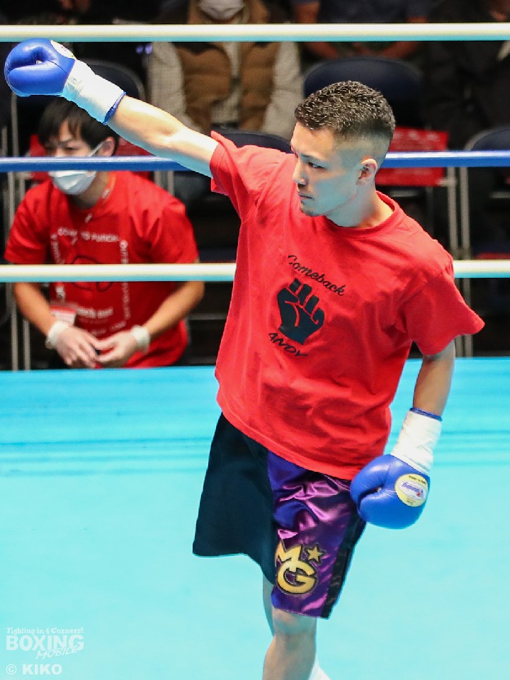 試合:アンディは距離を詰めてワンツーを繰り出すが、墨田は冷静に対応すると左ボディを痛打。一瞬、動きを止めるとワンツーを決めて見栄えの良さをアピールした。ペースを奪いたいアンディは2回、手数を増やして攻め立てるが、墨田は左ボディから右ストレートに繋げて優位を保った。3回、墨田は上下に打ち分けダメージを与えるとアンディ陣営から棄権の申し出された。