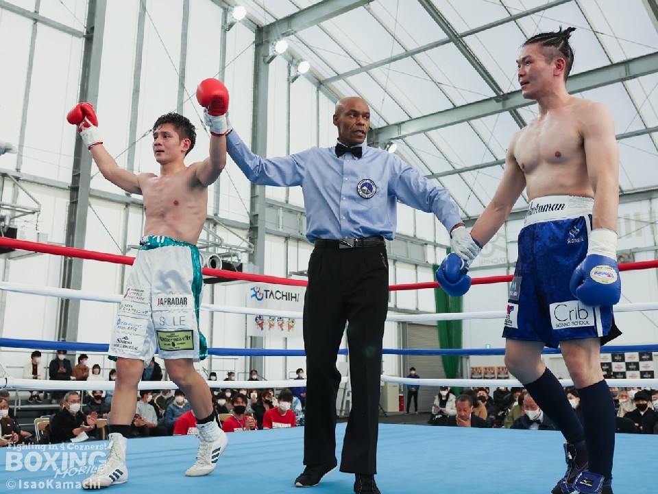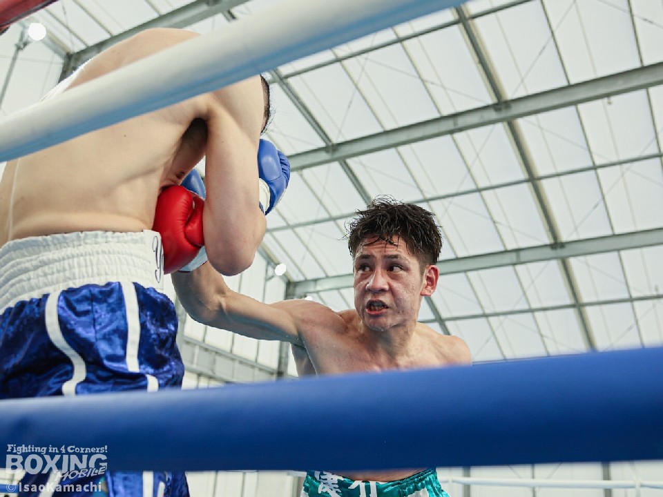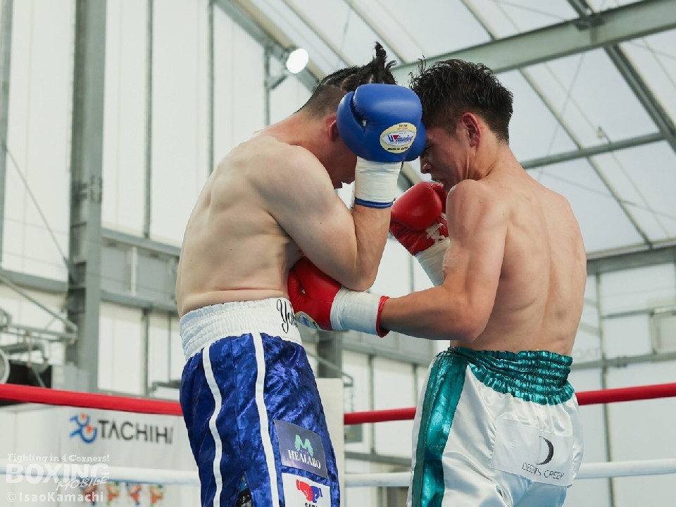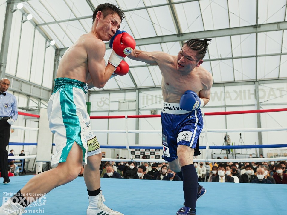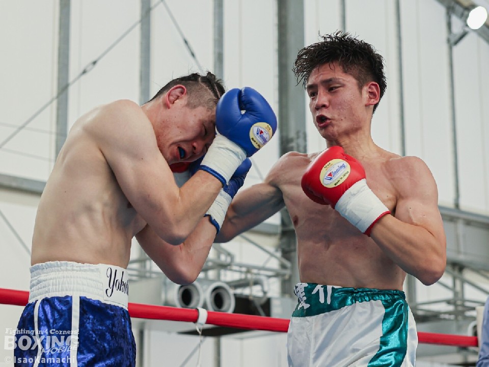 試合:1回、強気に前に出てくる鈴木に対してステップワークでかわそうとする横田。距離が詰まるとクリンチで逃れるがドンドン前へ出てくる鈴木に横田は余裕はない様子。2回、ジャブとサークリングで試合をコントロールしようとする横田だが鈴木の圧力が勝り接近戦へ。右ストレートや左フックを当てる鈴木。接近戦が増え揉み合うシーンが増える。3回、いきなりの右ストレートやジャブを左フックに軌道を変えて鈴木の前進を止めようとする横田だが後半は接近戦になり鈴木の被弾を受ける展開。4回、両者頭を付けてボディを打ち合うシーンが続き互角に打ち合いそのままゴングへ。前に出て圧力をかけ続けた鈴木の判定勝ち。