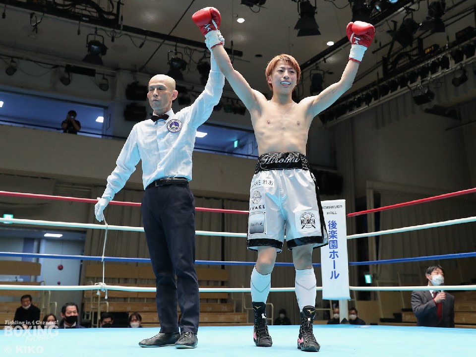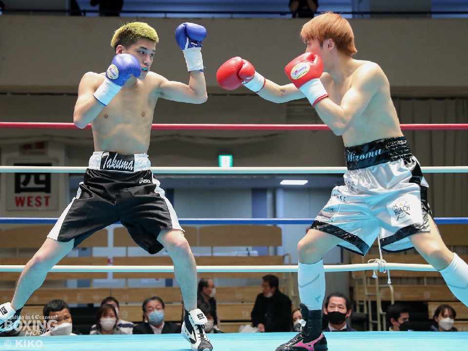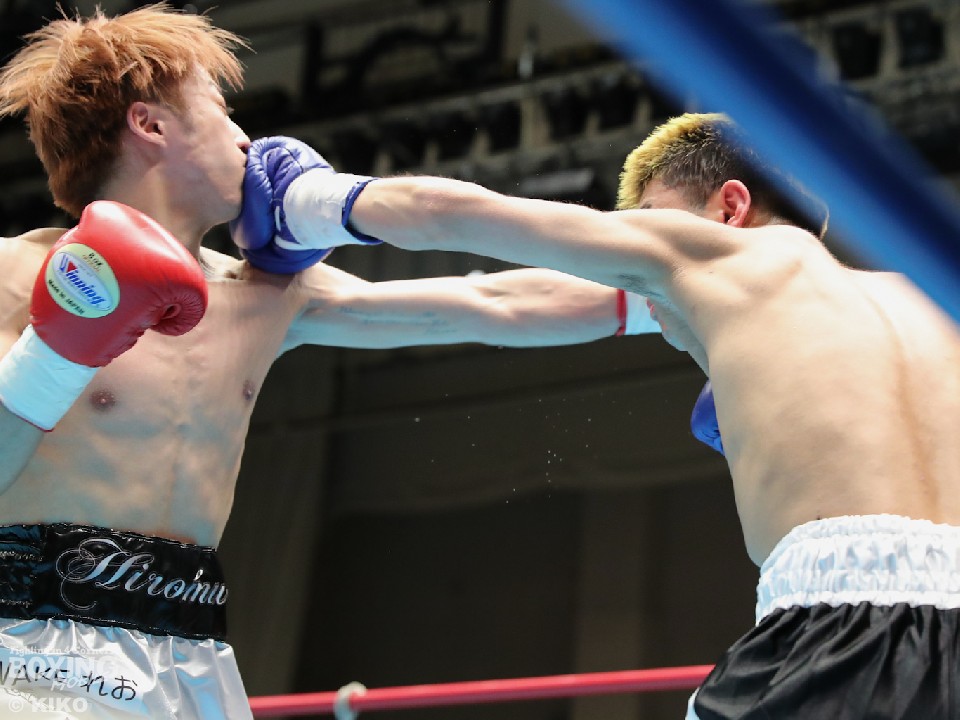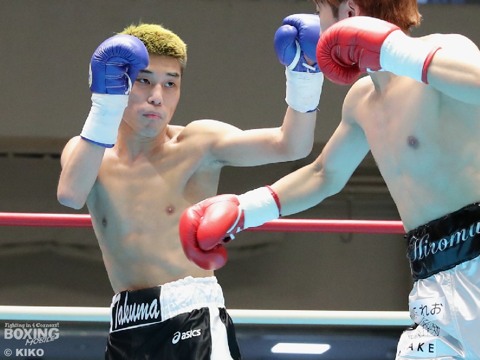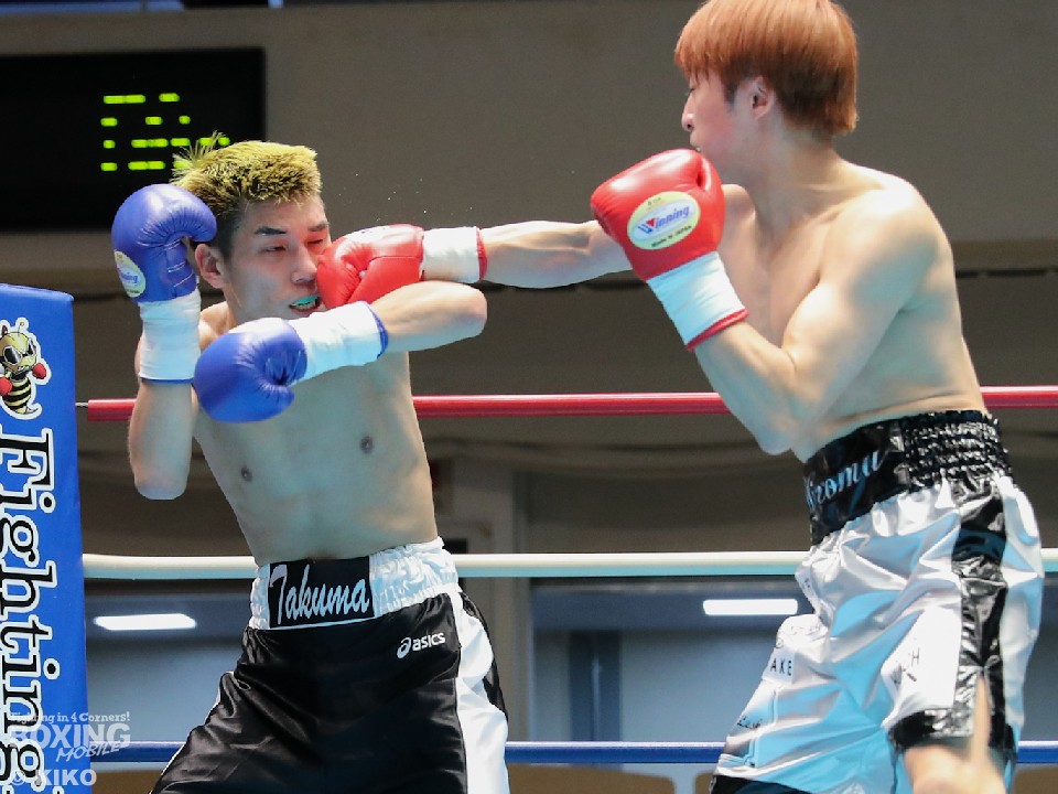 試合:サウスポー荒木がワンツーをヒットするが、拓真も負けじと右ストレートを好打。初回は荒木の思い切りの良い左オーバーハンドがジャッジに攻勢を印象付けた。2回、荒木は右フック、左ボディストレートを決めて攻め立てると、相手の打ち終わりに左ストレートを合わせてダウンを先取。再開後、左ストレートでキャンバスに沈めた。
