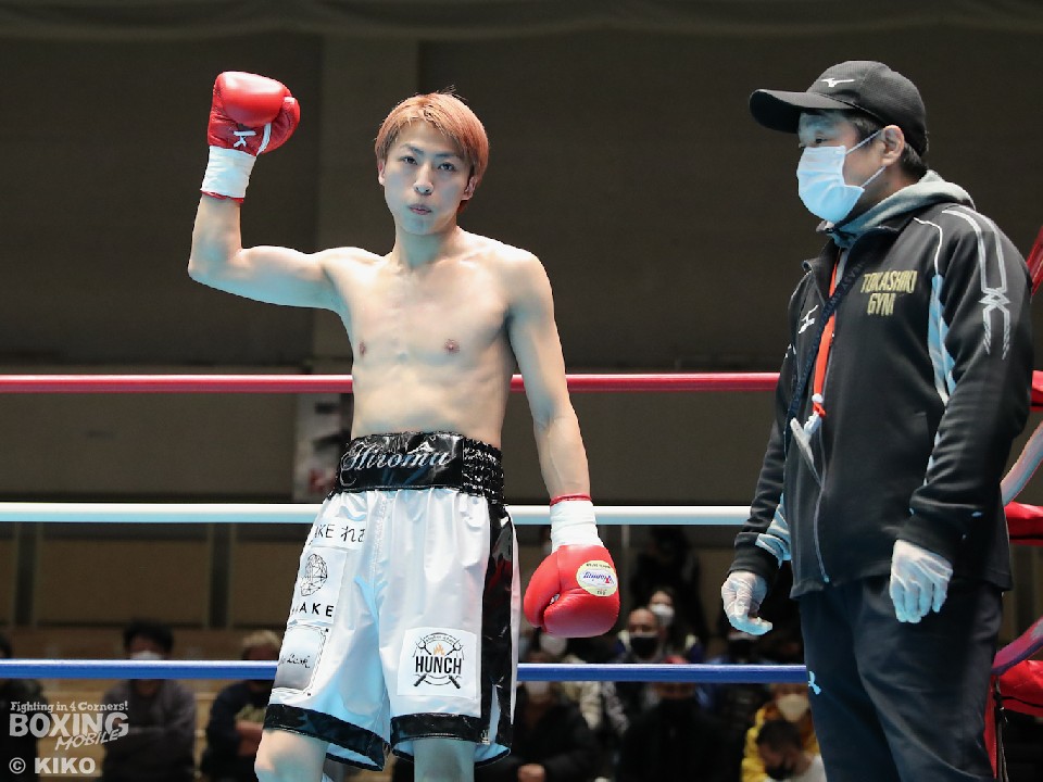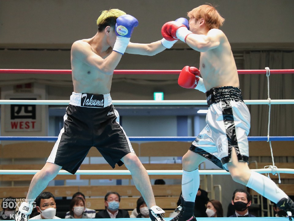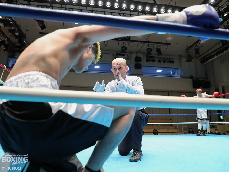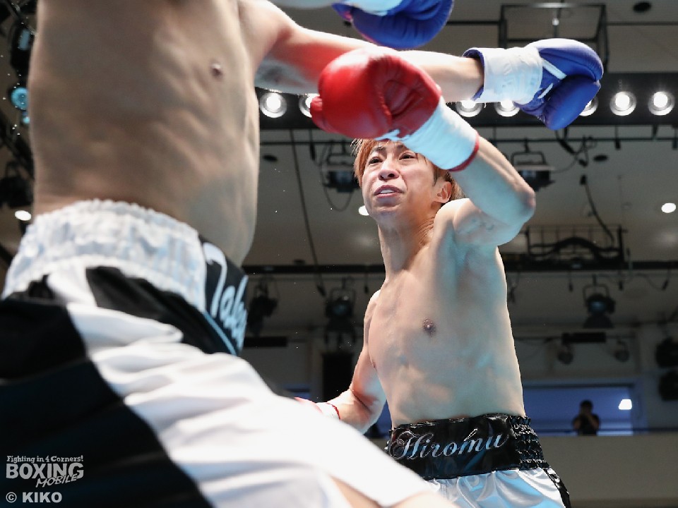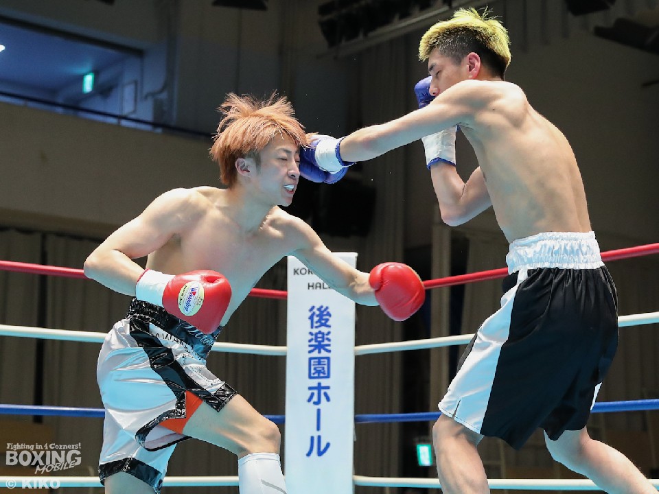試合:サウスポー荒木がワンツーをヒットするが、拓真も負けじと右ストレートを好打。初回は荒木の思い切りの良い左オーバーハンドがジャッジに攻勢を印象付けた。2回、荒木は右フック、左ボディストレートを決めて攻め立てると、相手の打ち終わりに左ストレートを合わせてダウンを先取。再開後、左ストレートでキャンバスに沈めた。