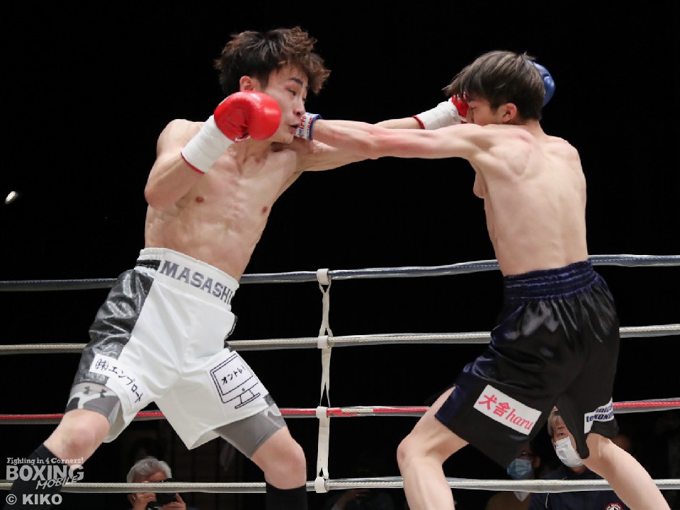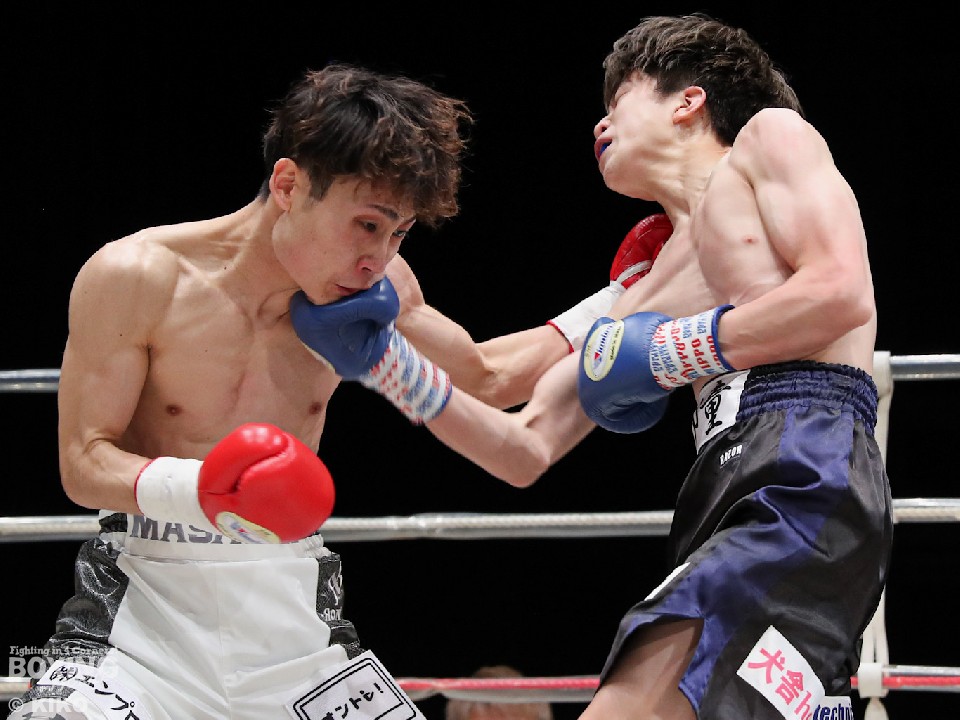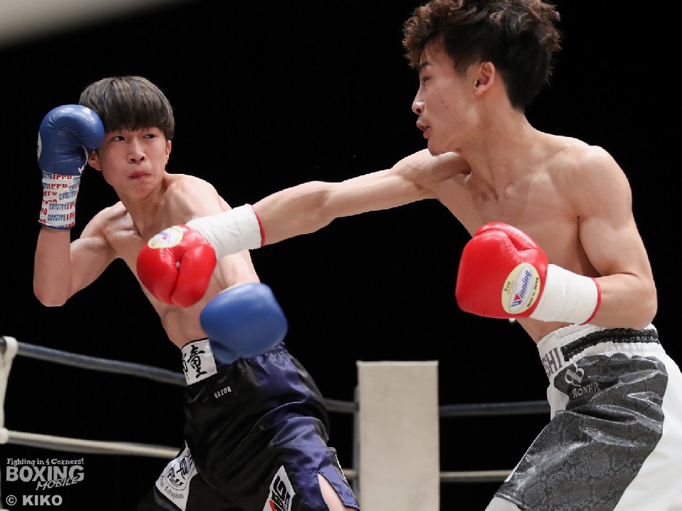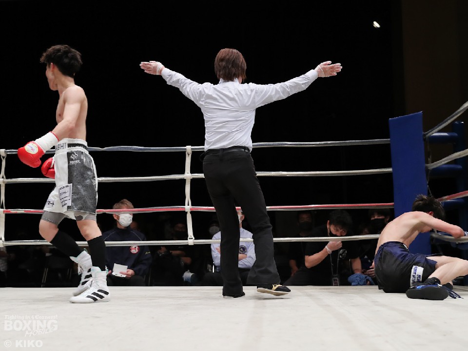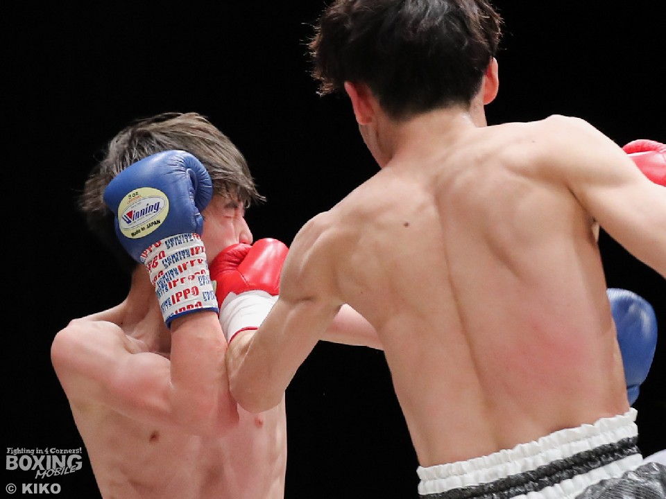 試合:青木はリングを大きく使い、前の手でタイミングを測り、右アッパー、右ストレートと上下に打ち分けテンポ良い攻撃を仕掛ける。対する池田はガードを上げながら、ジリジリと前に出てジャブ、ワンツーと繰り出し、フックで顔を弾き対抗。2回、池田はプレスをかけると、右ストレートでダウンを奪う。立ち上がった青木に猛然とラッシュをかけ、右フックで再度倒すとレフェリーは即座に試合を止めた。