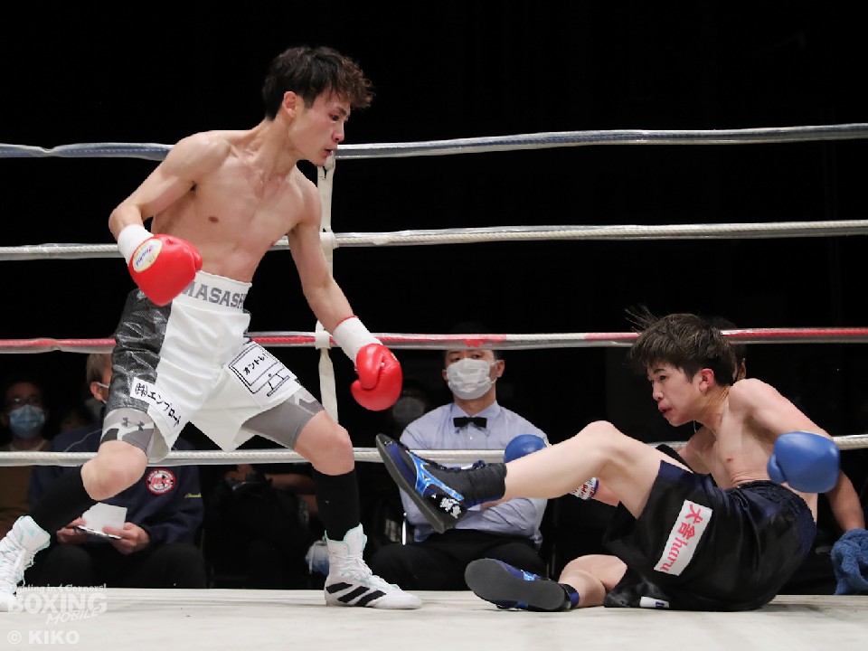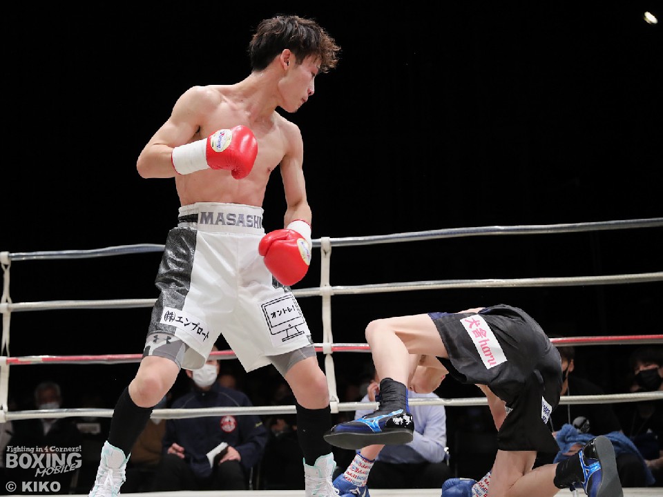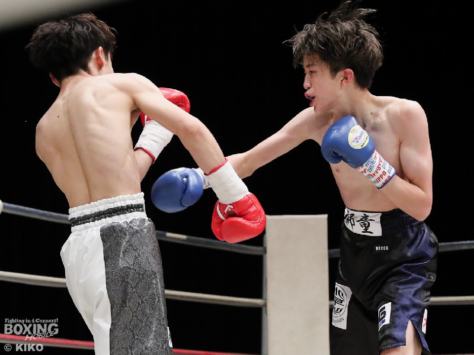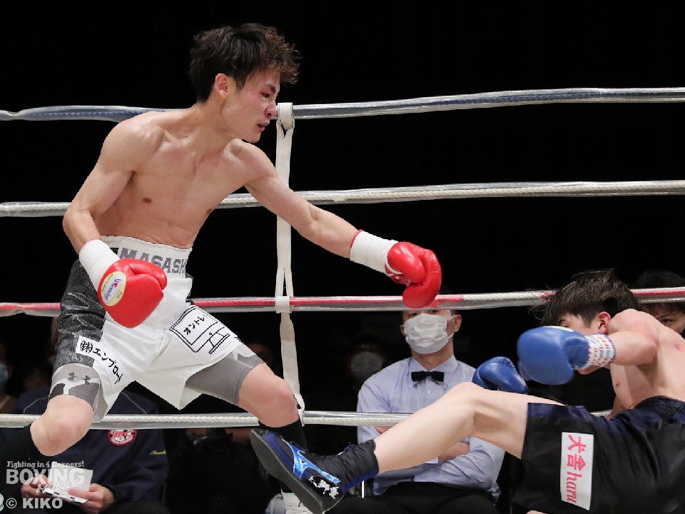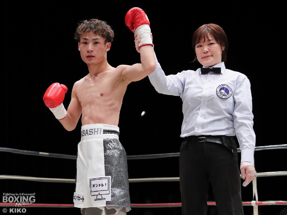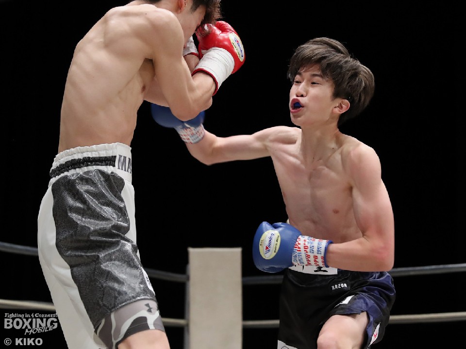 試合:青木はリングを大きく使い、前の手でタイミングを測り、右アッパー、右ストレートと上下に打ち分けテンポ良い攻撃を仕掛ける。対する池田はガードを上げながら、ジリジリと前に出てジャブ、ワンツーと繰り出し、フックで顔を弾き対抗。2回、池田はプレスをかけると、右ストレートでダウンを奪う。立ち上がった青木に猛然とラッシュをかけ、右フックで再度倒すとレフェリーは即座に試合を止めた。