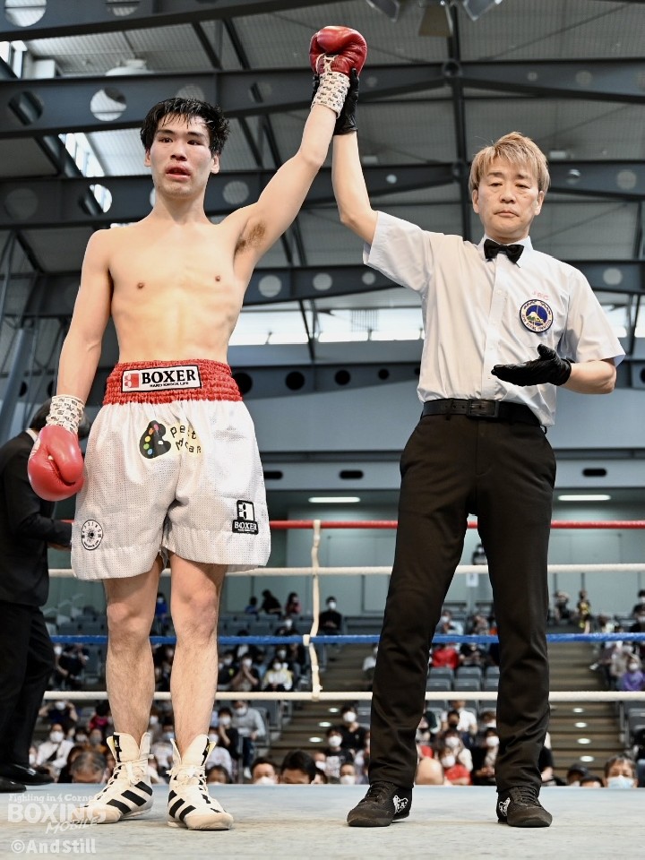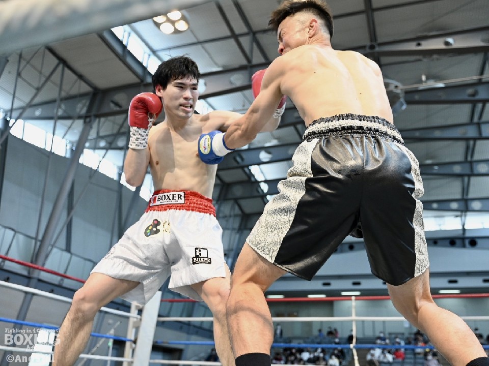 試合:ジャブを飛ばしながら距離を測る高井に対し、柳川はプレスをかけて右フックを振り向き片膝をつかせるとレフェリーはダウンを宣告。再開後も柳川は相手の打ち終わりに左フック、右フックを好打し顔面を紅潮させた。3回、柳川は左フックをヒットし優勢に進めるが、高井も必死にパンチを返して粘りを見せた。逆転を狙う高井は4回、ワンツー連打を繰り出すが、クリーンヒットを奪えず。お互いに体力の消耗が激しく決定打を打ち込むことができなかった。終始、ペースを握り続けた柳川が判定勝ちした。
