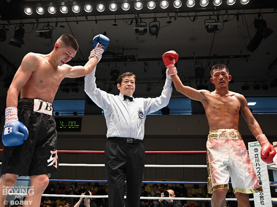 試合:中塚がステップを刻みながら上下に打ち分け積極的な攻撃を展開。山口はジャブから右ストレートに繋げて対抗。初回は中塚がアグレッシブに攻めた。2回、山口はジャブを軸に組み立てると右アッパーを好打。しかし、中塚は手数を増やしてペースを渡すまいと応戦。3回、我慢比べの打ち合いに突入。山口の右ショートアッパーが効果的に決まった。4回、中塚は左ボディからワンツー連打で勝負への執念を見せる。その後も激しい打撃戦が続いた。最終6回、山口はプッシュしながらワンツーで顔を弾くが、中塚も最後まで手数を落とさなかった。ジャッジ2者が引き分けとし勝敗がつかなかった。