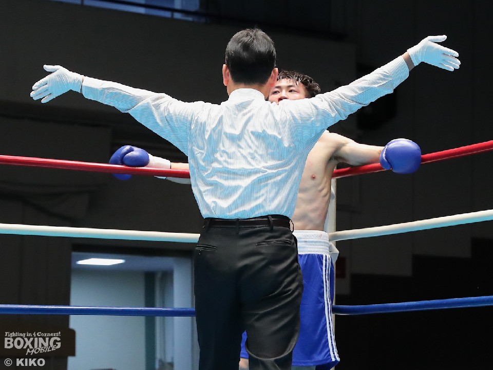 試合:中林がガードを固めて距離を潰して積極的な攻撃。後手に回った網野は左フックを返すが、中林はお構いなしとばかりにグイグイと攻め立てると右フックを好打。さらにコーナーに追い詰めて右フックでダウンをゲット。ファイティングポーズを取った網野だが10カウントが数え上げられた。