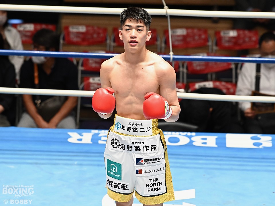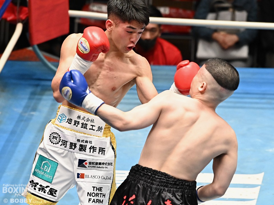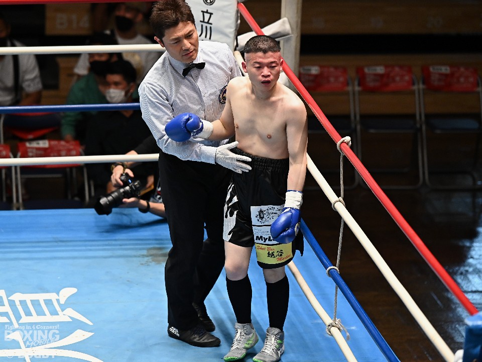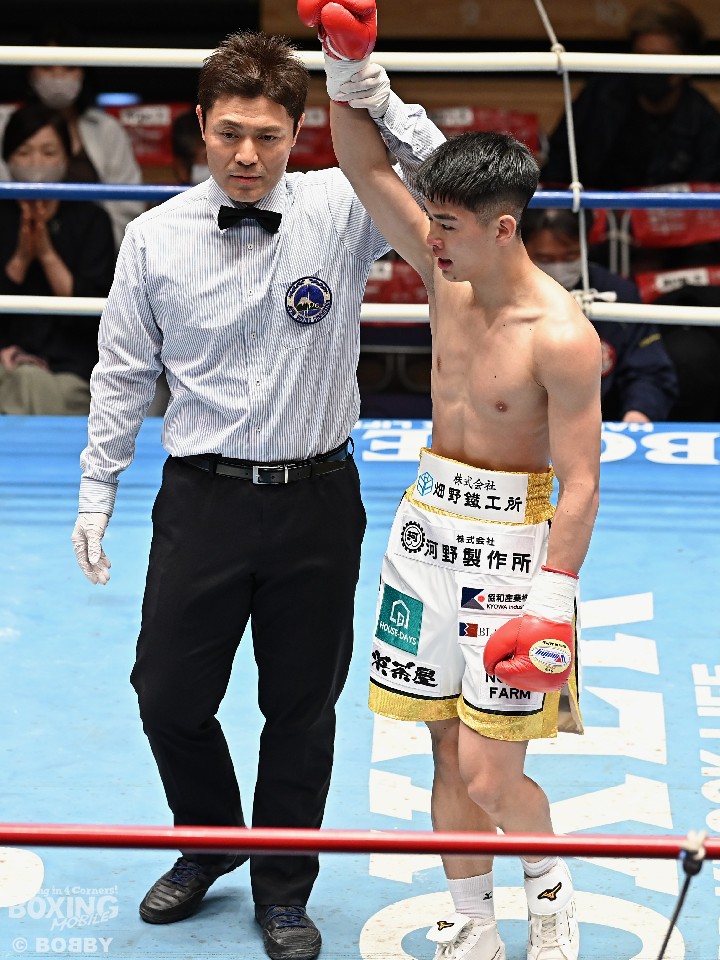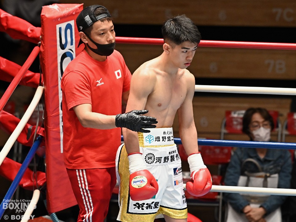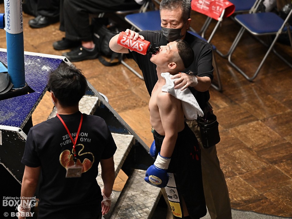 試合:19歳の竹野と34歳高澤による対戦。高澤が変則的な角度の左ボディから左アッパーを打ち込み先制攻撃を仕掛けるが、竹野は冷静に対応。上下に打ち分け着実にダメージを与えると左ボディで後退させて連打でレフェリーストップに持ち込んだ。