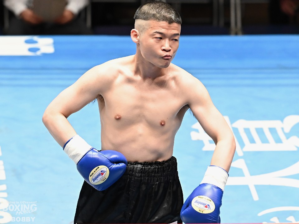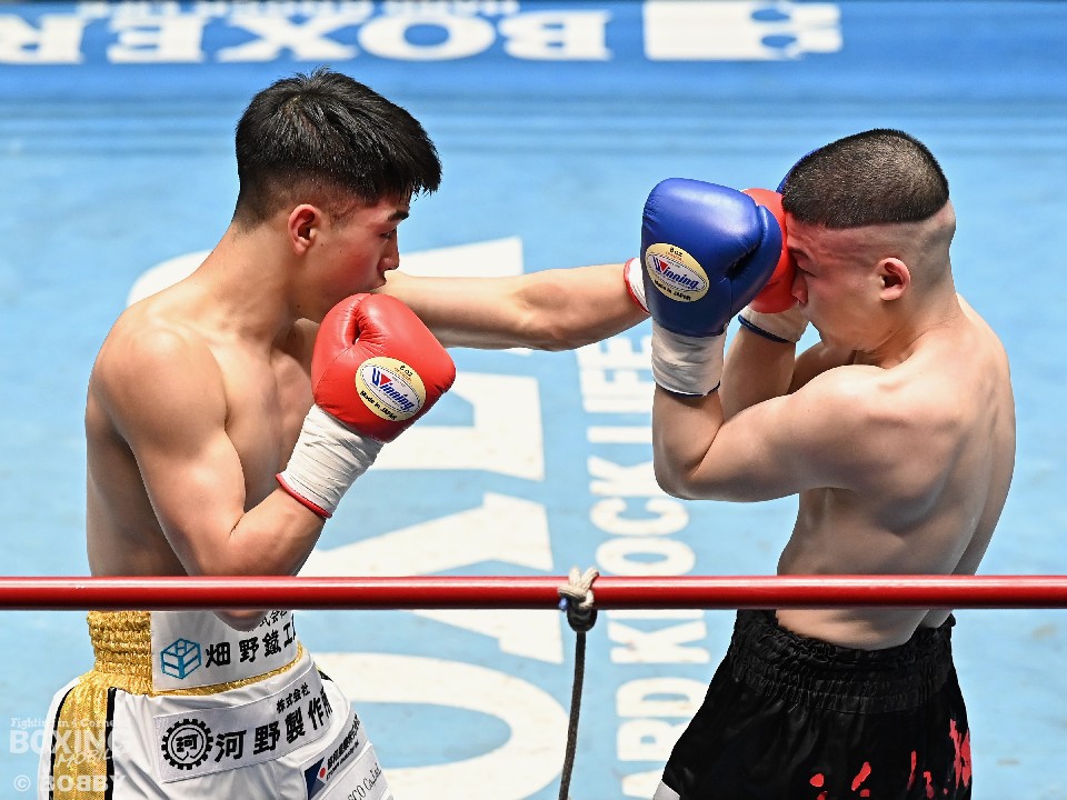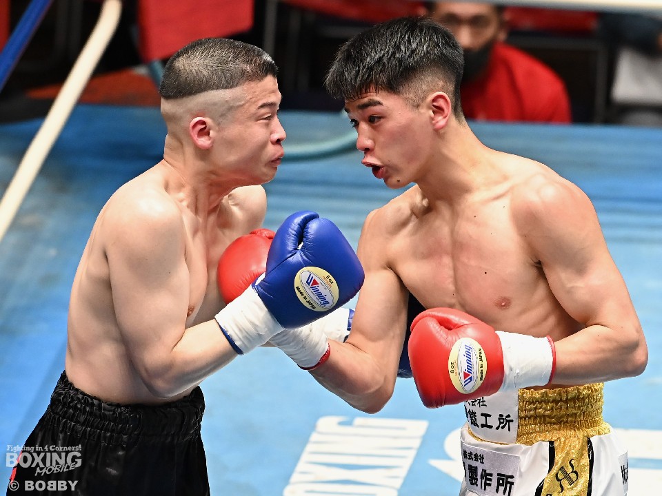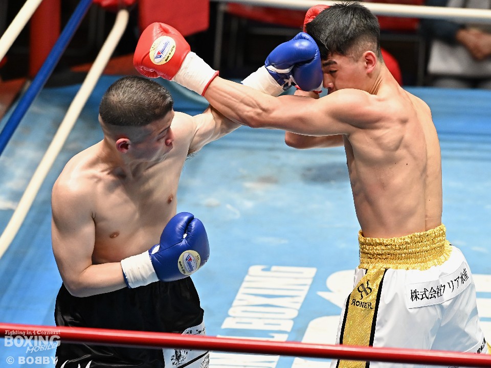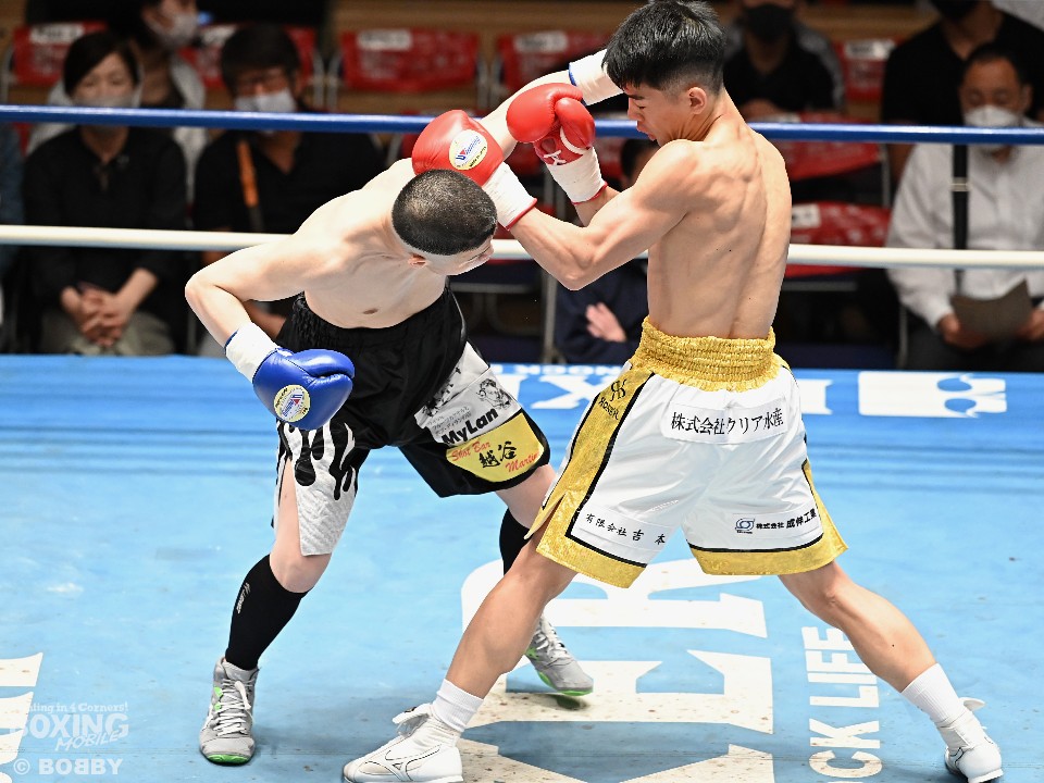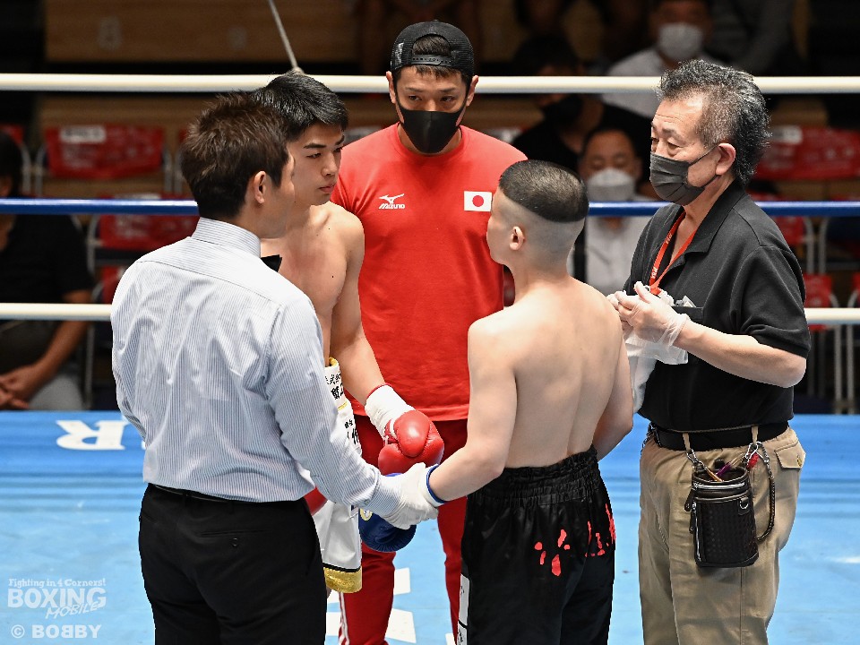 試合:19歳の竹野と34歳高澤による対戦。高澤が変則的な角度の左ボディから左アッパーを打ち込み先制攻撃を仕掛けるが、竹野は冷静に対応。上下に打ち分け着実にダメージを与えると左ボディで後退させて連打でレフェリーストップに持ち込んだ。