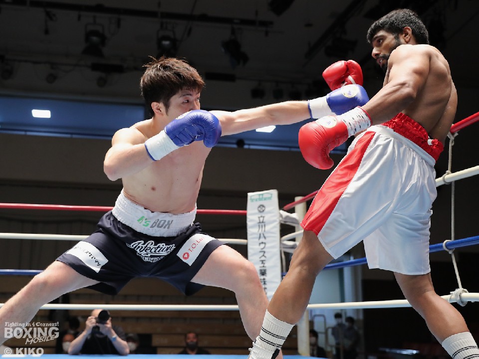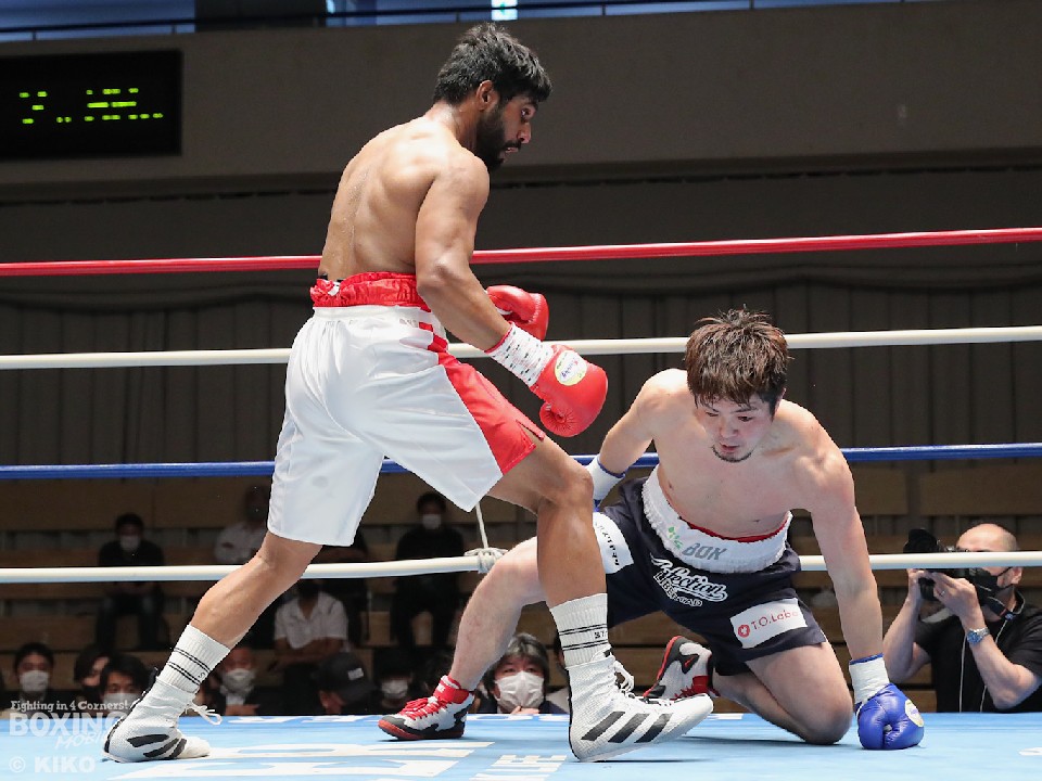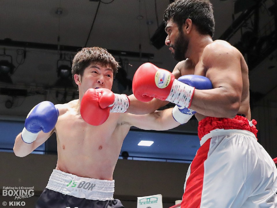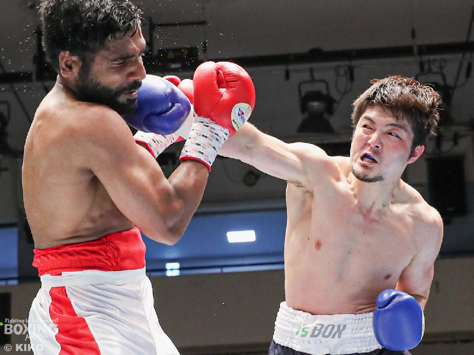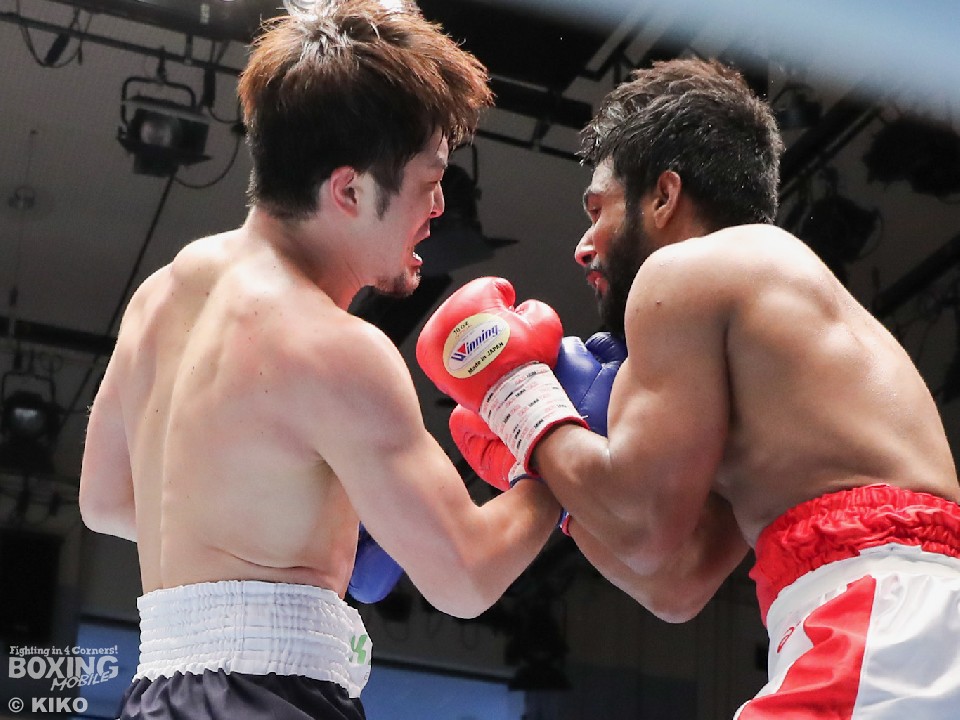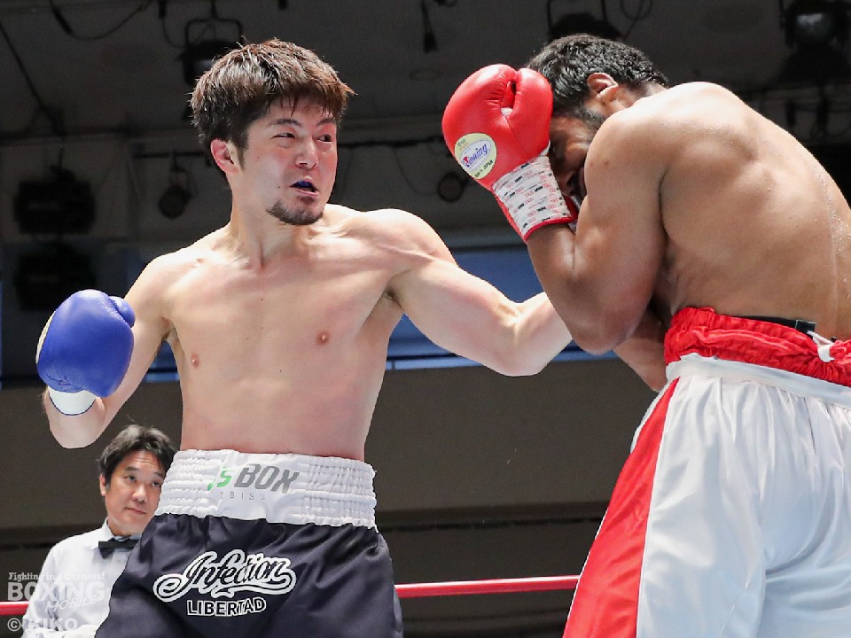 試合:インド出身のアンジュとキックボクシング第2代RISEスーパーライト級王者でボクシングに転向した左右田の対戦。アンジュが後ろ重心の構えから変則的な左で仕掛けると左右フックで先制攻撃。2回、アンジュは左フックでダウンを先取。守勢を強いられた左右田だが、左フックで棒立ちにさせるとチャンスとばかりに一気に攻め込み左フックで豪快に沈めた。左右田が逆転KOでデビュー戦を勝利した。