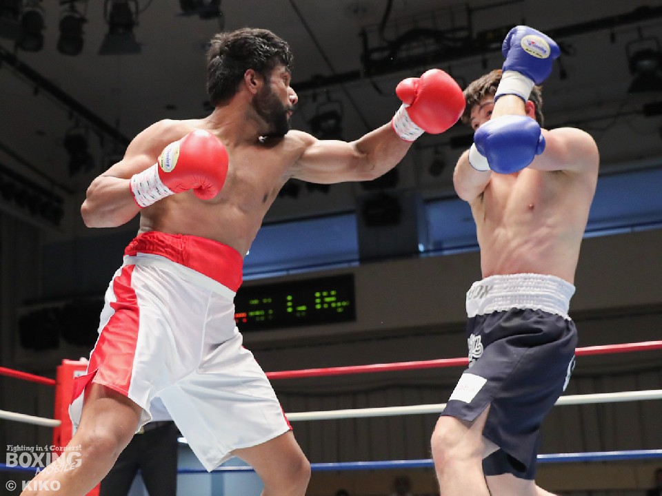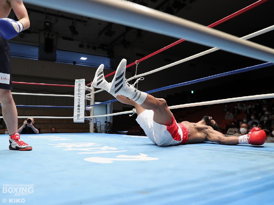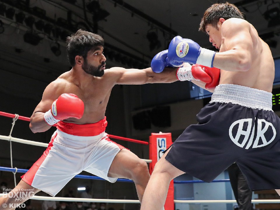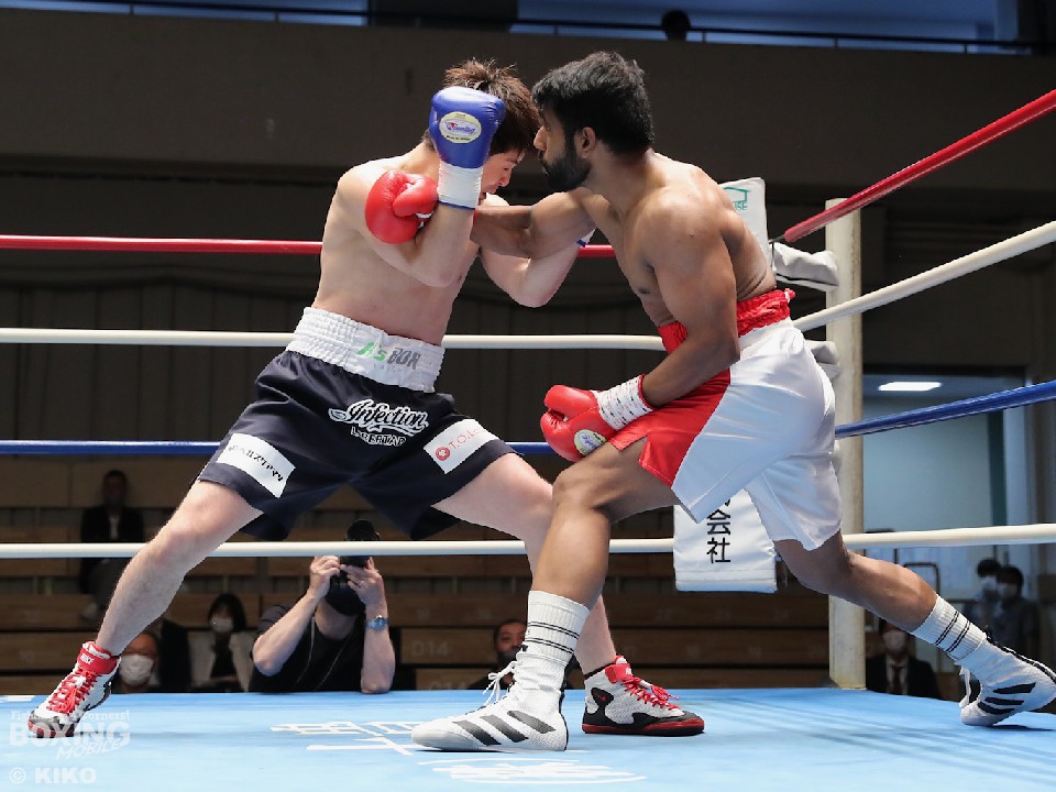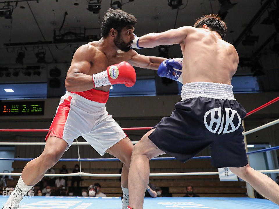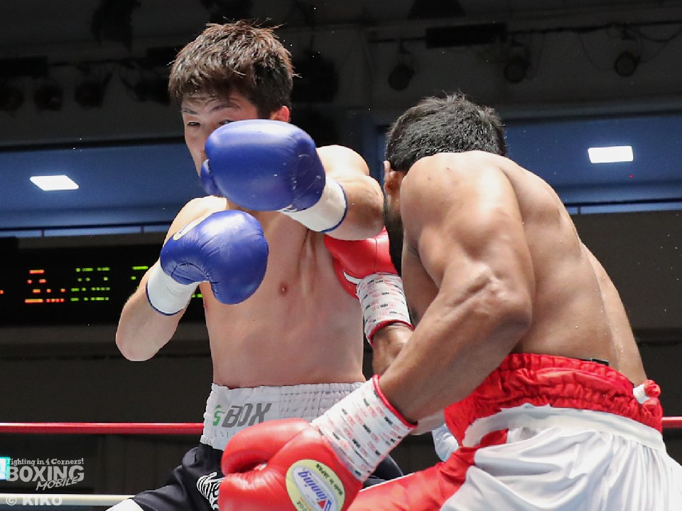 試合:インド出身のアンジュとキックボクシング第2代RISEスーパーライト級王者でボクシングに転向した左右田の対戦。アンジュが後ろ重心の構えから変則的な左で仕掛けると左右フックで先制攻撃。2回、アンジュは左フックでダウンを先取。守勢を強いられた左右田だが、左フックで棒立ちにさせるとチャンスとばかりに一気に攻め込み左フックで豪快に沈めた。左右田が逆転KOでデビュー戦を勝利した。