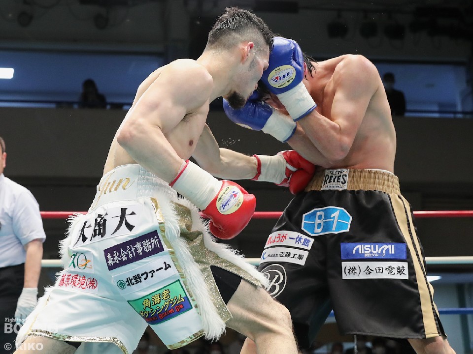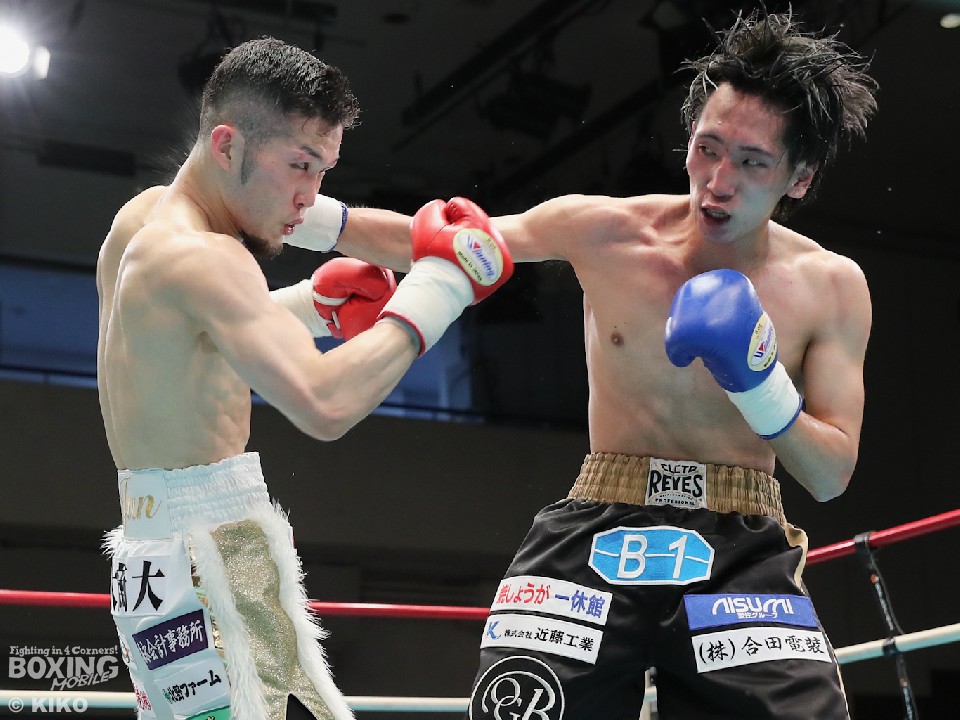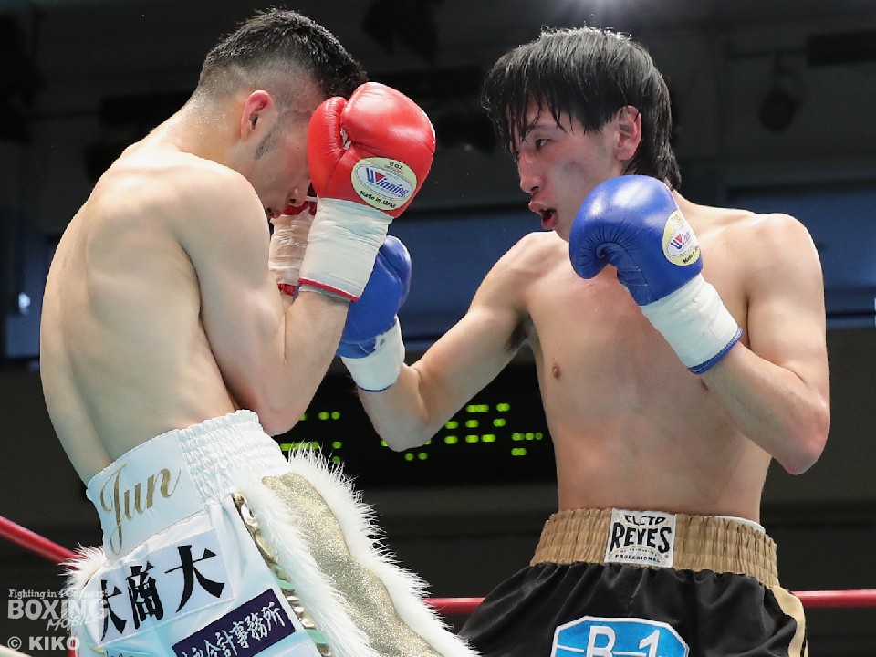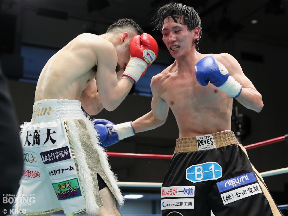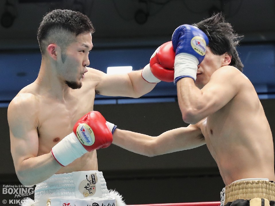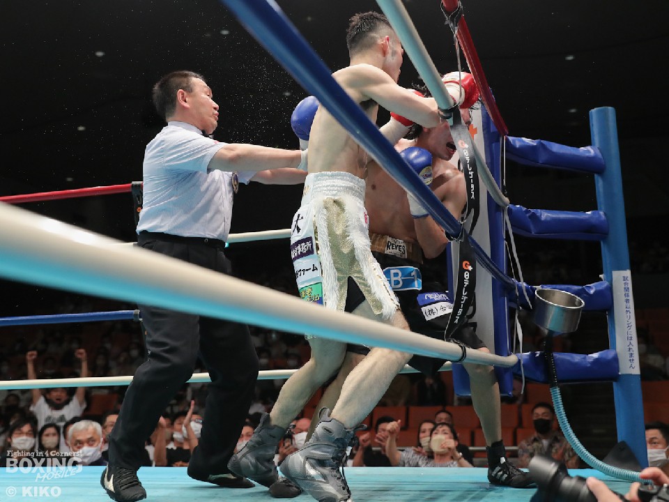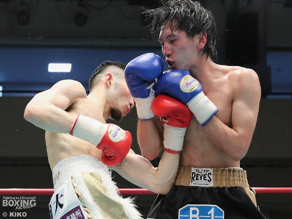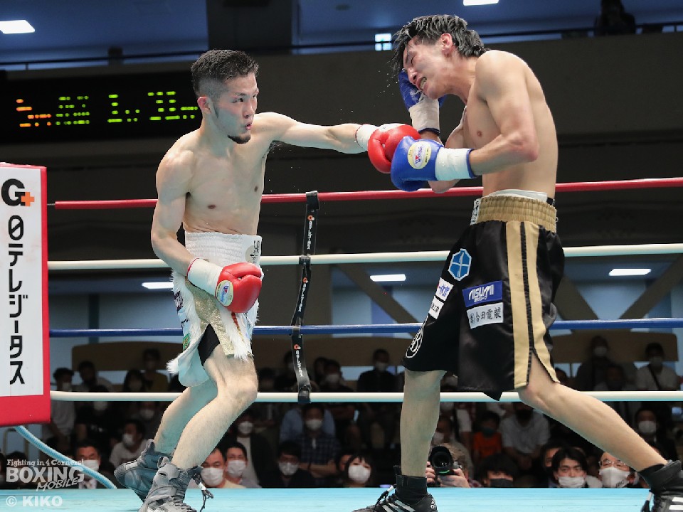 試合:アマチュアキャリアが豊富なサウスポー対決。中間距離で緊張感あふれる攻防を繰り広げる中、池側がワンツーで膝を揺らすと、連打で先手を奪うことに成功。2回、池側は前後の動きを意識しながら緩急をつけた攻撃でペースを維持。落合のカウンターを警戒しながらヒットを重ねた。流れを変えたい落合は3回、右ボディアッパーから仕掛けるが、池側は左カウンターで顔を弾くとパンチをまとめて見栄えの良さをアピール。5回も池側は右ボディを痛打すると多彩なコンビネーションを決めた。6回も池側のラウンド。左カウンターでグラつかせるとパンチをまとめてフィニッシュを狙ってラッシュした。8回、池側はジャブでチャンスを伺うと左アッパーを直撃。足元がふらついた落合を見てレフェリーが割って入った。