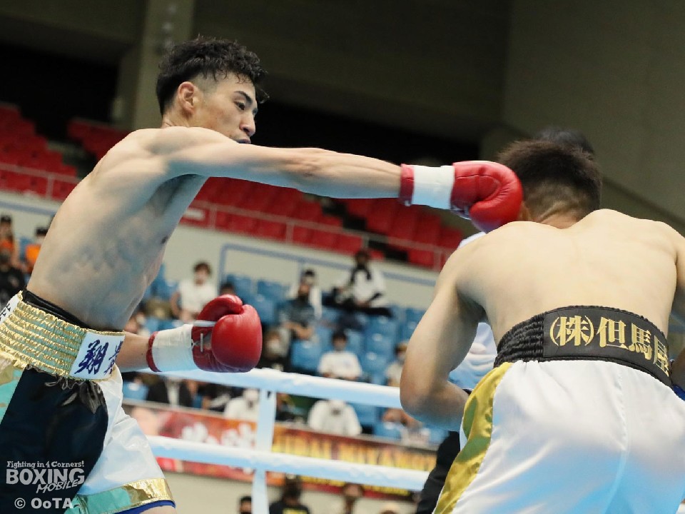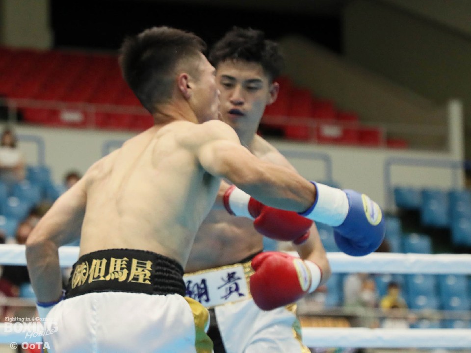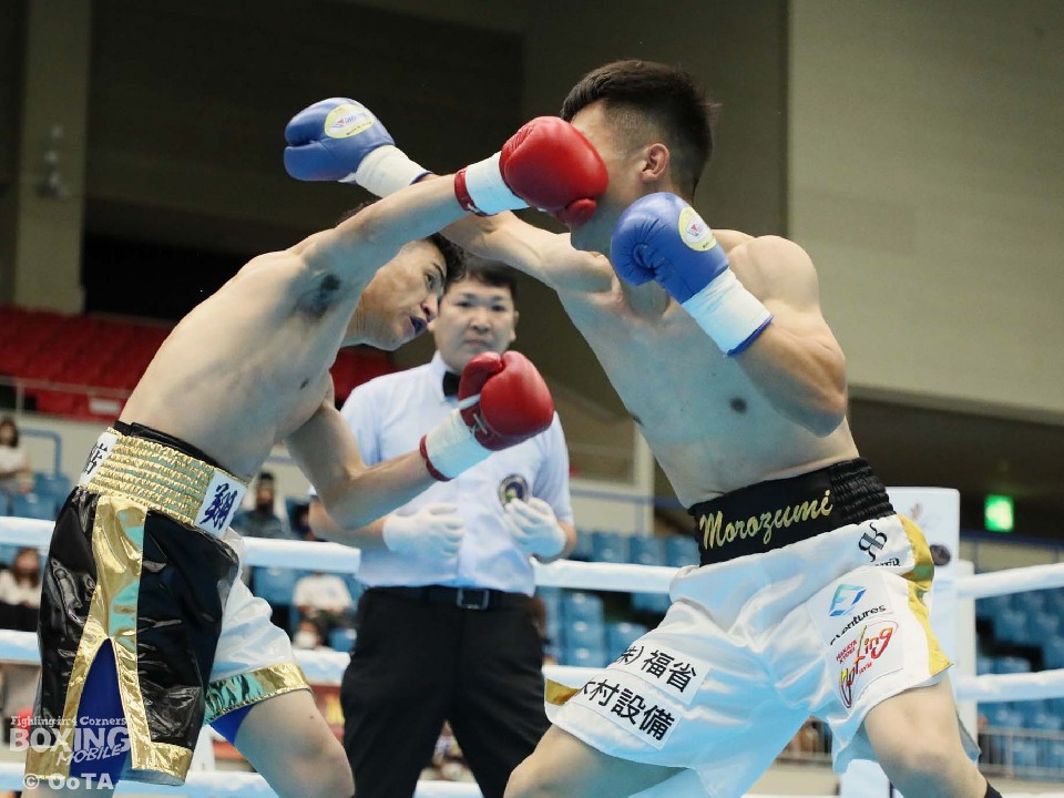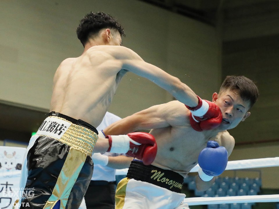 試合:中間距離での探り合いからサウスポー両角の左ストレートがヒット。山内はジリジリと距離を詰めるが右につなげられず。2回、山内のいきなりの右ストレートが当たり出すと両角も真っ向から応戦。すると、山内がワンツーでガクッと腰を沈めさせると一気にラッシュ。防戦一方になった両角を見てレフェリーが割って入った。熊本県出身の山内が見事にKO勝ちした。