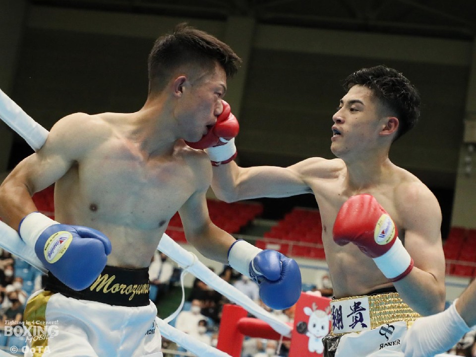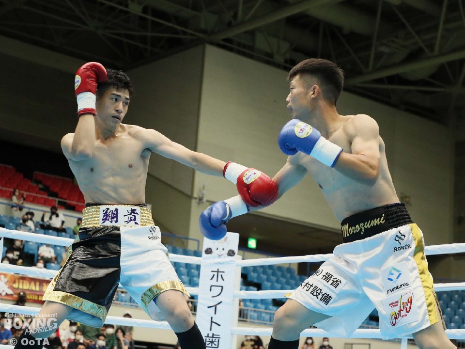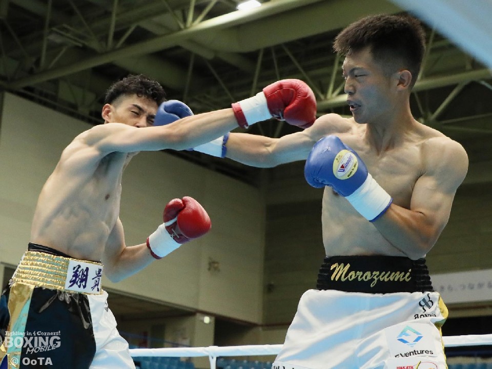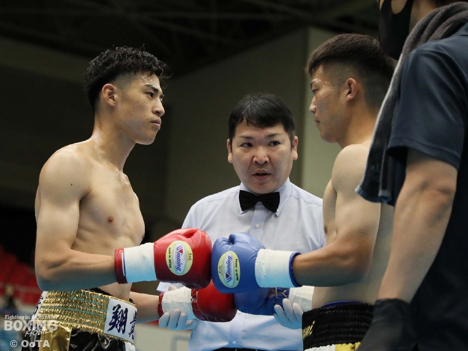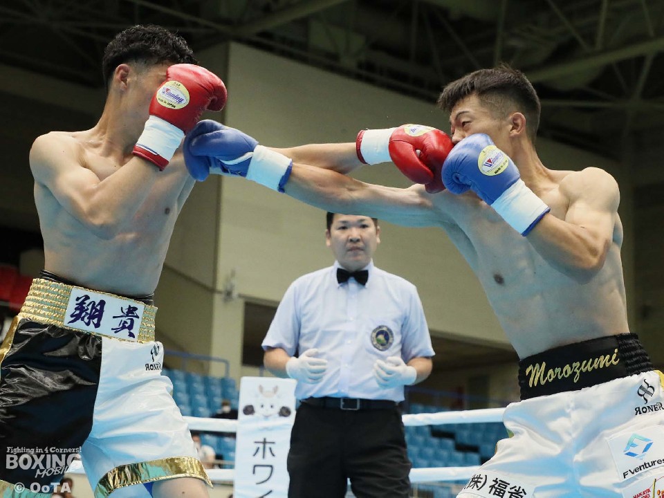 試合:中間距離での探り合いからサウスポー両角の左ストレートがヒット。山内はジリジリと距離を詰めるが右につなげられず。2回、山内のいきなりの右ストレートが当たり出すと両角も真っ向から応戦。すると、山内がワンツーでガクッと腰を沈めさせると一気にラッシュ。防戦一方になった両角を見てレフェリーが割って入った。熊本県出身の山内が見事にKO勝ちした。