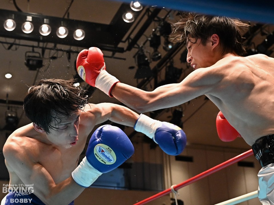 試合:サウスポー荒木が打ち終わりに右フックを決めれば、森はステップインから右ボディで対抗。距離の探り合いとなるが、ラウンド終盤、荒木はワンツーから連打で攻勢をかけた。2回、荒木は左ボディストレート、右フックを好打し見栄えの良さをアピール。3回も荒木のラウンド。足を使いながら決定打を避けると単発の右ボディをヒット。さらに右フックでグラつかせてチャンスを作った。最終4回、逆転を狙う森は右ストレートで顔を弾くとワンツーでダウンを演出。再開後、パンチをまとめたが荒木も粘りを見せた。前半の貯金を守った荒木が逃げ切った。