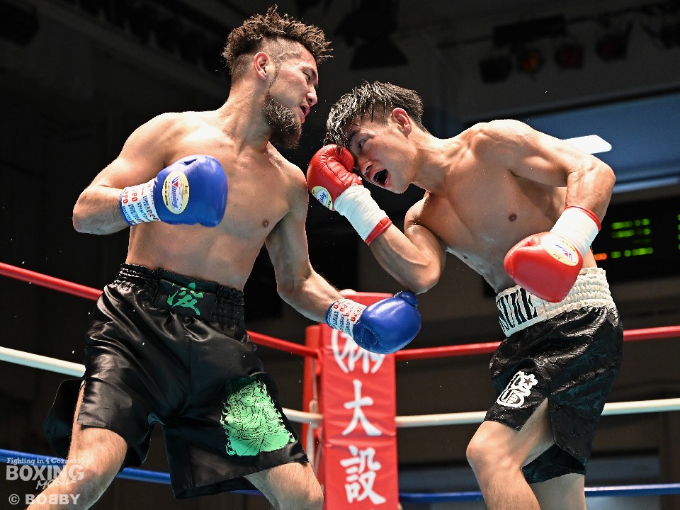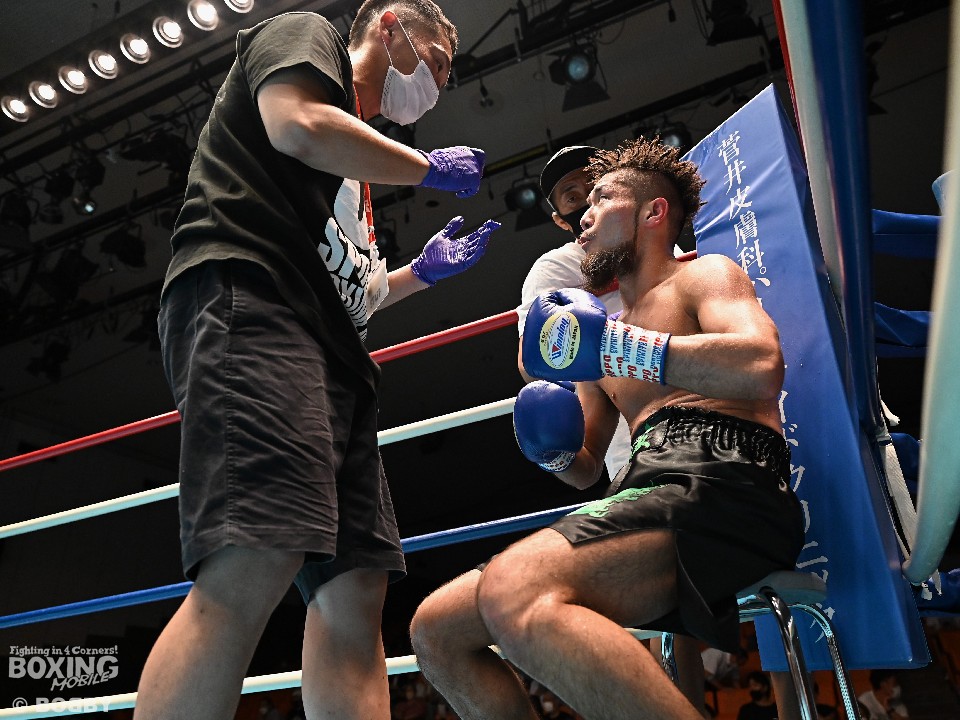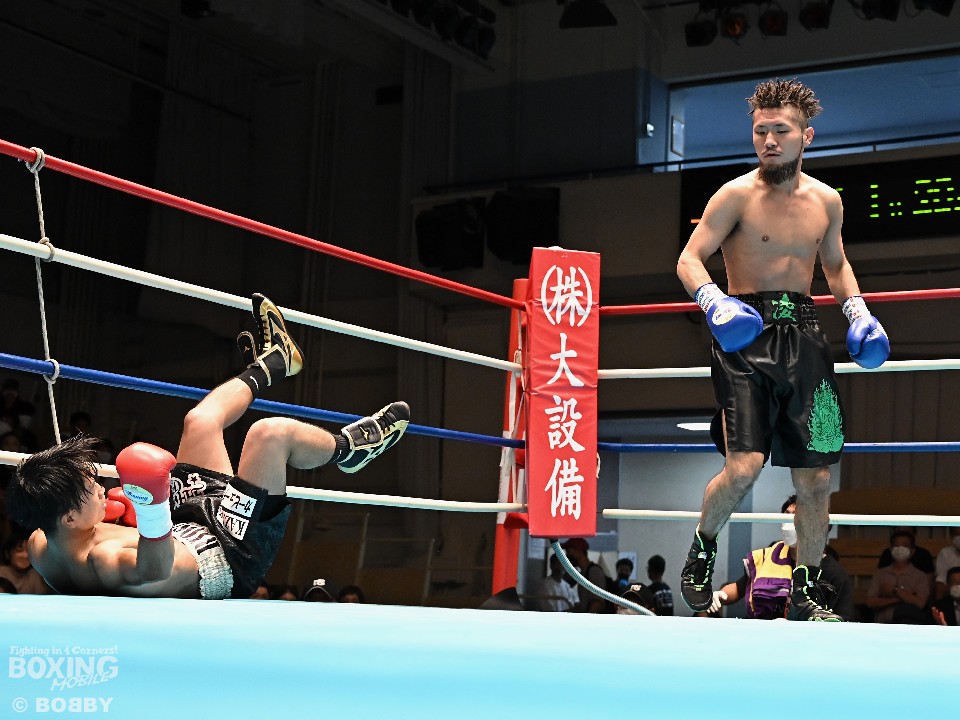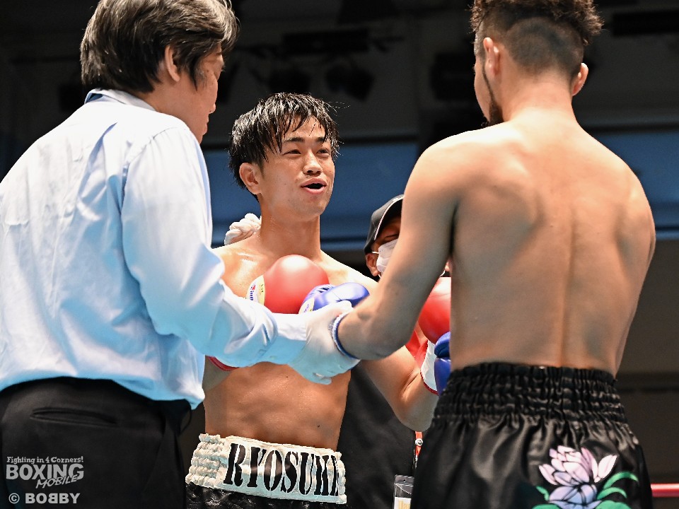 試合:星野が頭を振りながらジワリジワリと距離を詰めると、相手の右を外してて左フックでダウンを奪う。再開後、星野は慌てずにじっくりと攻めた。2回、丸田はワンツー連打で反撃に転じるが、星野は右ストレートを合わせて2度目のダウンをゲット。必死にパンチを繰り出す丸田だが、星野はガッチリとガードすると左ボディを突き刺しペースを維持した。最終4回、頭をつけての打ち合いとなるが、決定打は生まれなかった。星野がジャッジ3者ともにフルマークの判定勝ちを飾った。