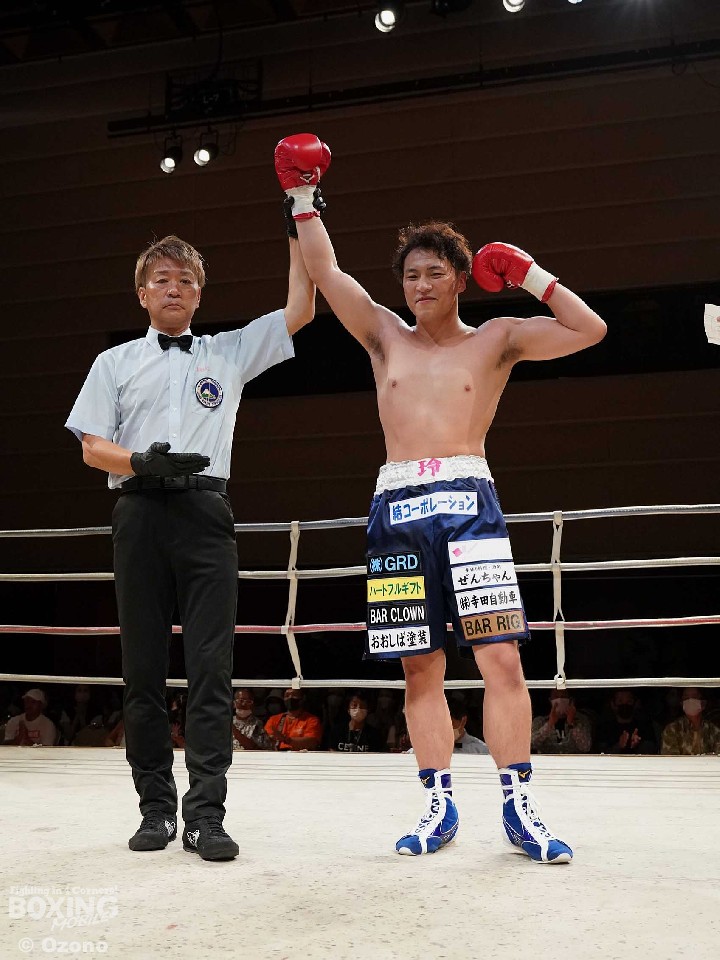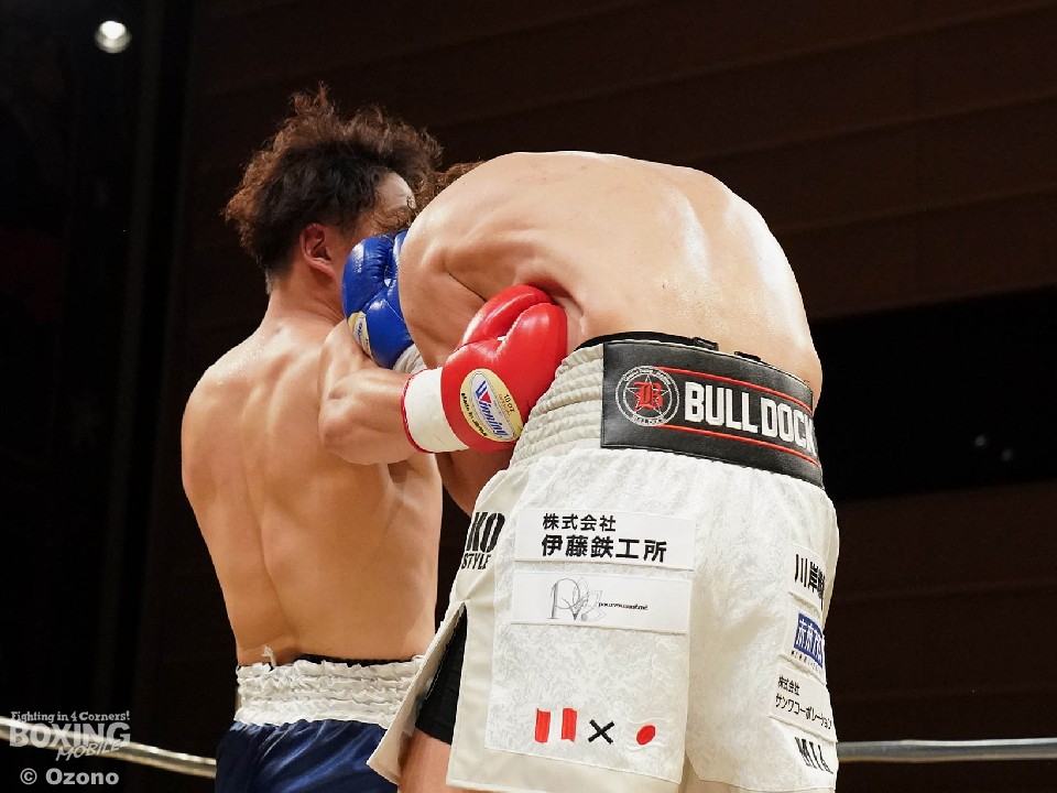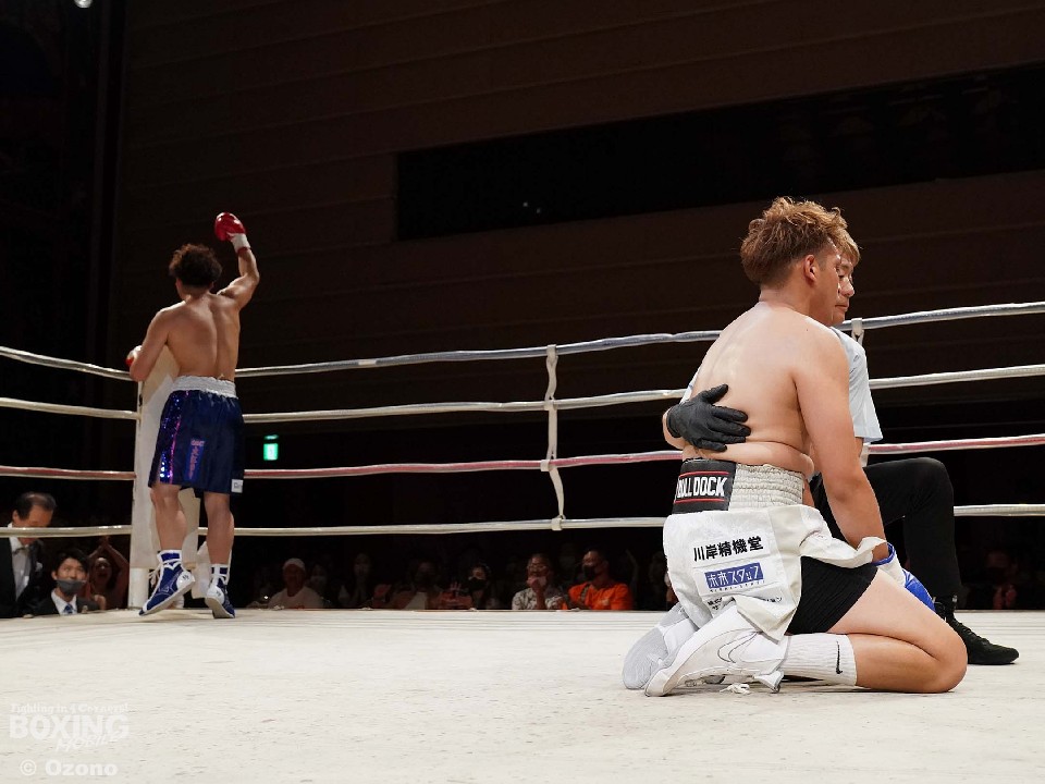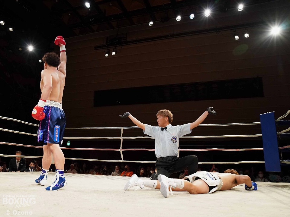 試合:アマチュアキャリア豊富な両者による対戦。サウスポー仲野は右ボディ、左ボディストレートを打ち込むが、上江洲はガッチリとガード。しかし、仲野は果敢に攻めると右フックでダウンを奪った。勝負が決まったのは2回。仲野は上下の打ち分けから右フックを振り抜き2度目のダウンを演出。レフェリーはノーカウントで試合をストップした。鮮やかなKO勝ちを飾った仲野がデビュー戦を勝利した。