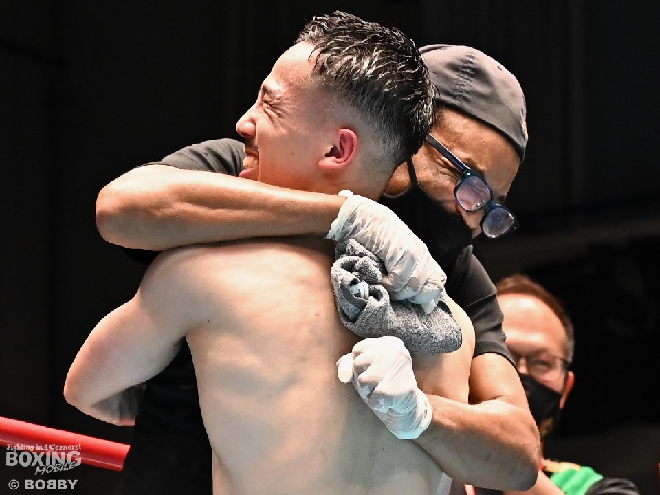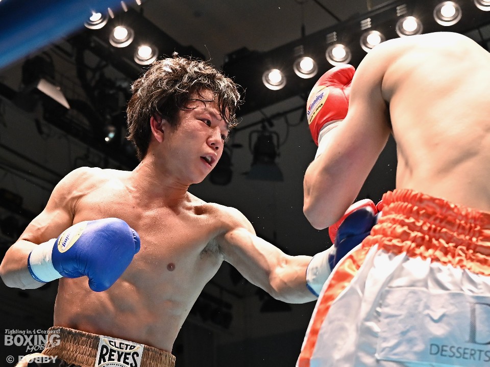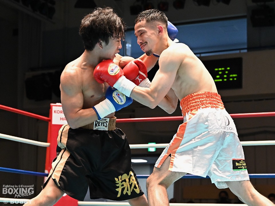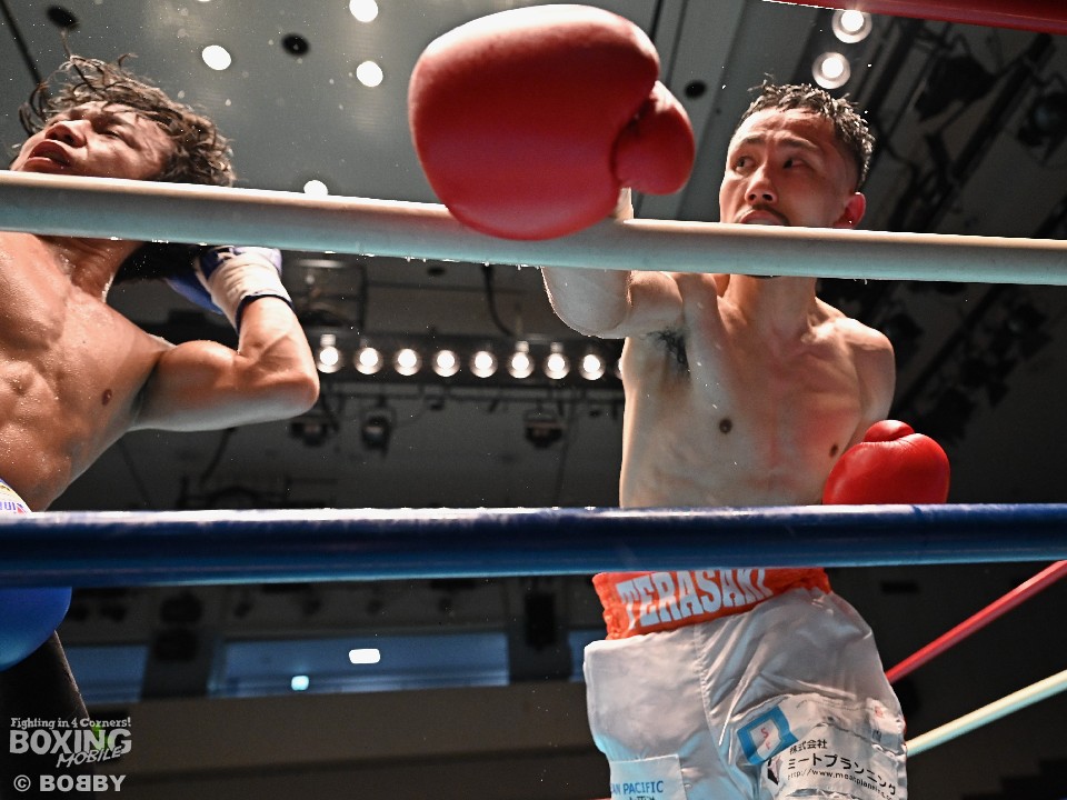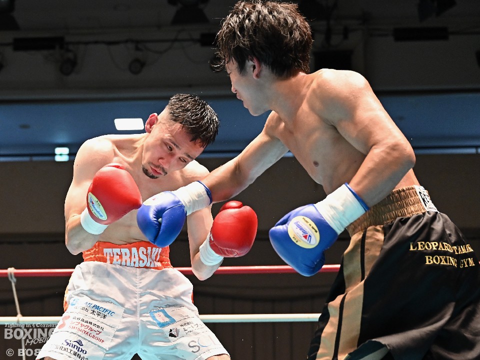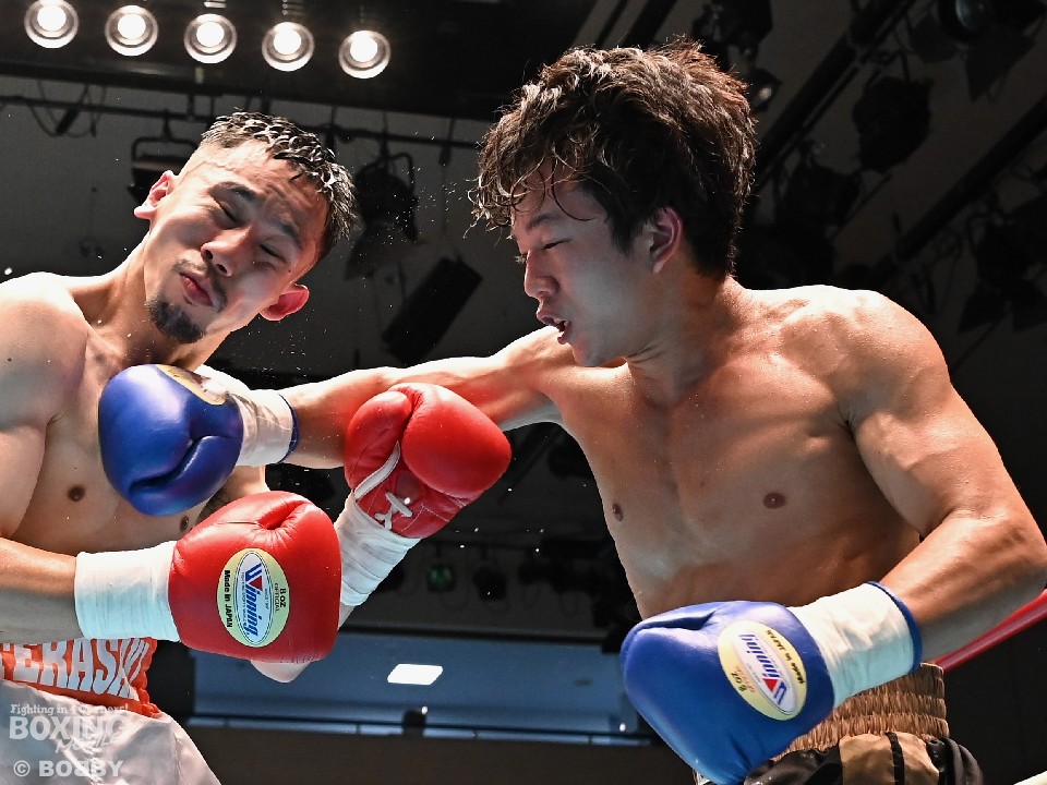 試合:寺崎が上体を振りながらリズムを取ると、右クロスを決めてダウンを演出。再開後も左ボディを軸にじっくりと攻め立てた。2回、永里は右ショートアッパーでバランスを崩させ反撃。寺崎は足を使って立て直しを図った。3回、寺崎はジャブから左のダブルのコンビネーションををヒット。主導権を渡さず。最終4回も左ボディから返しの左フックを決めて粘り強く戦う永里を振り切った。4勝目を挙げた寺崎がB級昇格を決めた。