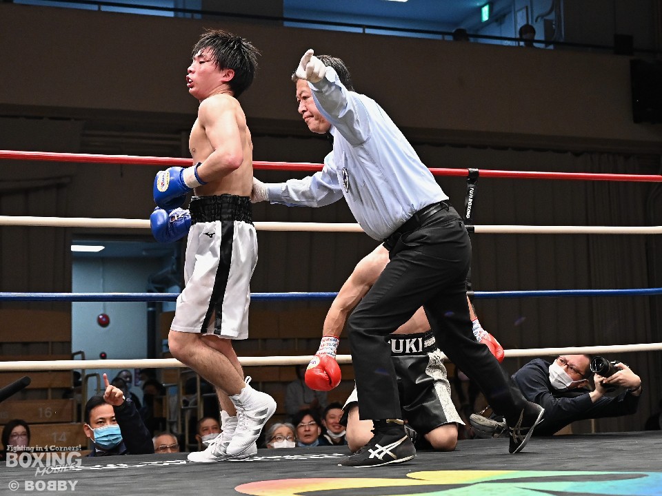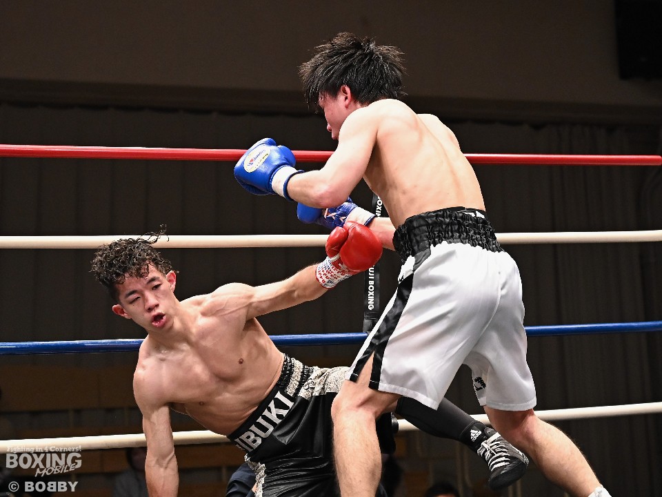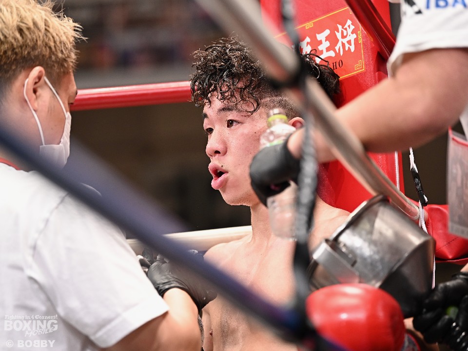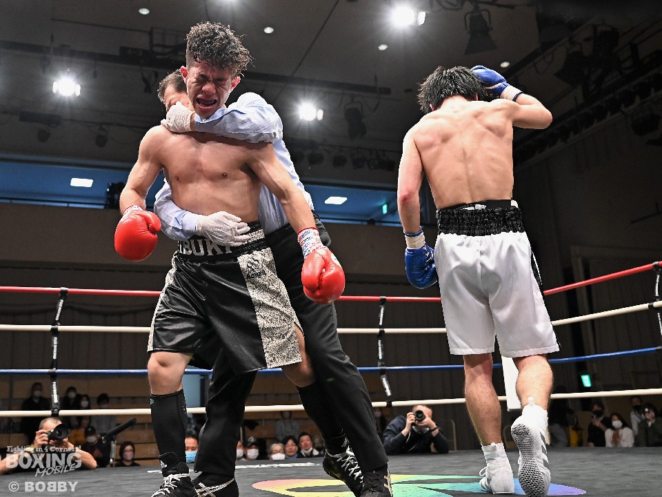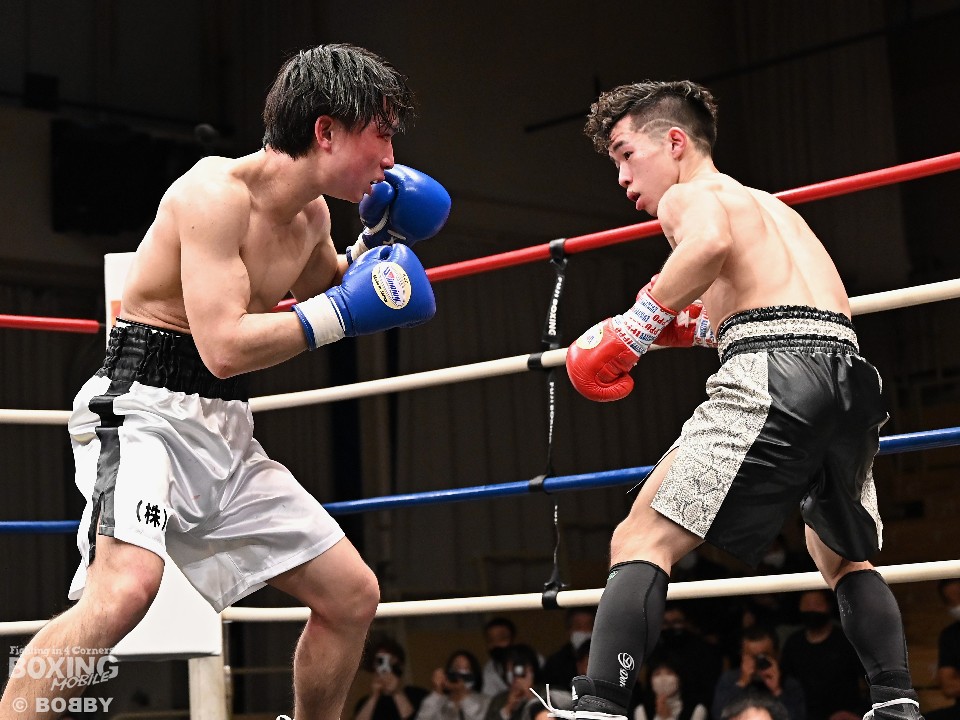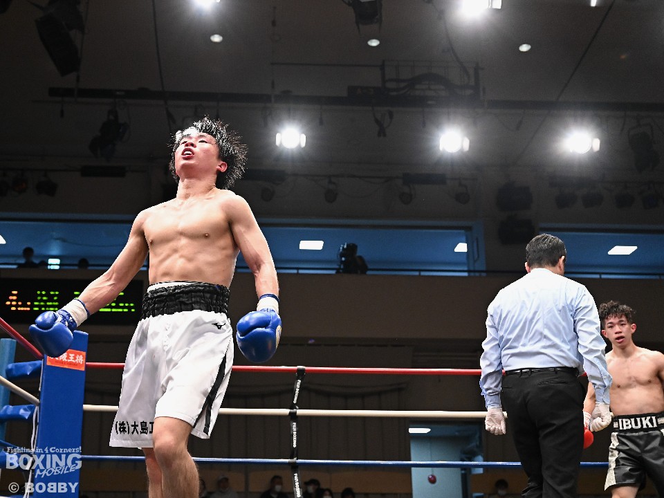 試合:飯野が距離を詰めてワンツー左フックで先制攻撃。しかし、釜石はガードで被弾を回避すると右カウンターを好打。落ち着いた試合運びを見せた。2回、顔面を紅潮させながらも手数を増やす飯野に対し、釜石のカウンターが冴えわたる。右アッパー、左ショートフックを織り交ぜた攻撃で見栄えの良さをアピールした。最終4回、飯野はギアを上げて細かいパンチを繰り出すと右フックを振り抜きダウンを演出。再開後、畳みかけると防戦一方になった釜石を見てレフェリーが割って入った。
