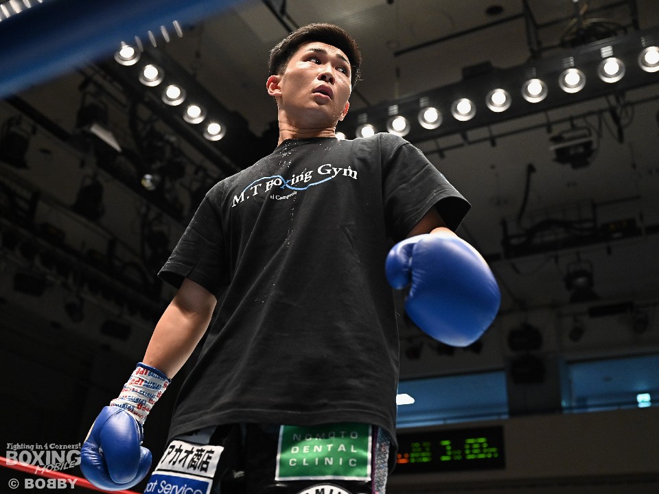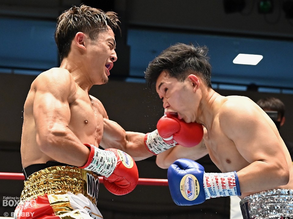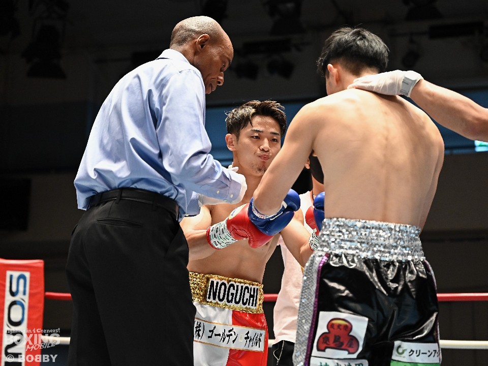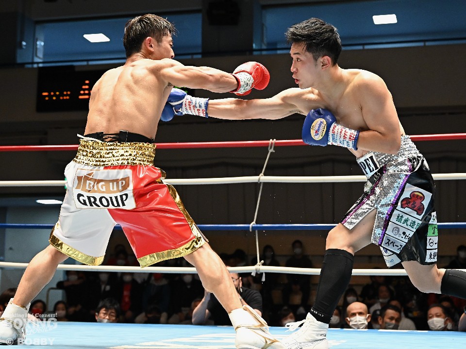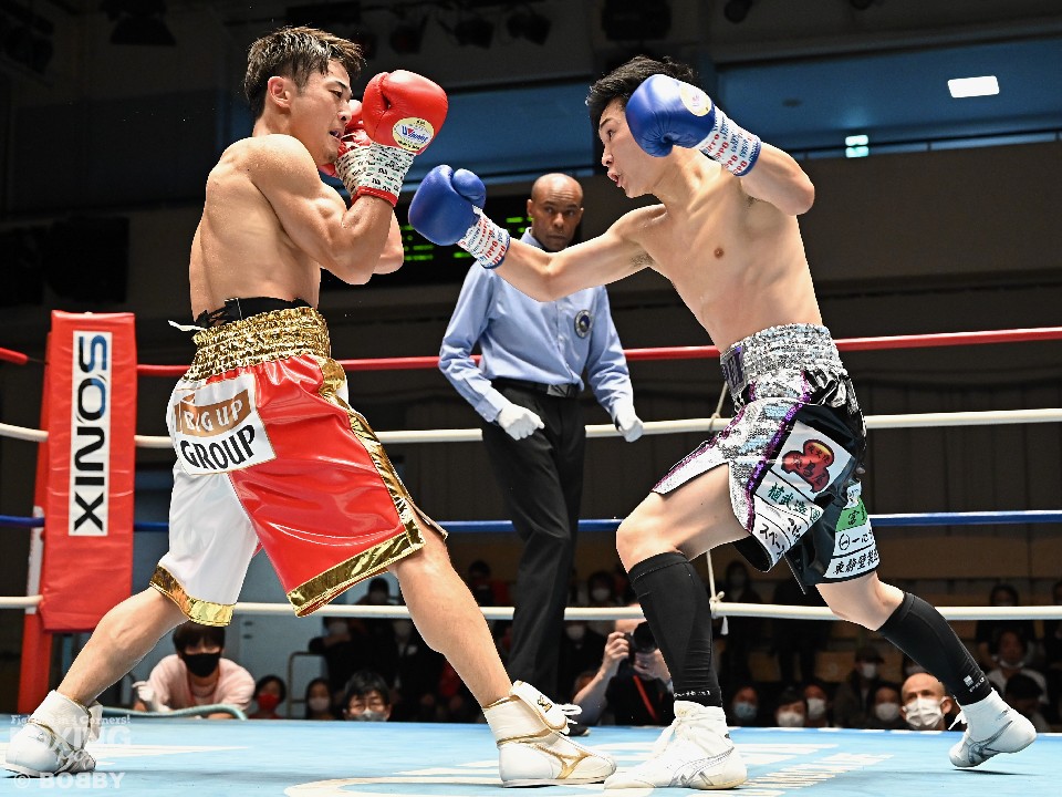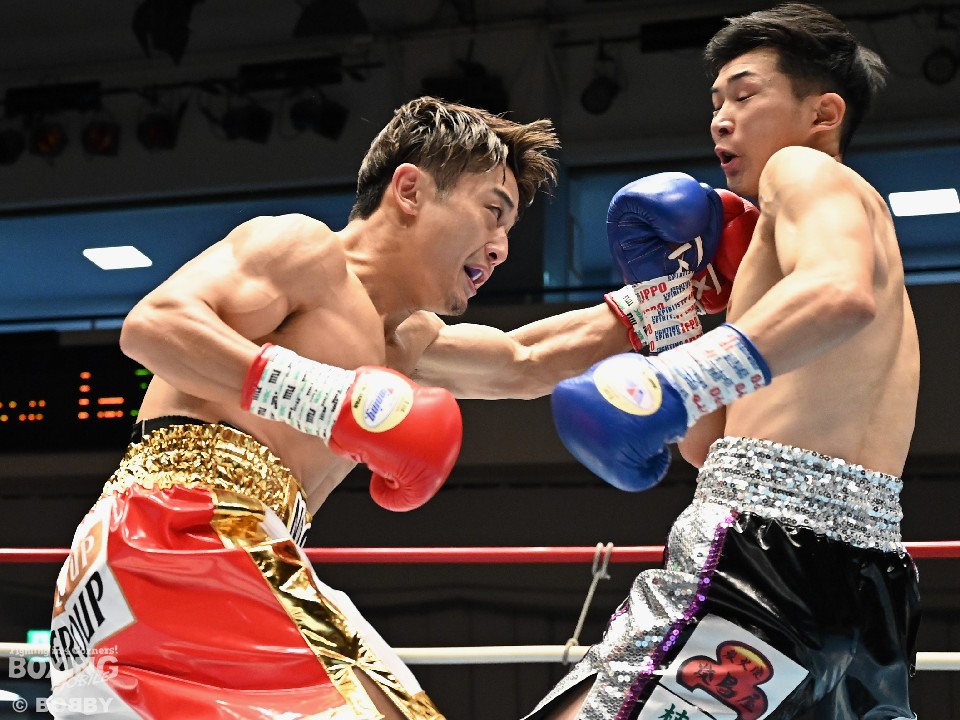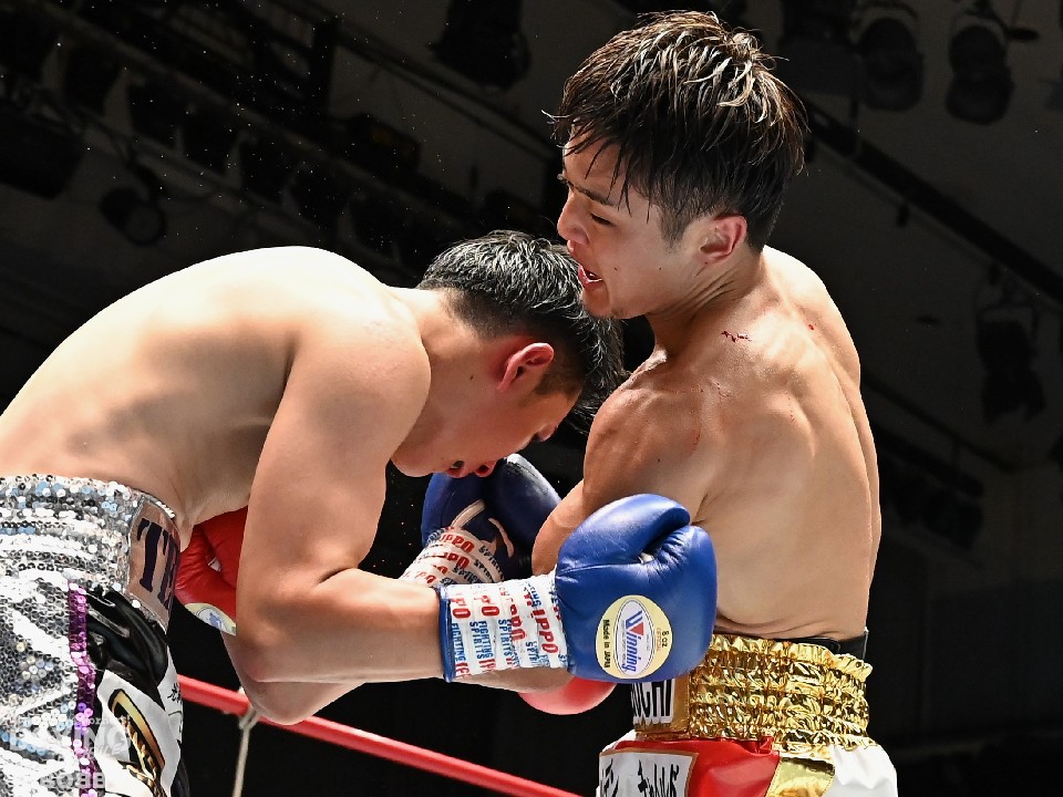 試合:サウスポー篠田が前の手で距離を測りながら左を狙うのに対し、齋藤は右フックを合わせて対抗。2回も篠田は思い切りの良い左スィングで脅かすと単発の左をヒット。流れを変えたい齋藤は3回、打ち終わりに右ストレートを好打。グイグイと前に出る篠田と右カウンターを狙う斉藤の構図が続いた。最終6回、篠田の左が再三ヒット。最後まで倒しに姿勢を見せたが齋藤も粘りを見せてパンチを返した。ジャッジ2者が引き分けとし勝敗がつかなかった。