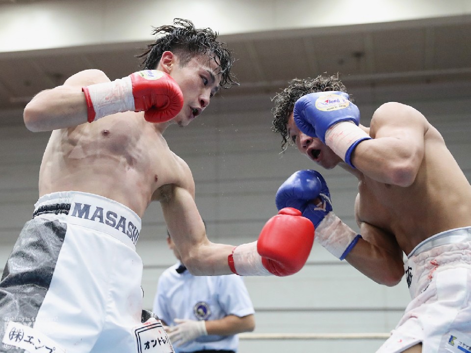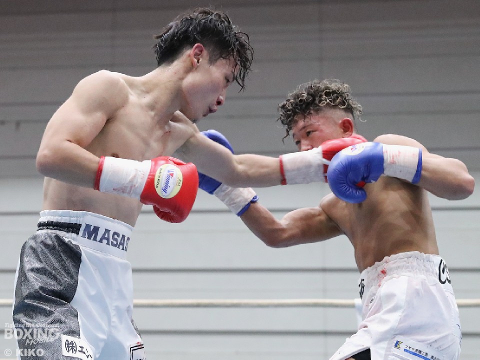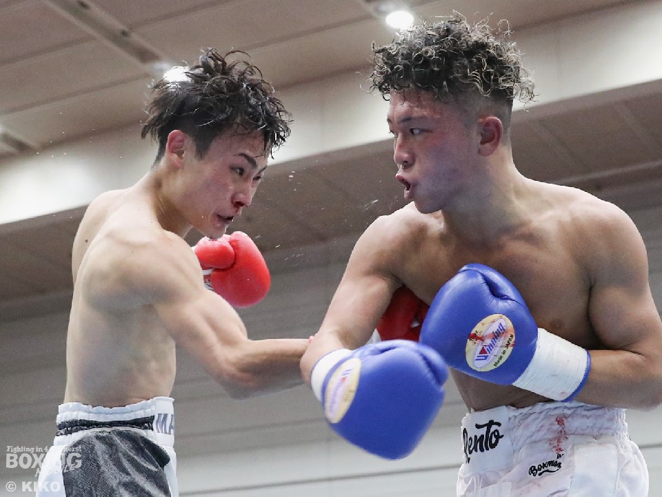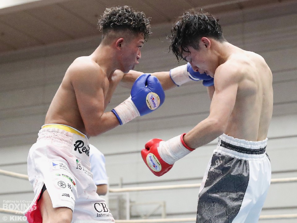試合:宮澤が前後の動きを意識しながらワンツー、ジャブをヒット。池田はジリジリと距離を詰めて右ボディアッパーで体力を削りに行く。2回、宮澤はボディワークで被弾を回避するとジャブから右ストレートにつなげて見栄えの良さをアピール。ラウンド終盤には右フックでガクッと腰を沈めさせて連打を浴びせた。流れを変えたい池田は3回、プレスをかけて左ボディを叩き反撃。続く回もしつこく前進して細かいパンチを繰り出し挽回した。最終5回、激しいパンチの応酬。真っ向から意地がぶつかり合った。ジャッジに委ねられた採点は2者が池田を支持。序盤の劣勢を跳ね返した池田が勝利を掴んだ。